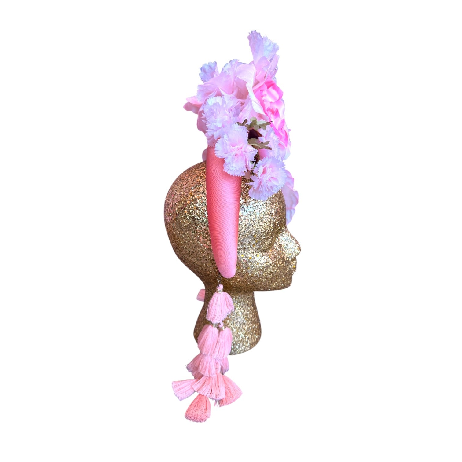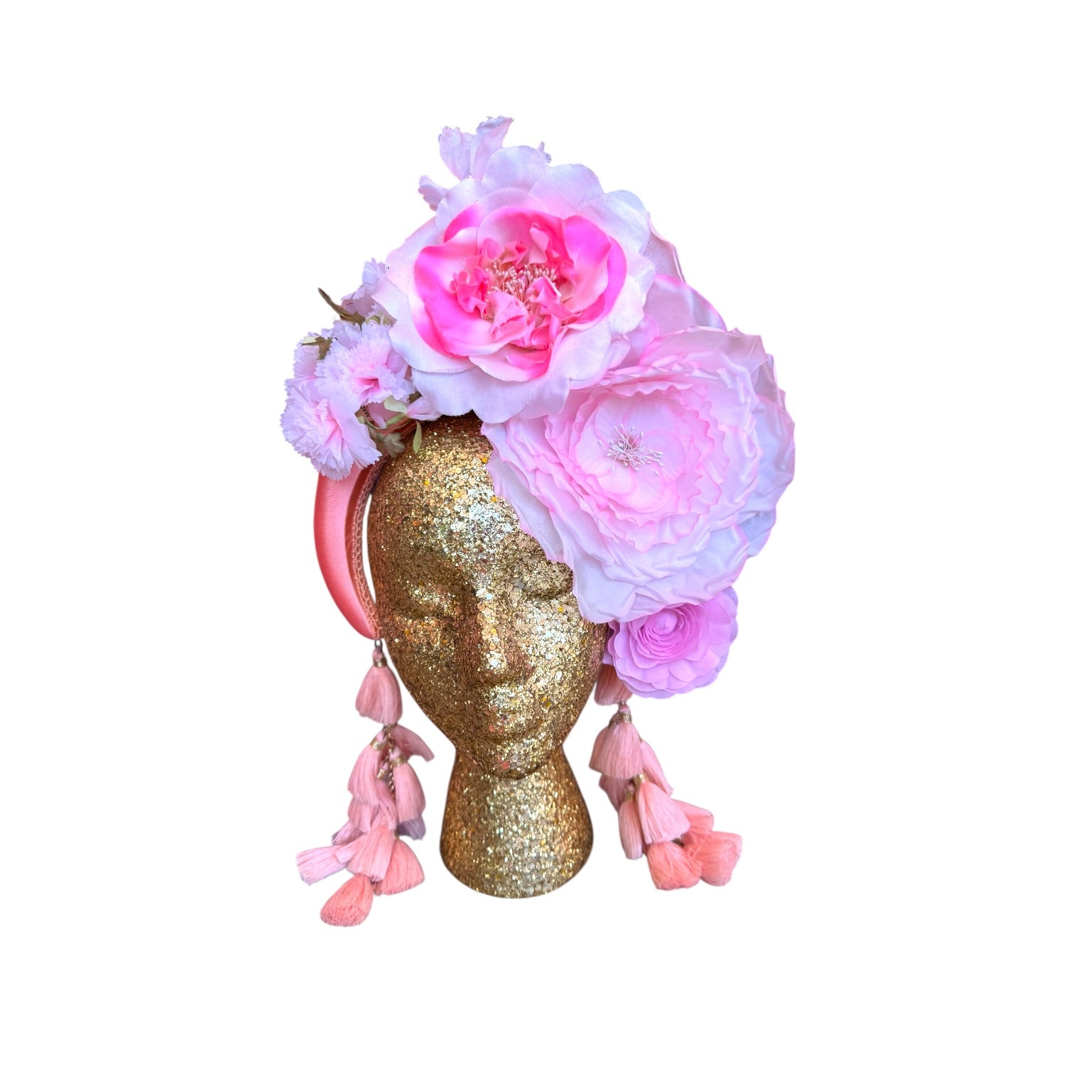 THIS PINK FLORAL COUTURE HEADPIECE IS A WEARABLE WORK OF ART, DESIGNED TO TURN HEADS AND SPARK JOY.