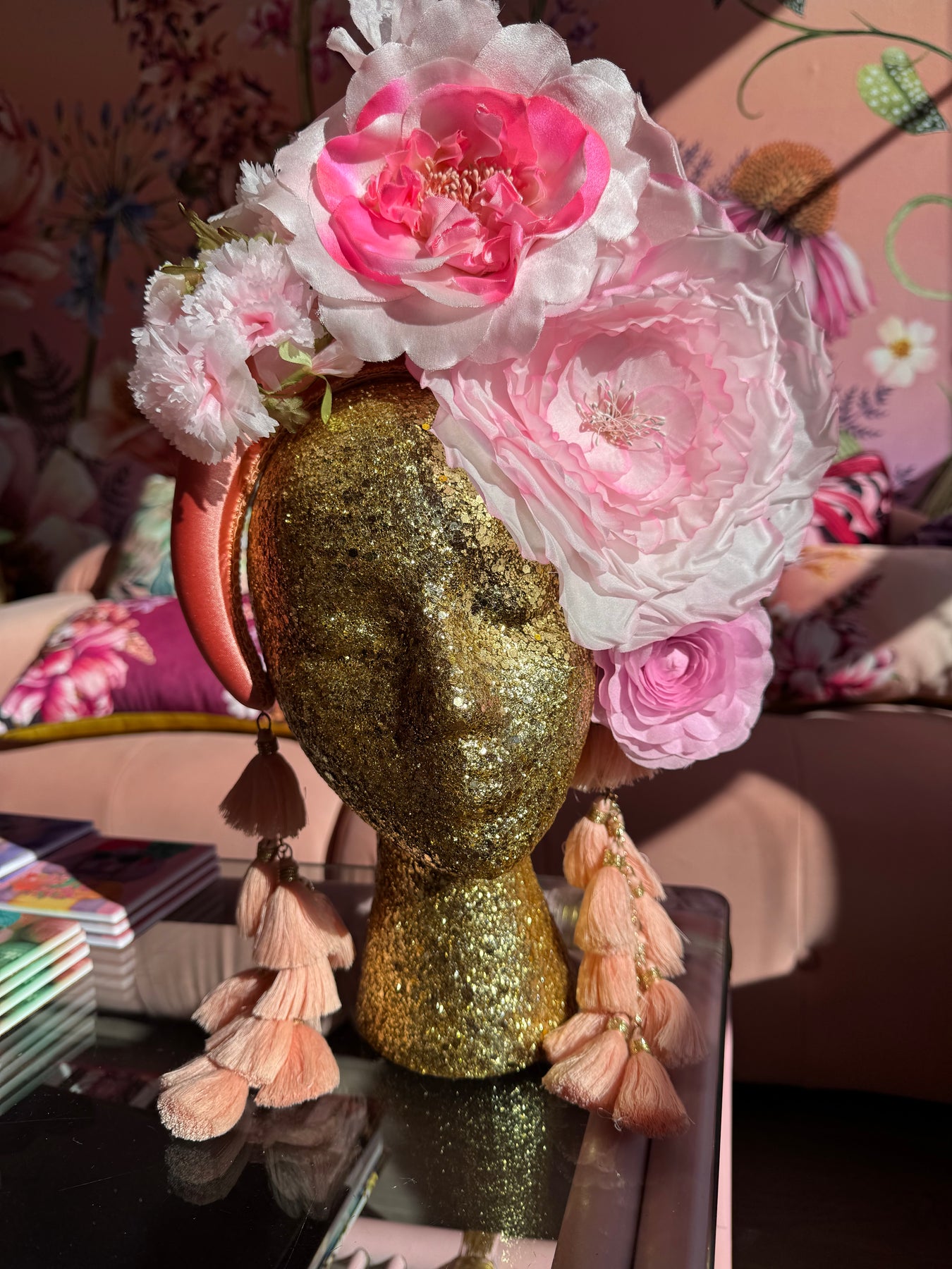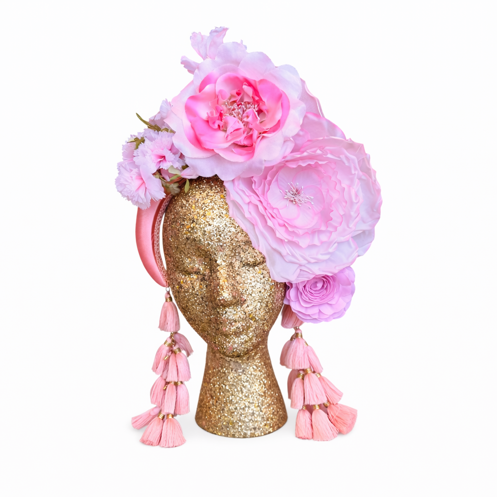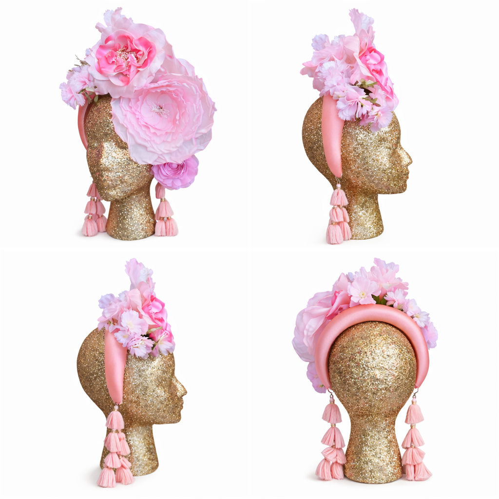 HAND-ASSEMBLED WITH LUXE LAYERED BLOOMS IN SOFT BLUSH AND PETAL PINK, THIS SCULPTURAL HEADPIECE IS FINISHED WITH HANDMADE TASSELS FOR EXTRA MOVEMENT, GLAMOUR AND DRAMA.