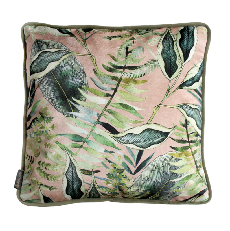 Give your interior space an update with this gorgeously hand painted tropical design. The blush pink background offset the leaves with a pretty & modern twist. Think jungle canopy at sunset, printed onto the beautifully soft velvet, giving your space an instant accent piece!