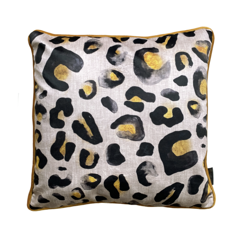 Add a touch of leopard print to your interior with the natural leo velvet cushion. The hand painted watercolour leopard spots work beautifully on the soft shimmer velvet. Trimmed with black velvet piping and mustard velvet reverse, these cushions are a versatile accessory and sure to be a focal point in the home.