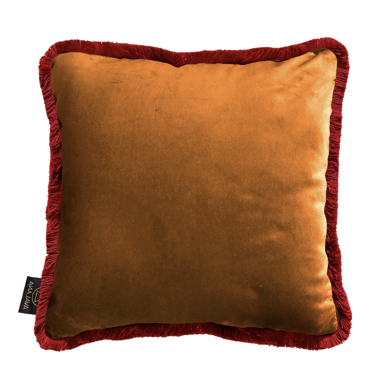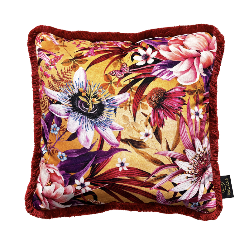 In homage to the Avalana Taxi of Summer 2024 – this cushion cover is bursting with bountiful blooms. Peonies, passion flowers and plumes of foliage cascade across the fabric and look stunning on the rich golden velvet background. Finished with crimson brush fringe.
