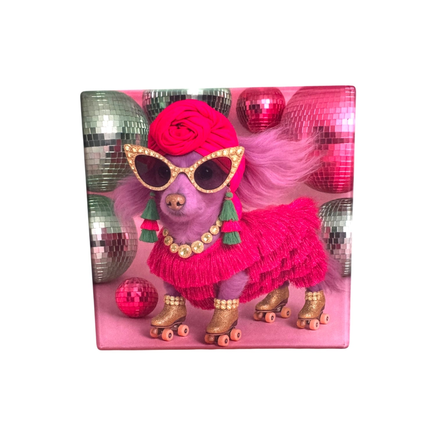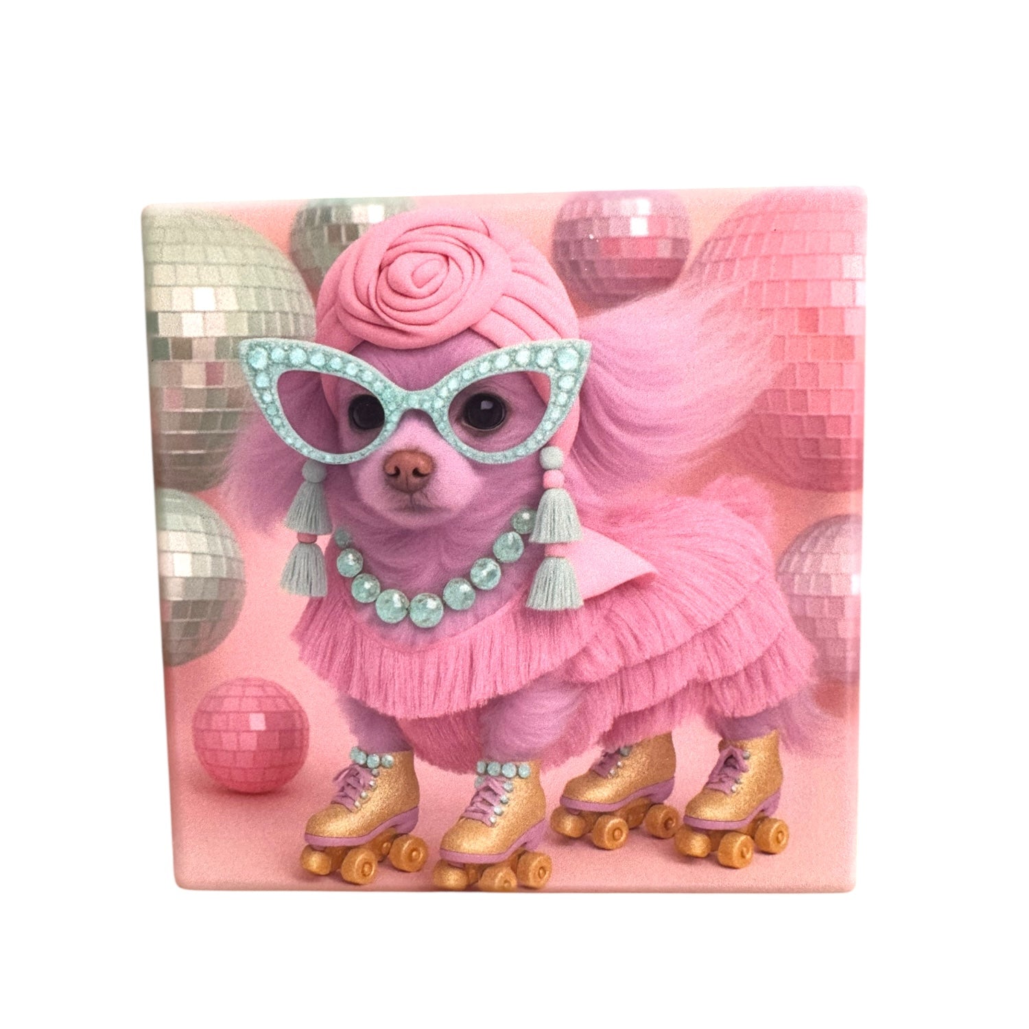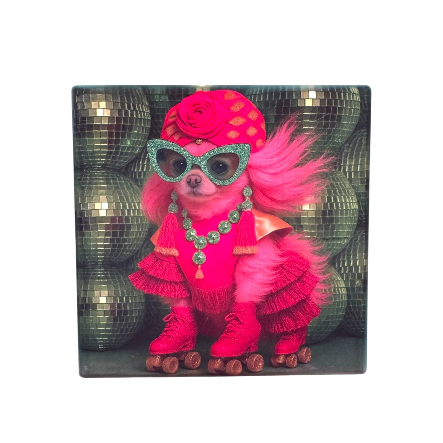 Featuring our decadent existing menagerie of couture pets and fabulous fauna, these ceramic drink coasters transform any tabletop into a glitter-soaked, tongue-in-cheek paradise. From martini-sipping Palm Beach queens to neon-drenched Miami muses, Hollywood-ready LA glamazons, and dazzling roller-skating disco darlings, each creature brings attitude, elegance, and just the right amount of mischief.