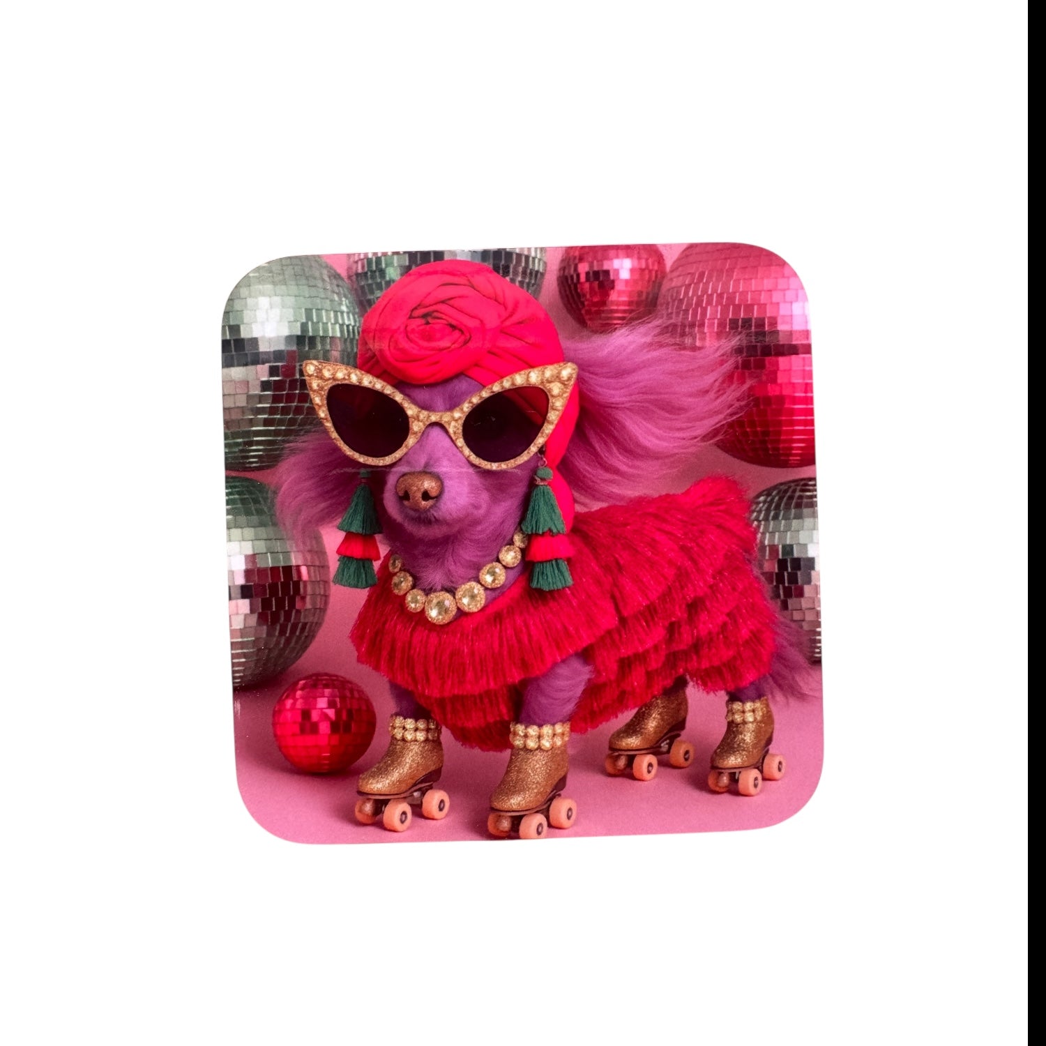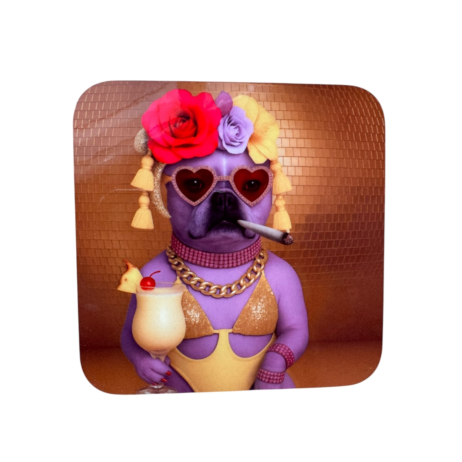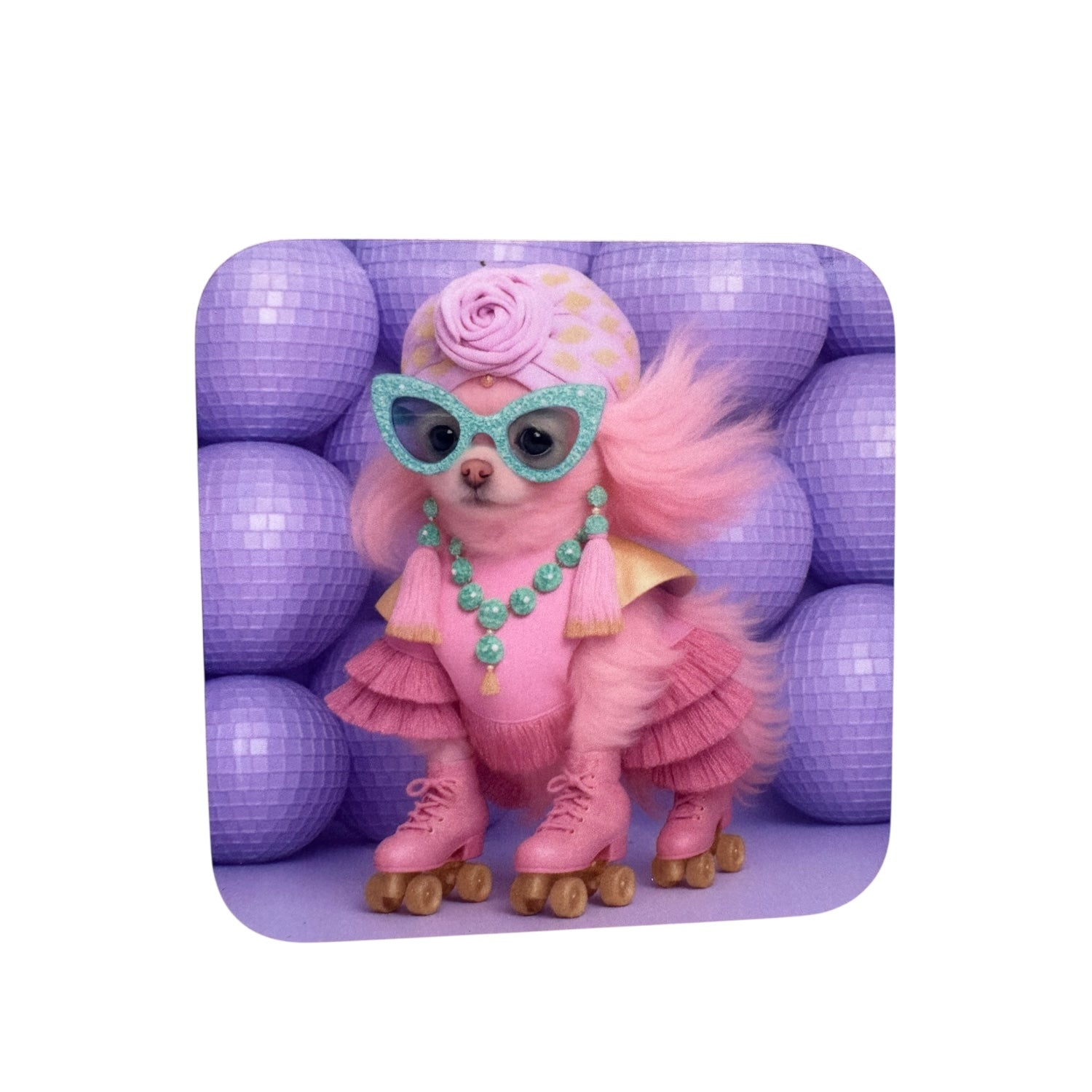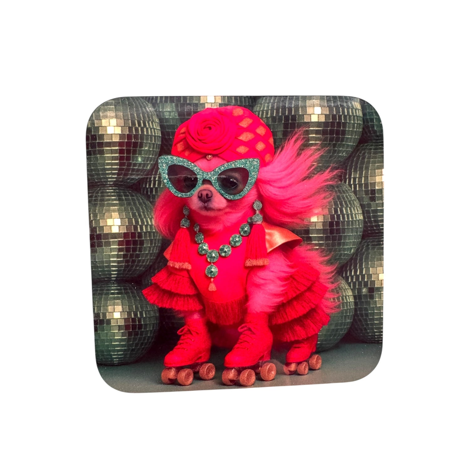 Featuring our decadent existing menagerie of couture pets and fabulous fauna, these ceramic drink coasters transform any tabletop into a glitter-soaked, tongue-in-cheek paradise. From martini-sipping Palm Beach queens to neon-drenched Miami muses, Hollywood-ready LA glamazons, and dazzling roller-skating disco darlings, each creature brings attitude, elegance, and just the right amount of mischief.