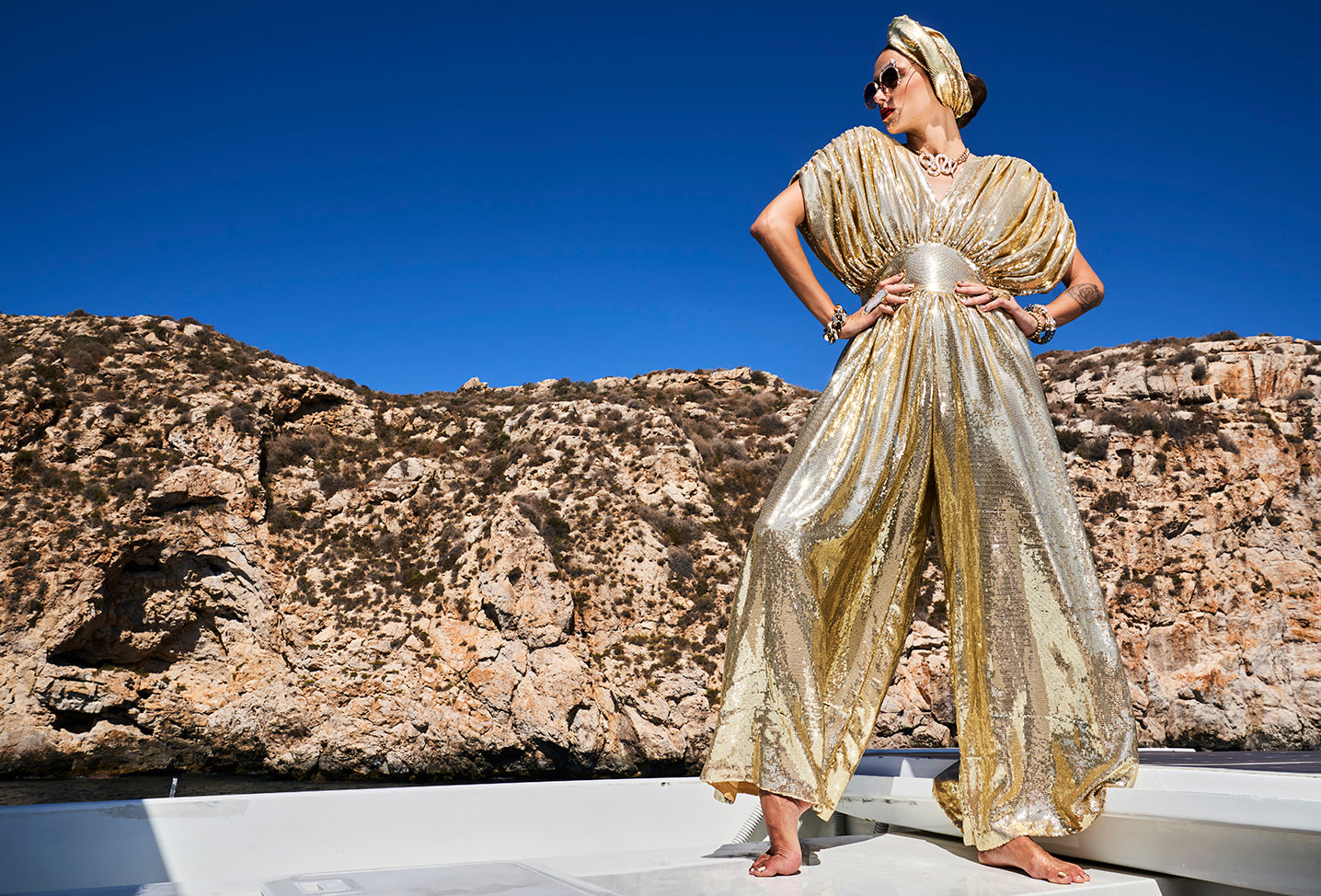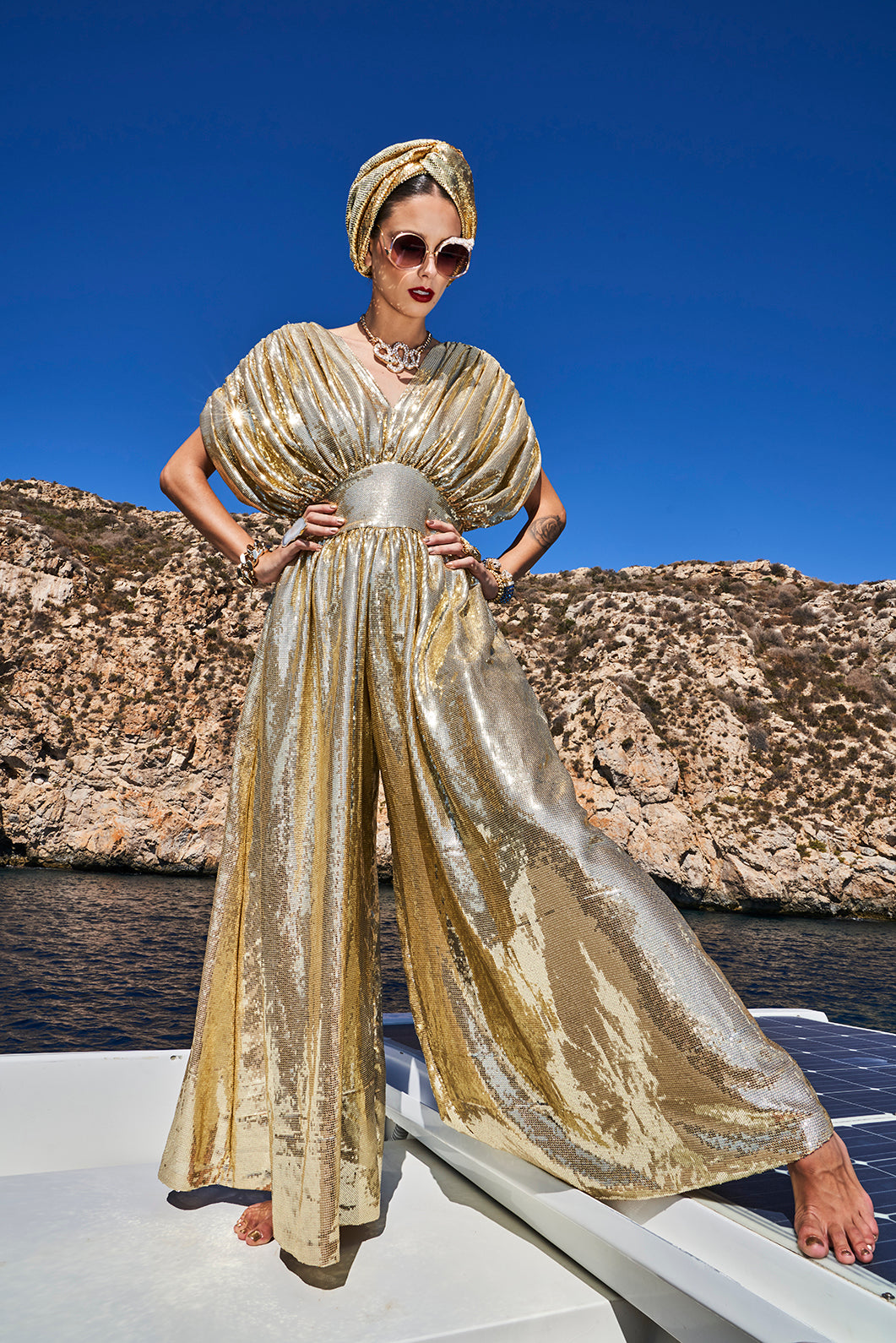 The Gloria Ruby Jumpsuit is just HOT! I matched this outfit with the Zia Golden Copper Dorado Turban and golden tassels and gold jewellery. I felt like a movie star, which I think we all feel like when wearing a JC design.