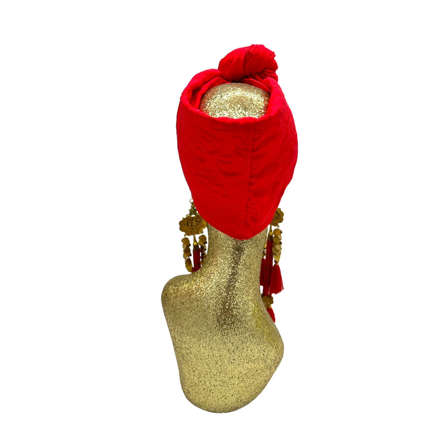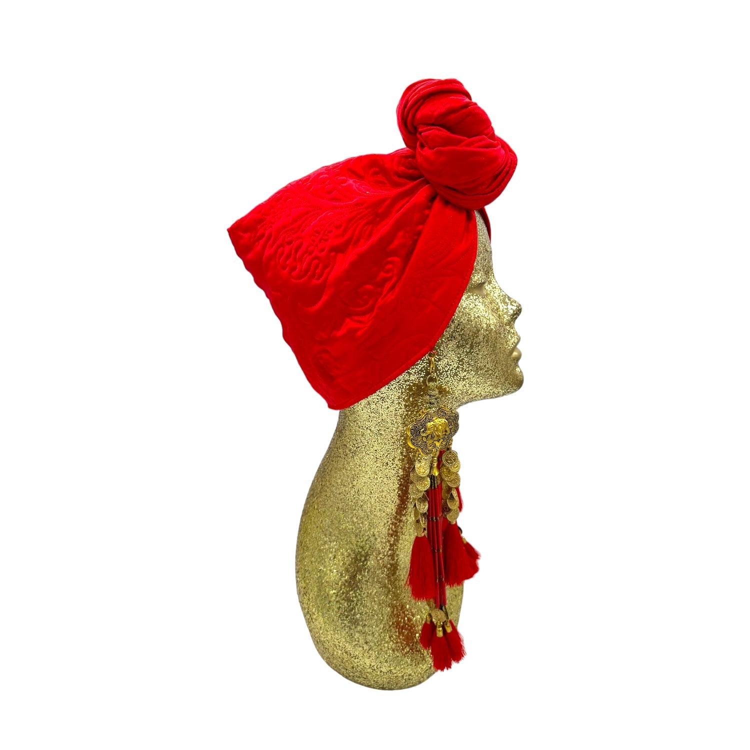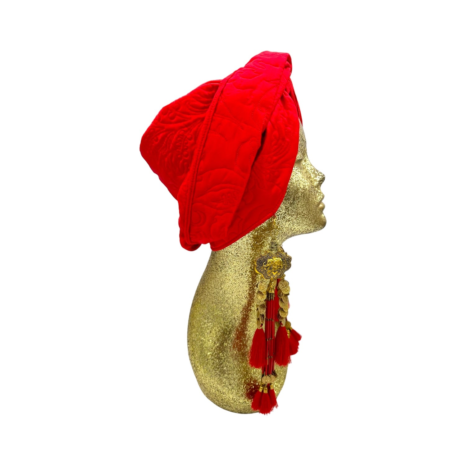 Ultra glam in this limited edition double sided quilted vintage Italian silk turban. A simple twist and instant glam. The hand made earrings are removable. Made with love in Los Angeles. Made of fabulous embroidered silk satin. One size fabulously fits all. Dry clean only.