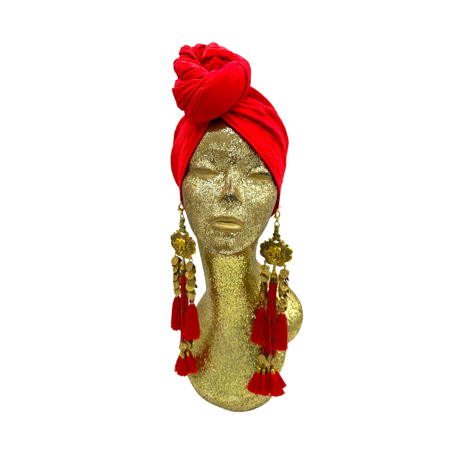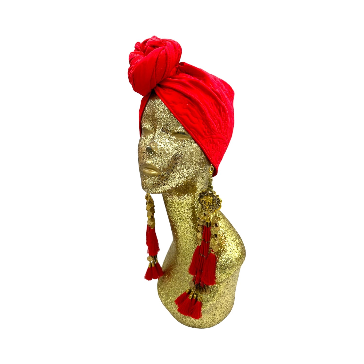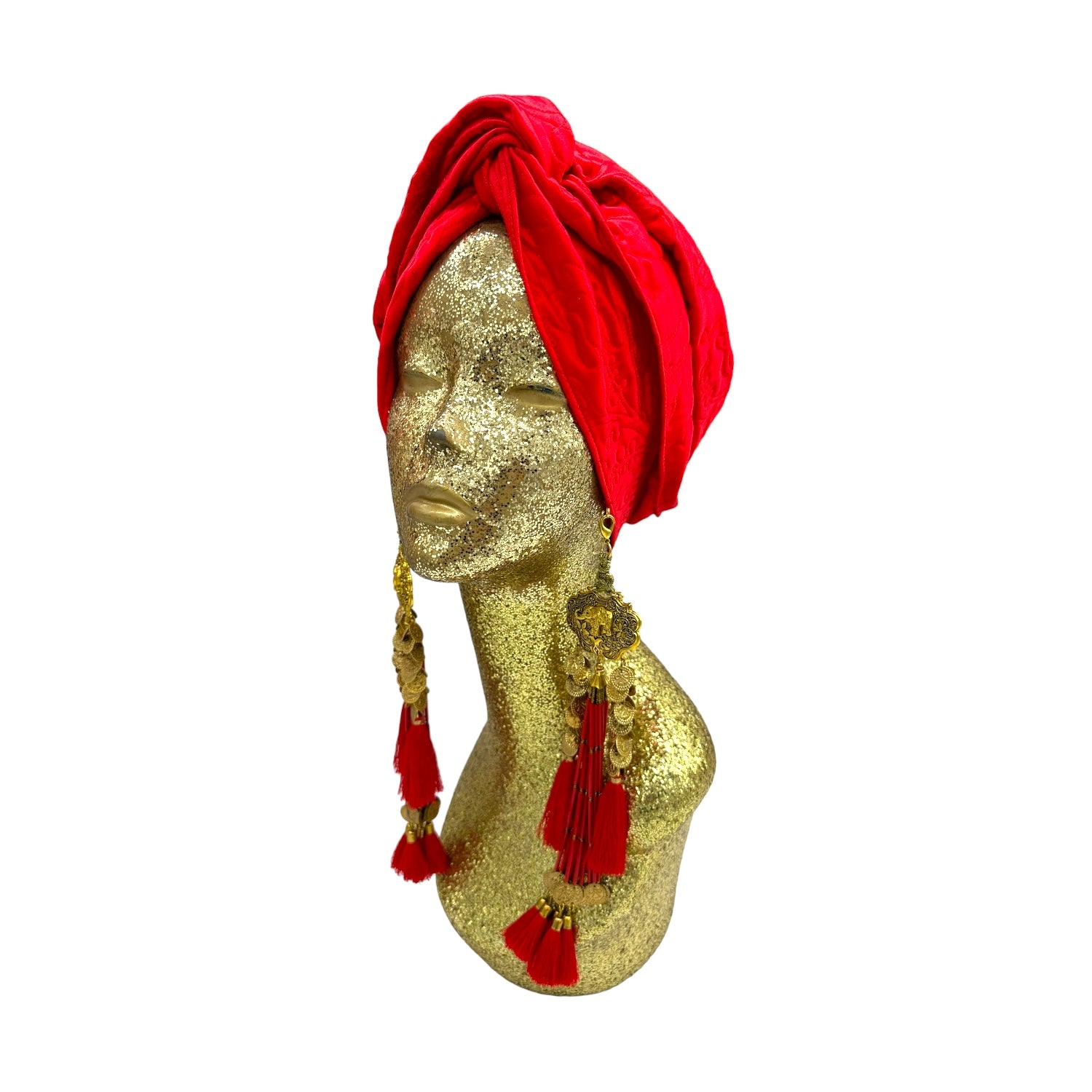 The Gloria Ruby Jumpsuit is just HOT! I matched this outfit with the Zia Golden Copper Dorado Turban and golden tassels and gold jewellery. I felt like a movie star, which I think we all feel like when wearing a JC design.