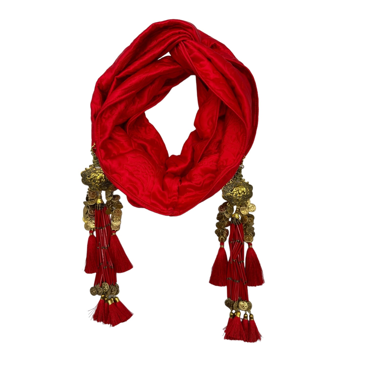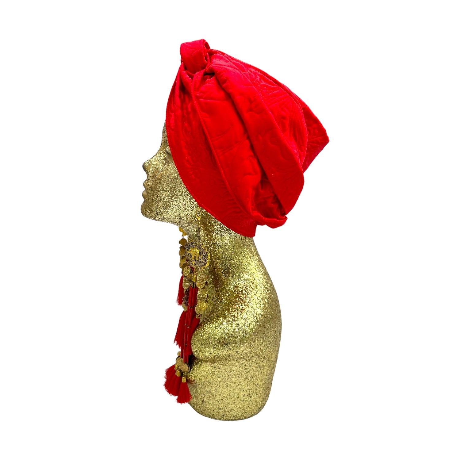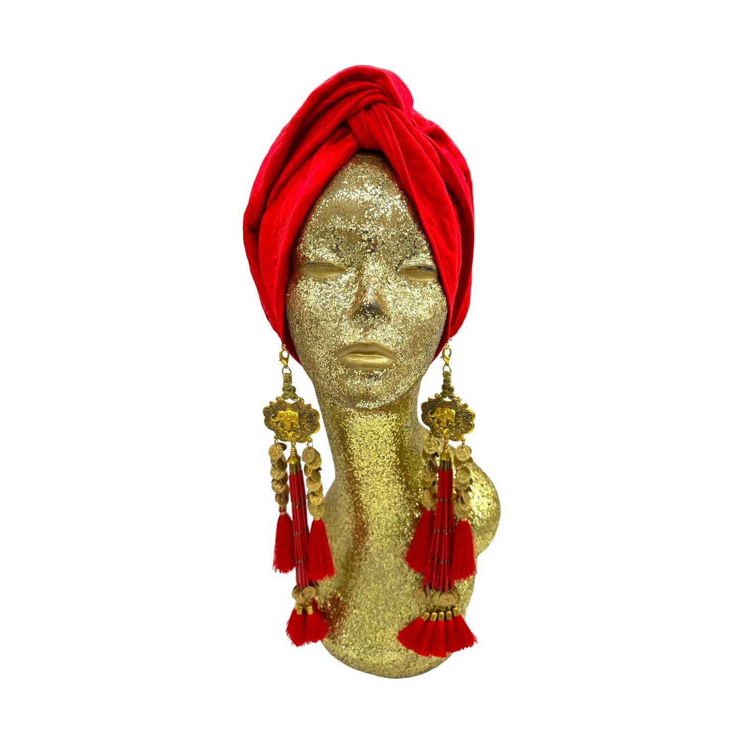 The Gloria Ruby Jumpsuit is just HOT! I matched this outfit with the Zia Golden Copper Dorado Turban and golden tassels and gold jewellery. I felt like a movie star, which I think we all feel like when wearing a JC design.