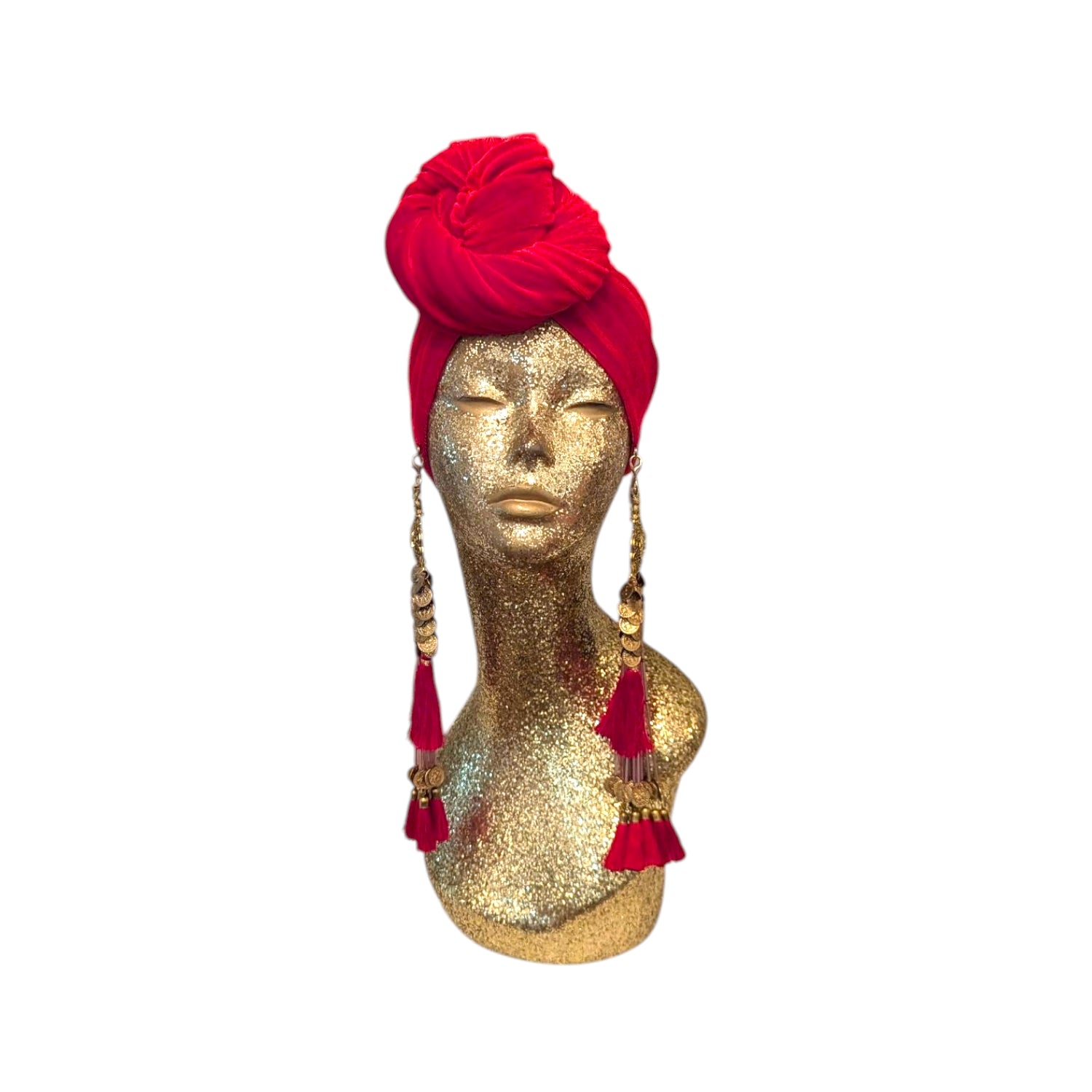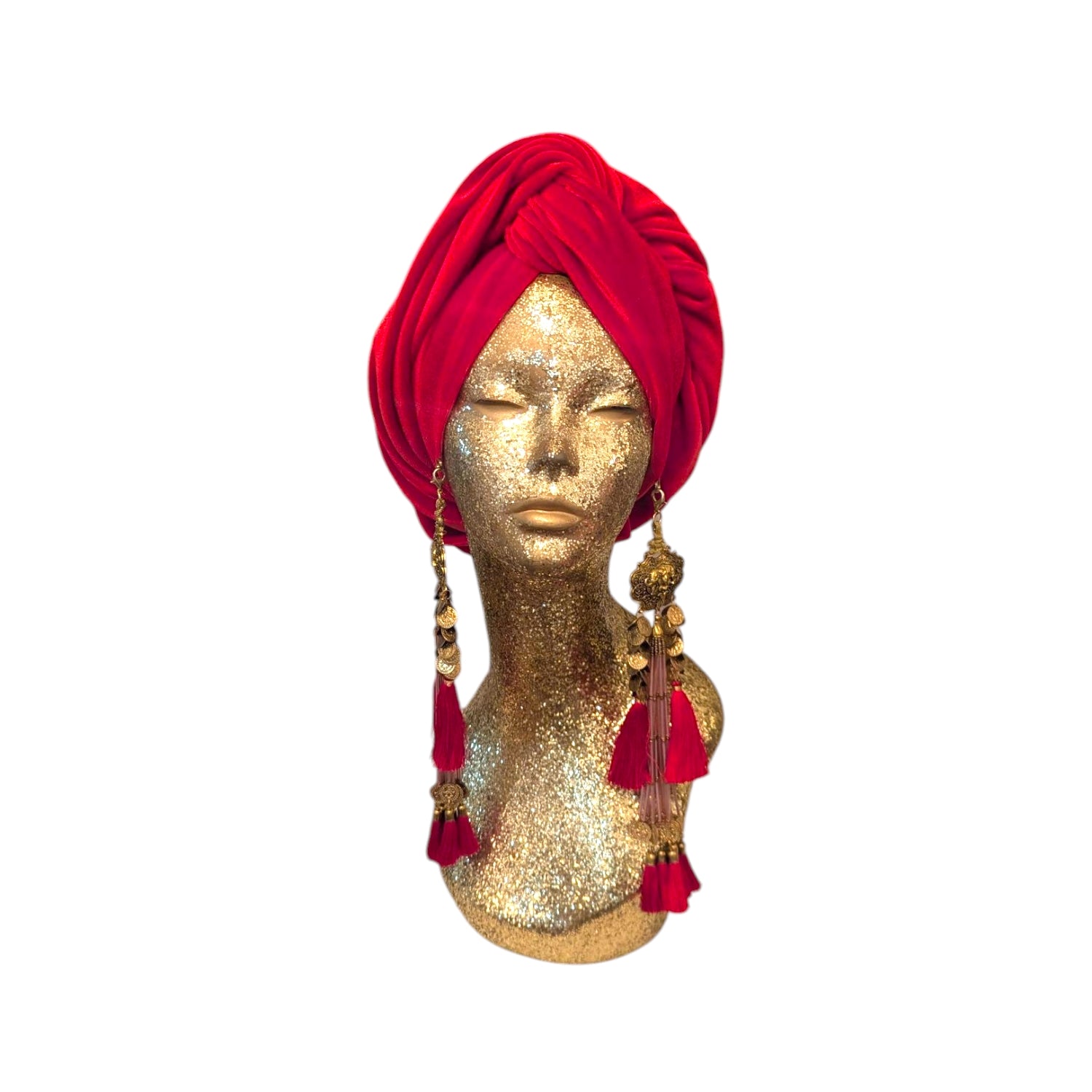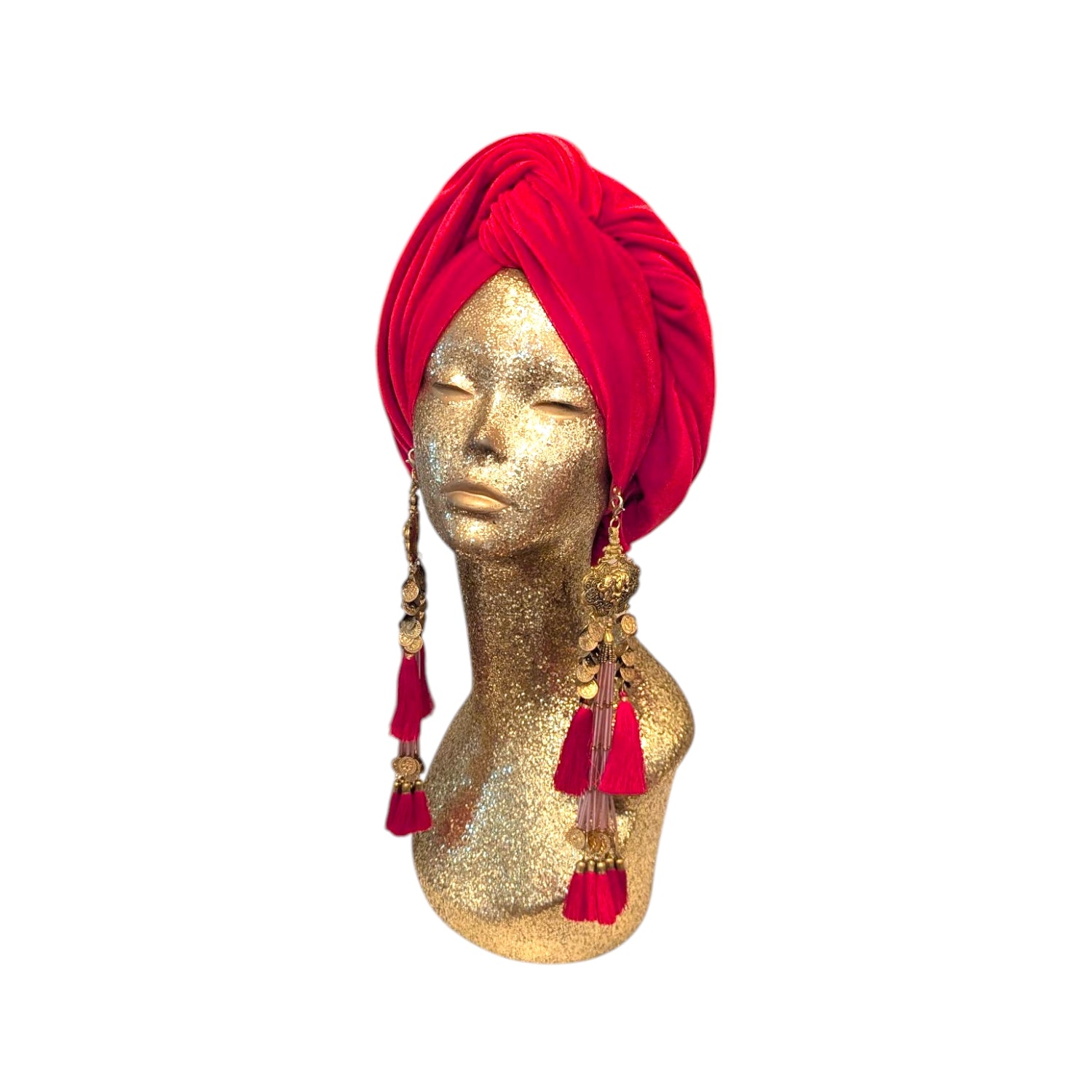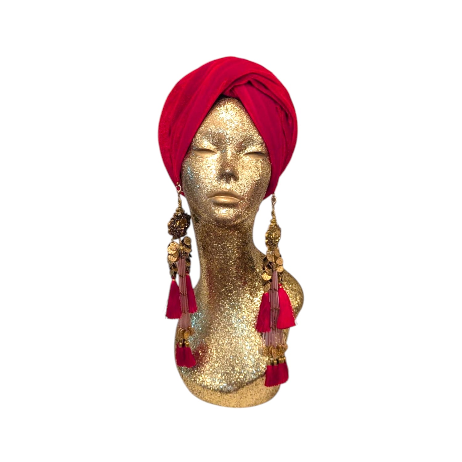 The Julia Clancey Turban is the epitome of glamour and timelessness. Inspired by Old Hollywood, this turban instantly add glamour to any outfit. It is designed to fit all head sizes and features removable tassel earrings, giving you the freedom to customize your look. This turban is made with care in Los Angeles, guaranteeing its quality. Get ready to turn heads with this stunning accessory.