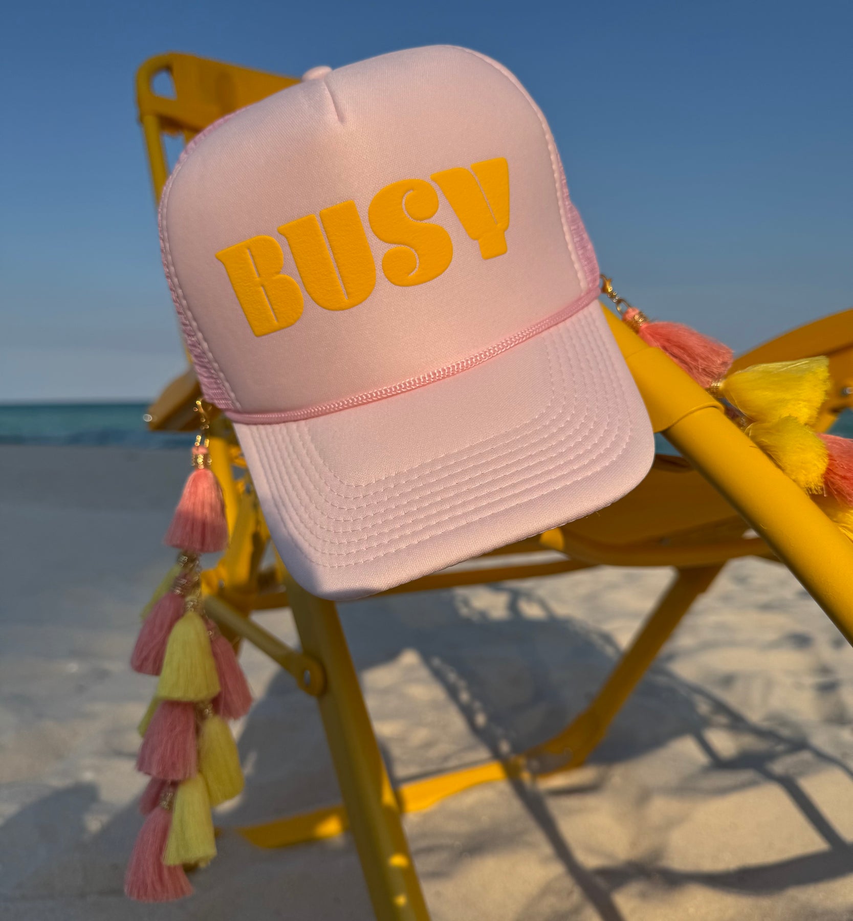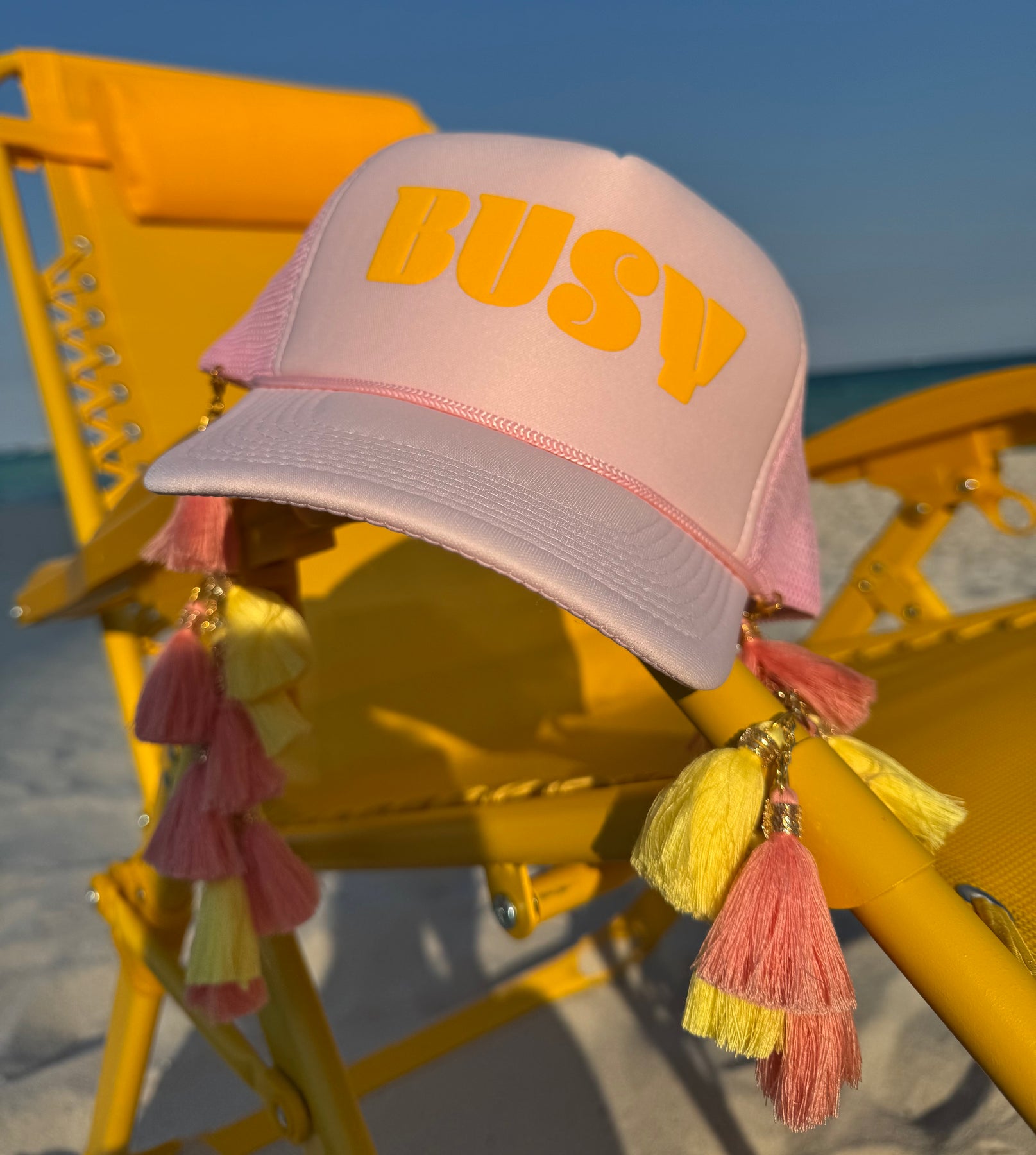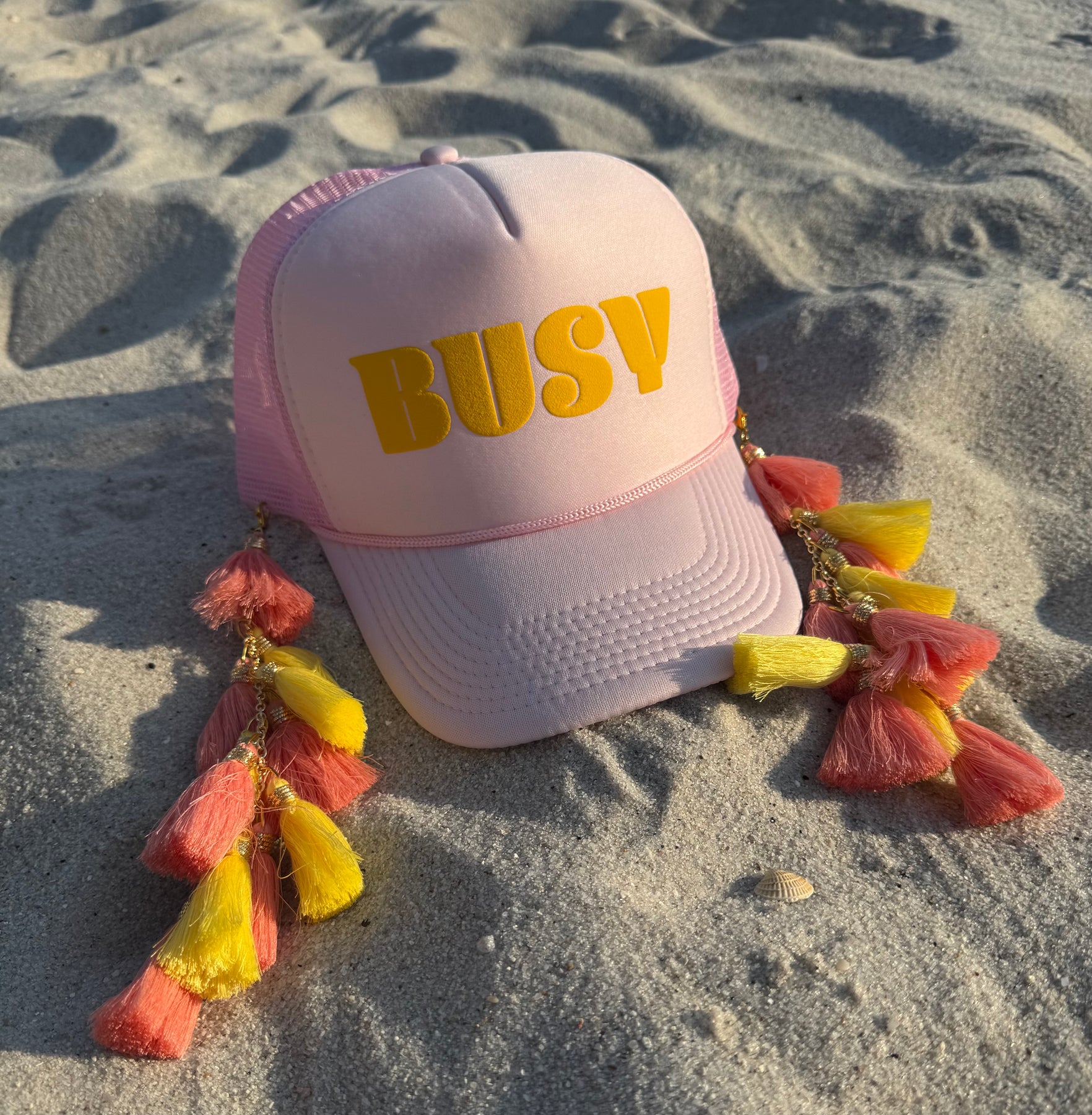 TURN UP THE FUN WITH OUR TASSELTASTIC BUSY TASSEL TRUCKER CAP — A STATEMENT, EVERYDAY CAP DESIGNED TO BRING A LITTLE DISCO ENERGY TO ANY LOOK.
