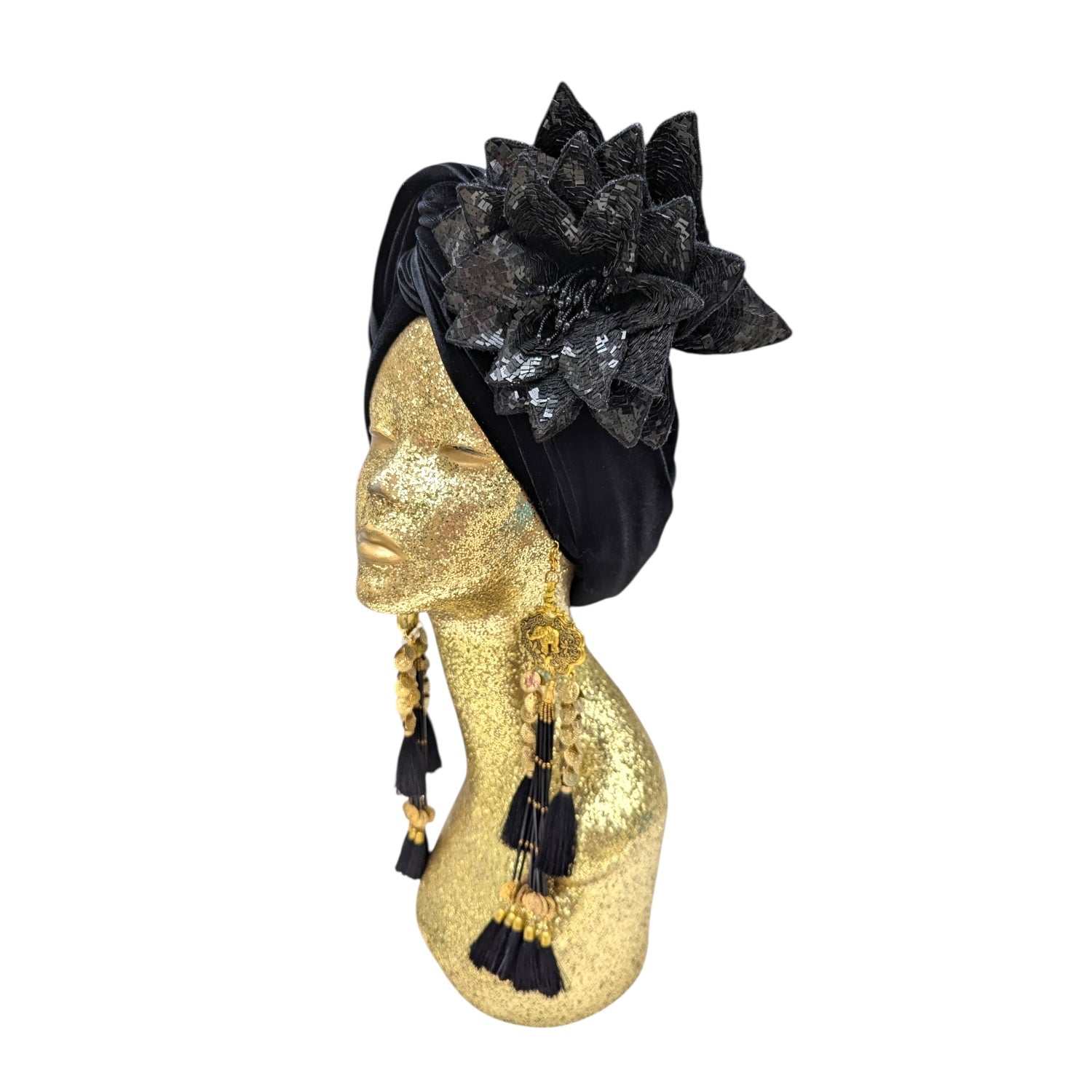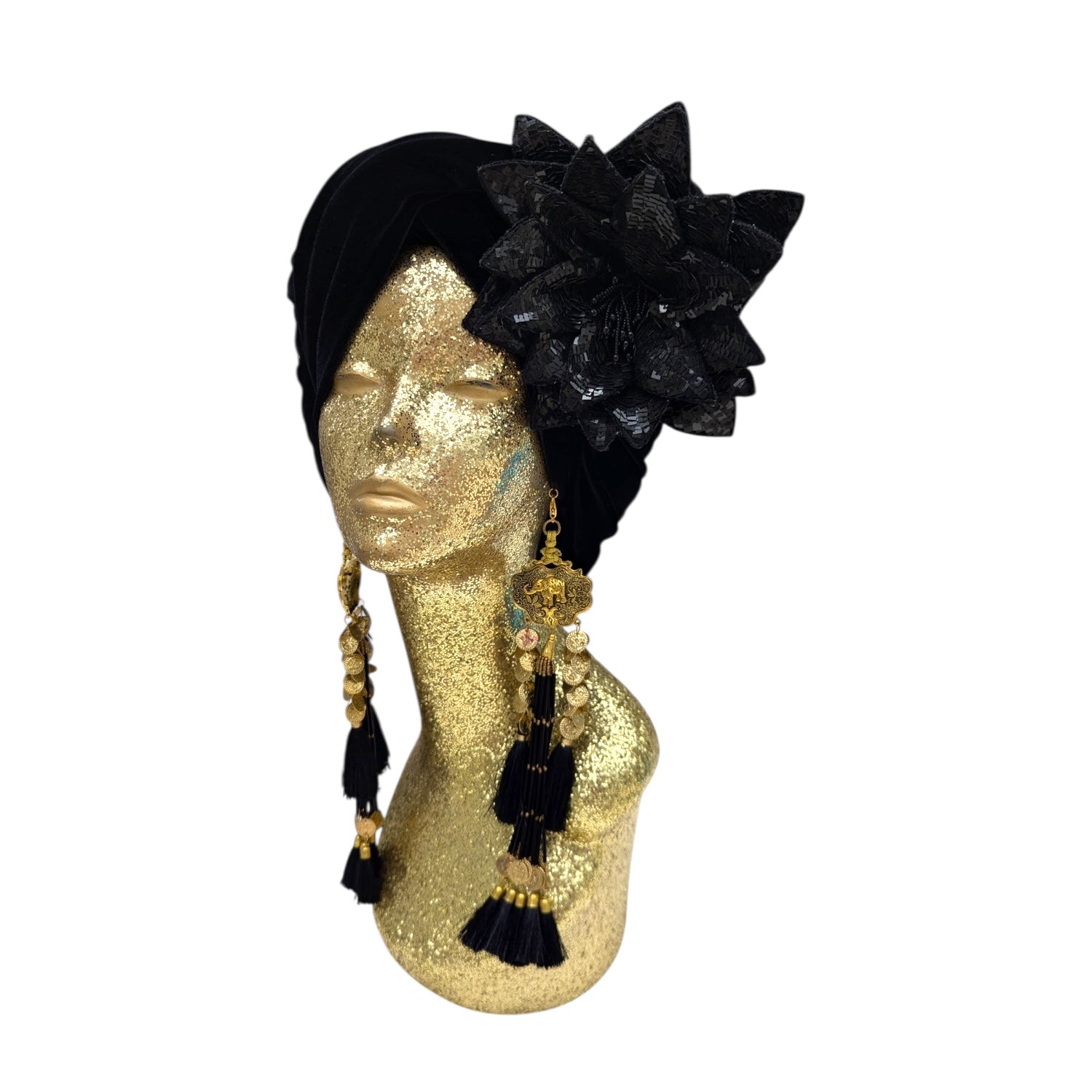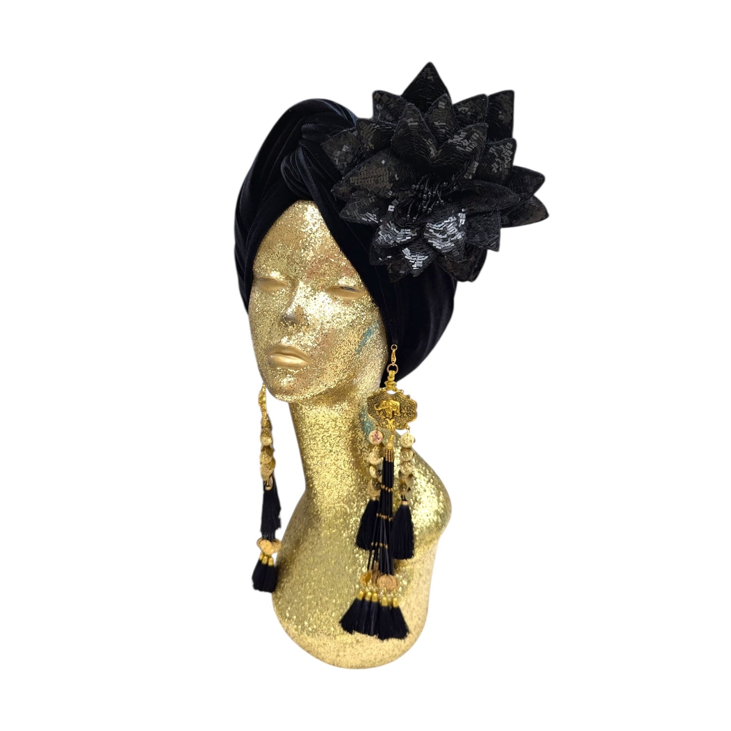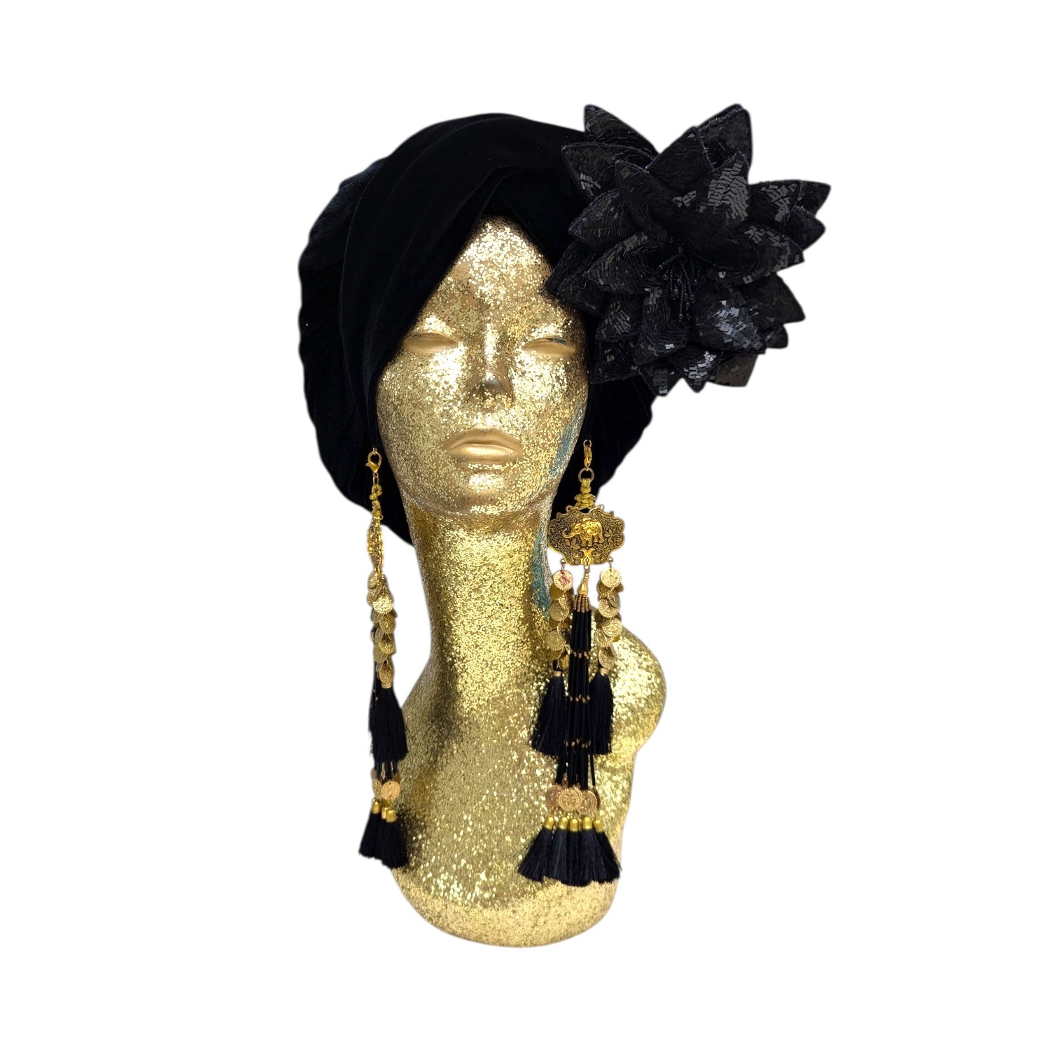 Wear it on your turban or style in your hair or clothing .This Classic Madam style offering full glamour coverage in soft velour teamed with hand made cotton earrings. Soft enough to pop inside the turban should you wish to wear without. The earrings are made by artisans in India and turbans made locally in Los Angeles. This is a direct to consumer product.
