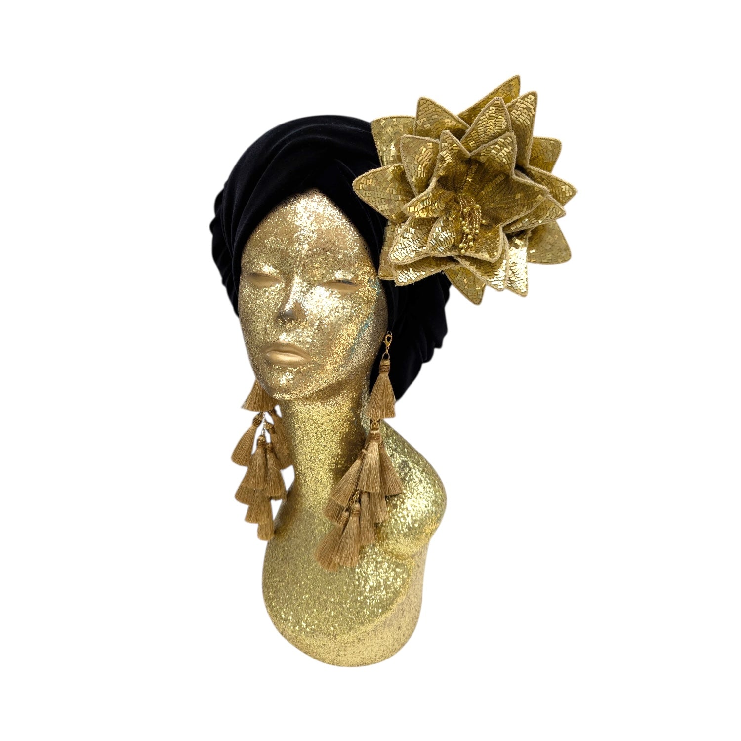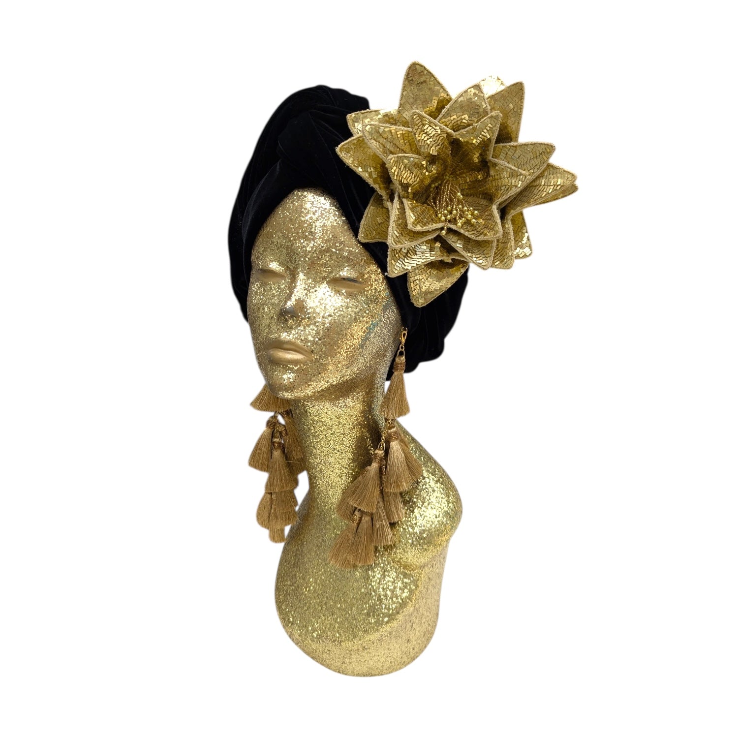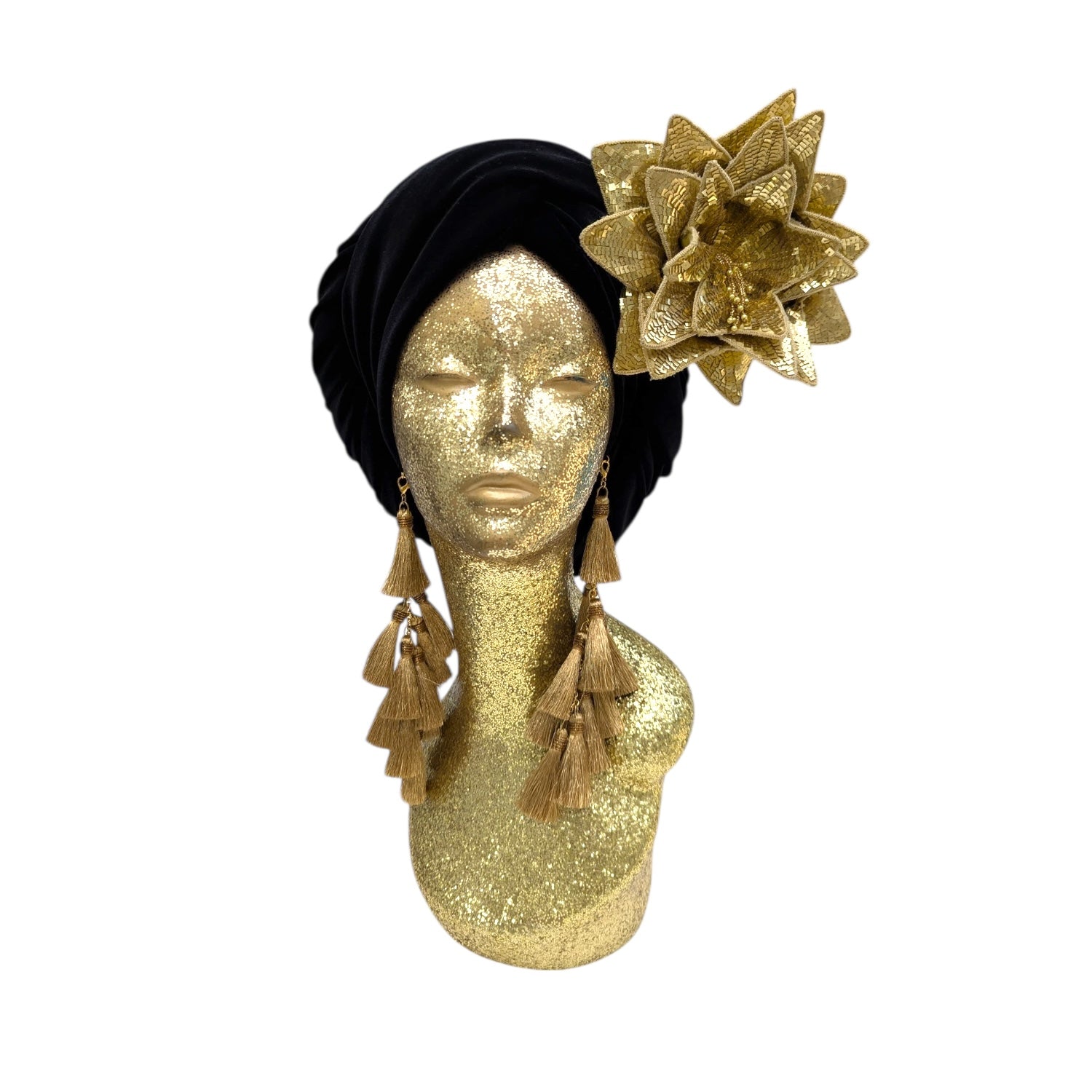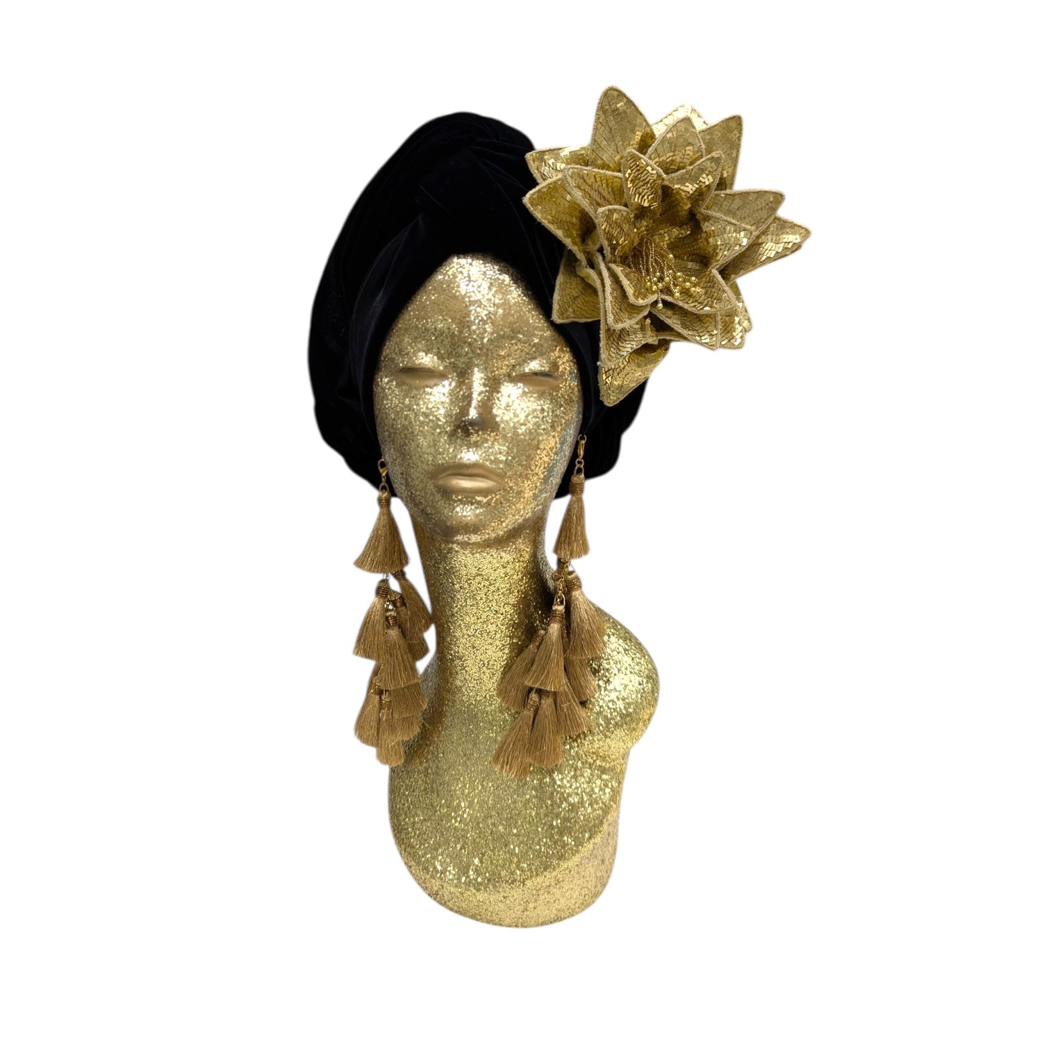 Wear it on your turban or style in your hair or clothing .This Classic Madam style offering full glamour coverage in soft velour teamed with hand made cotton earrings. Soft enough to pop inside the turban should you wish to wear without. The earrings are made by artisans in India and turbans made locally in Los Angeles. This is a direct to consumer product.
