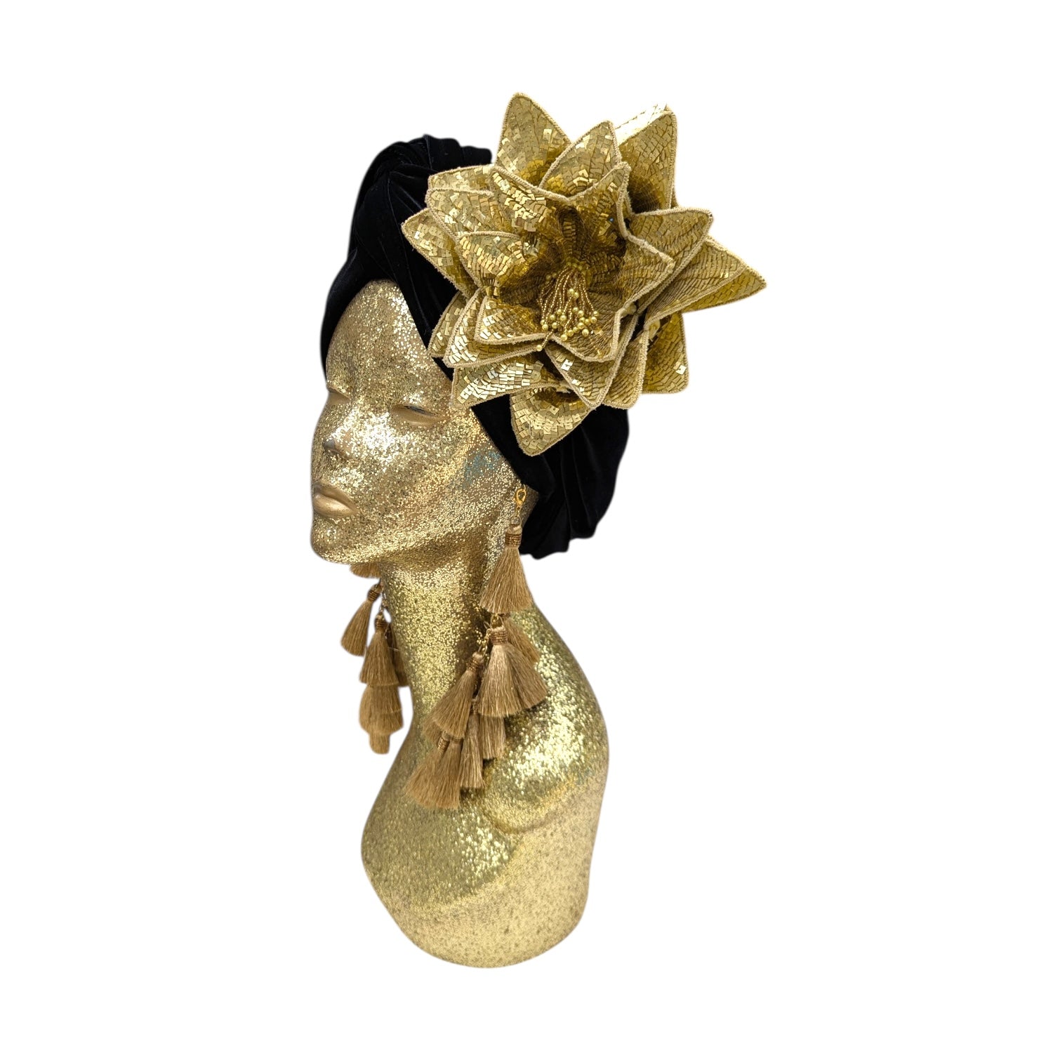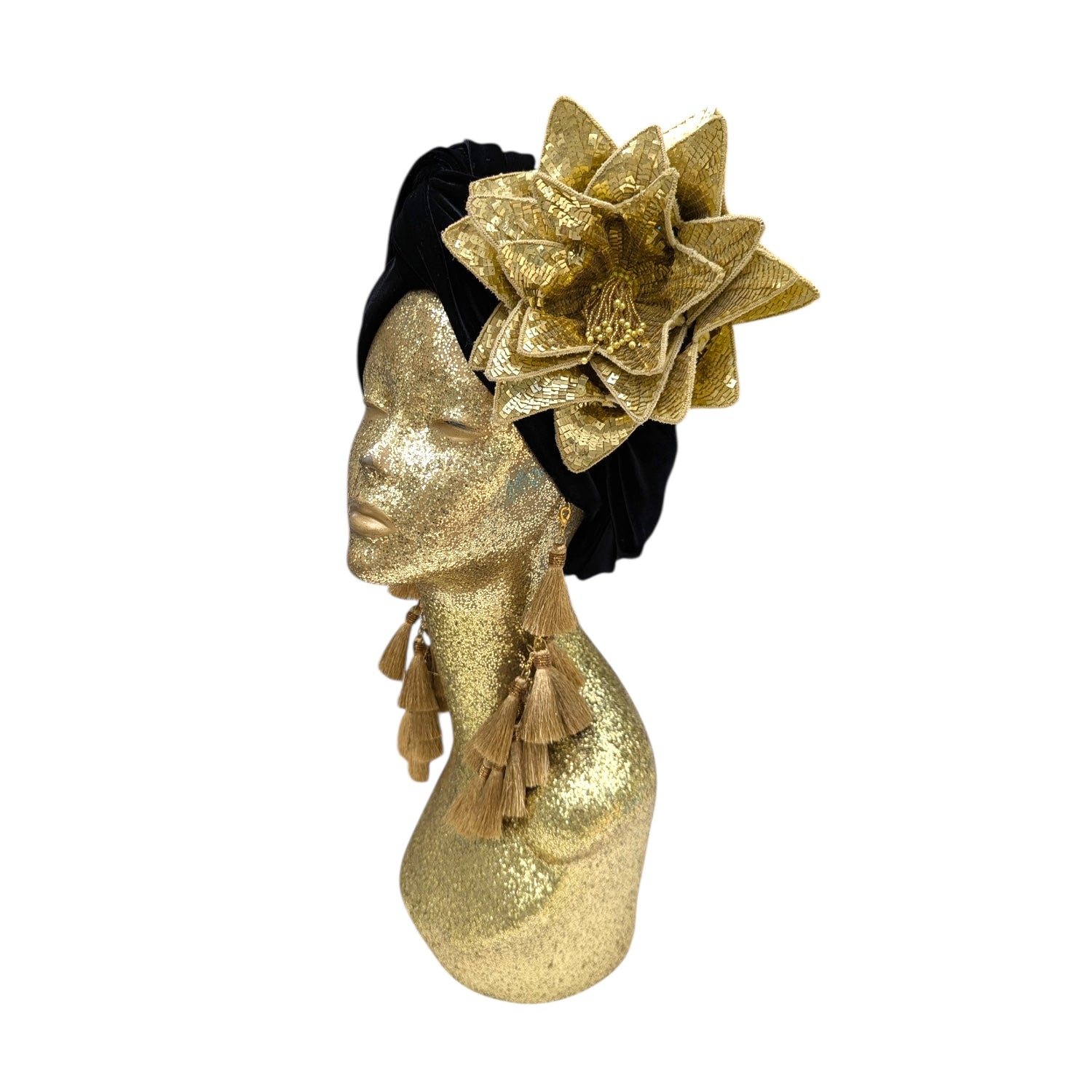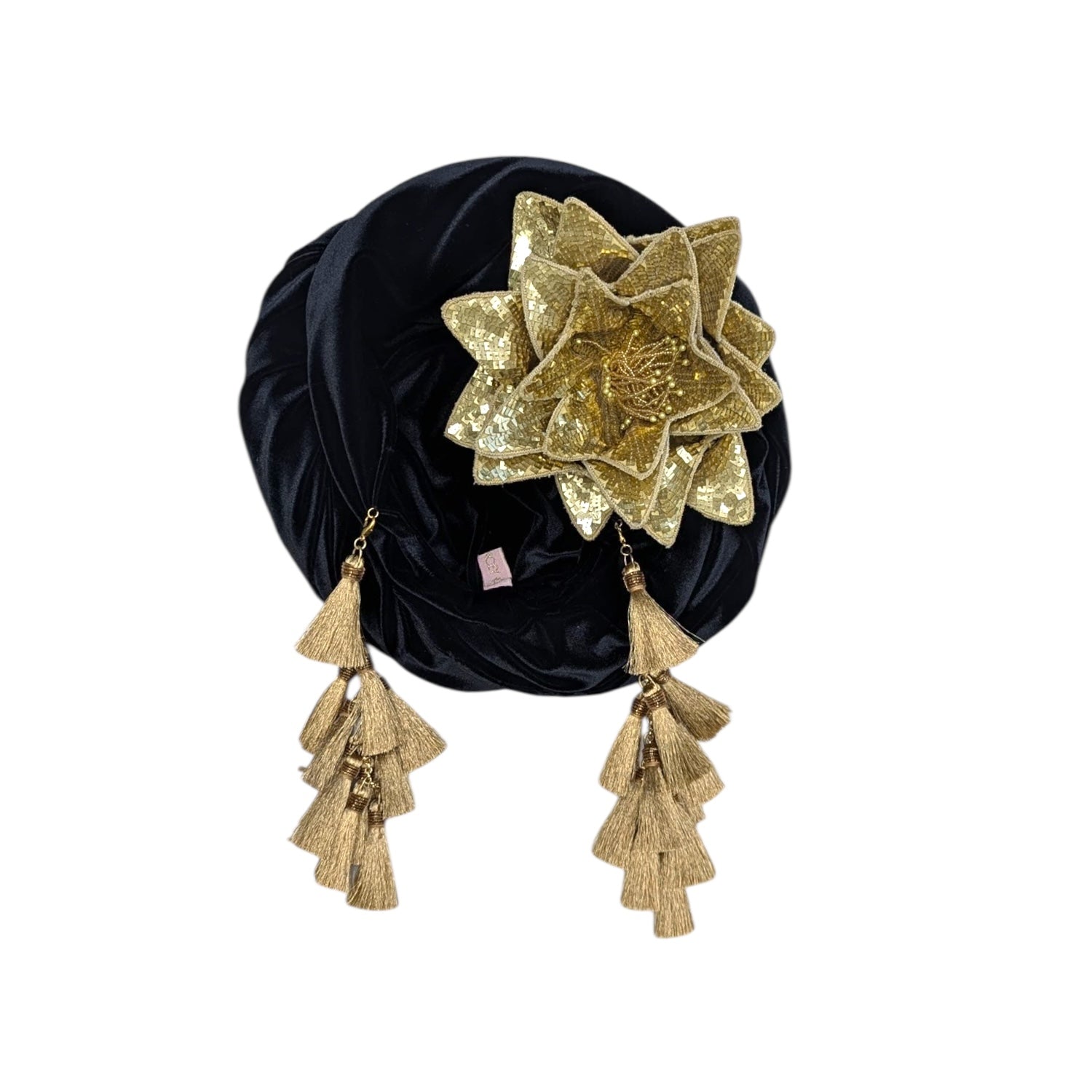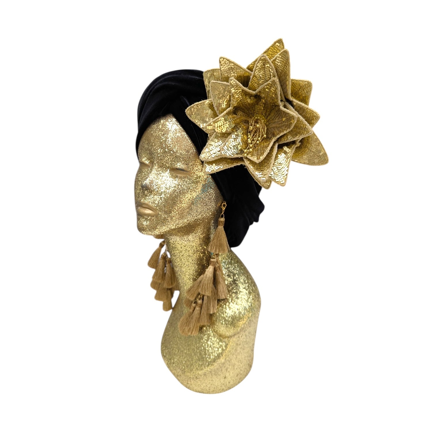 Wear it on your turban or style in your hair or clothing .This Classic Madam style offering full glamour coverage in soft velour teamed with hand made cotton earrings. Soft enough to pop inside the turban should you wish to wear without. The earrings are made by artisans in India and turbans made locally in Los Angeles. This is a direct to consumer product.