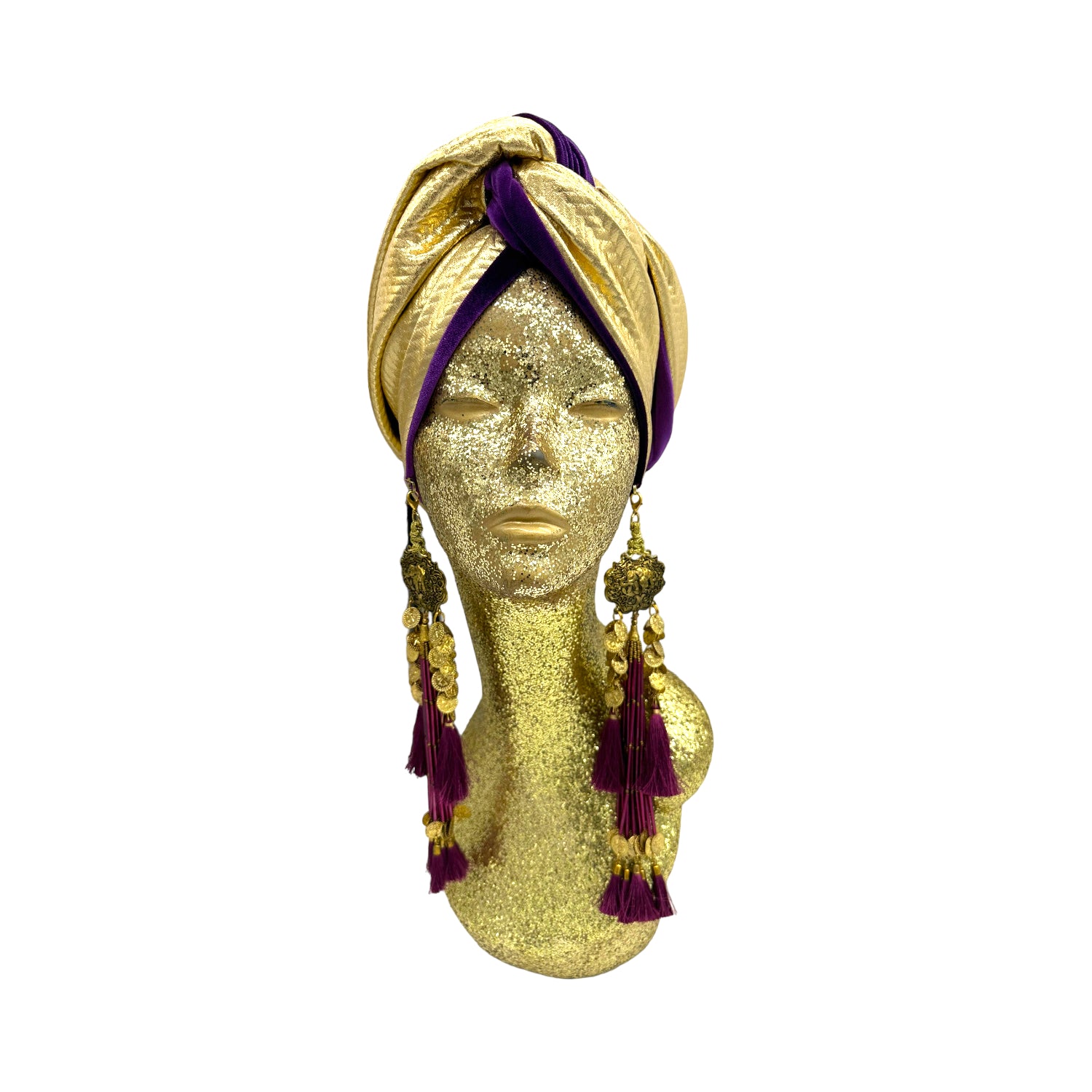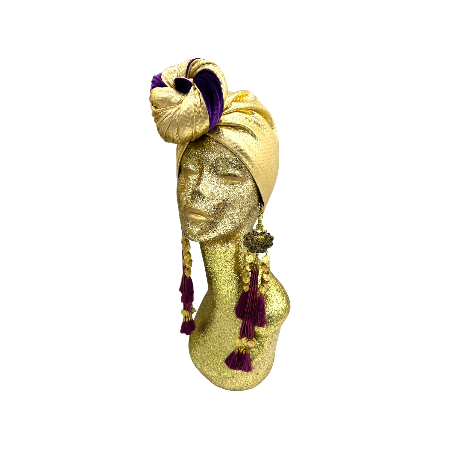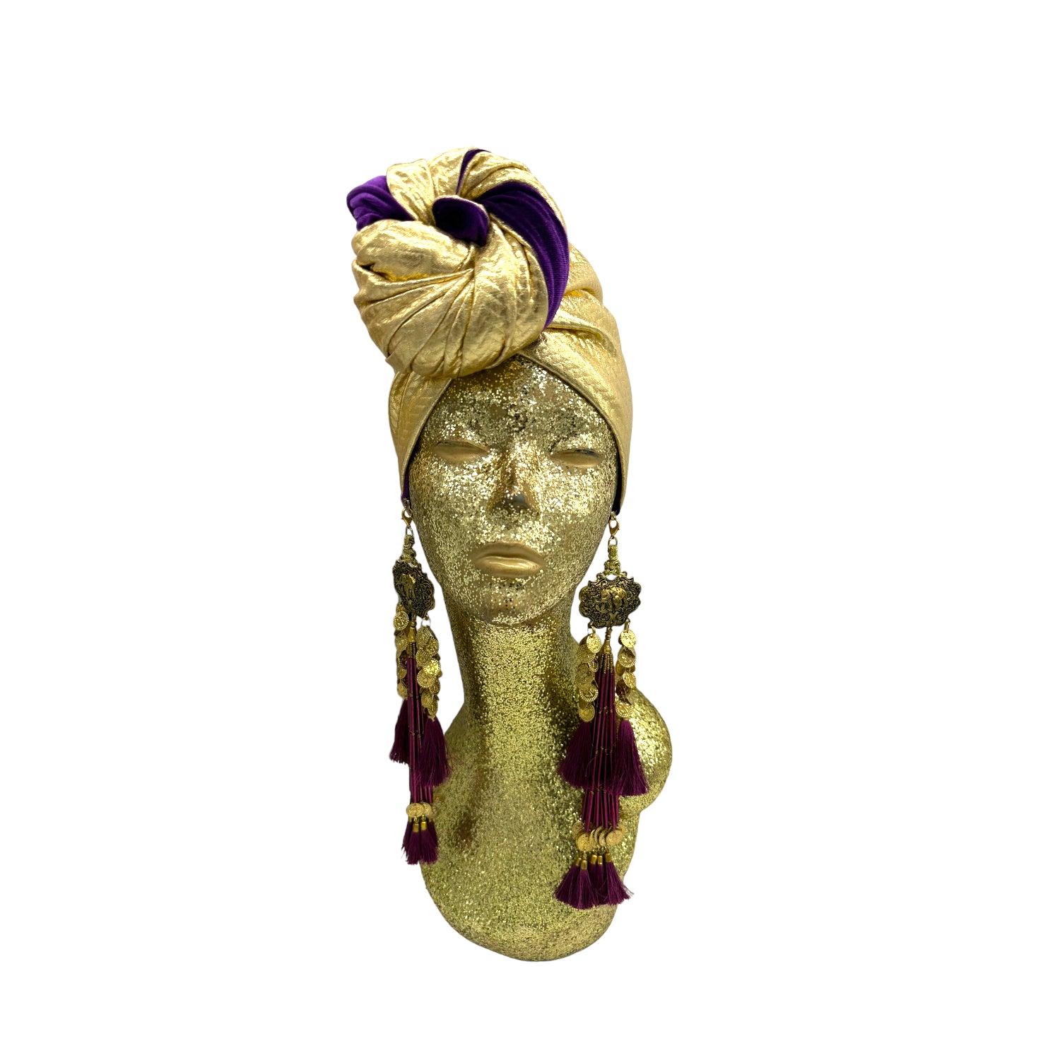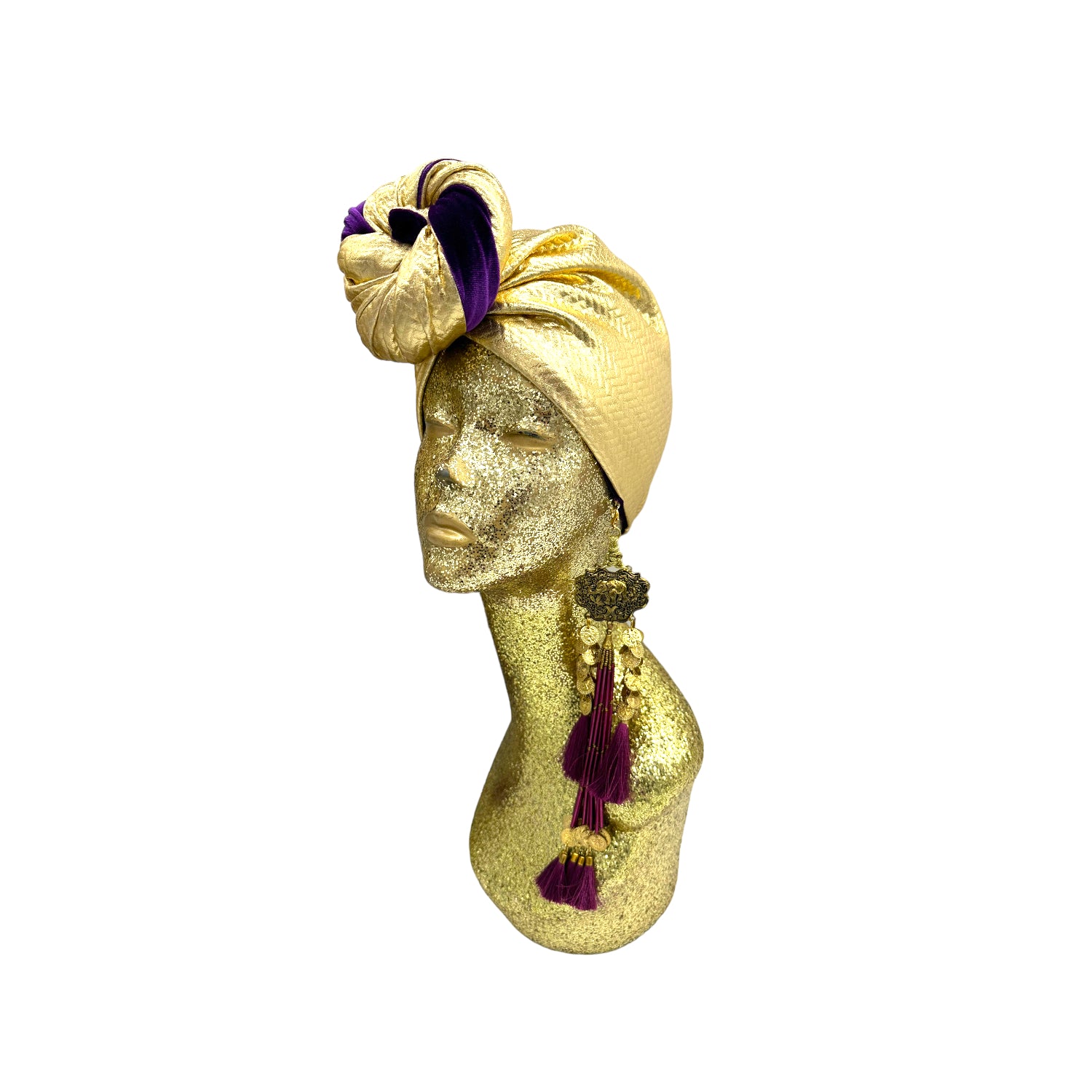 The ultimate in fabulous! This turban offers full coverage and full glam. With a simple twist to get perfect fit. Instant chic in seconds. The earrings are removable. Made with love in Los Angeles. These are direct to consumer products. One size fabulously fits all but please look at our turban tutorials before buying. This style is our best seller as super easy to get perfect fit.