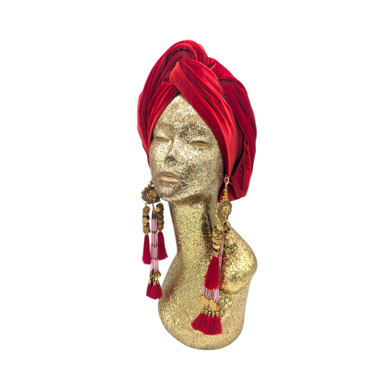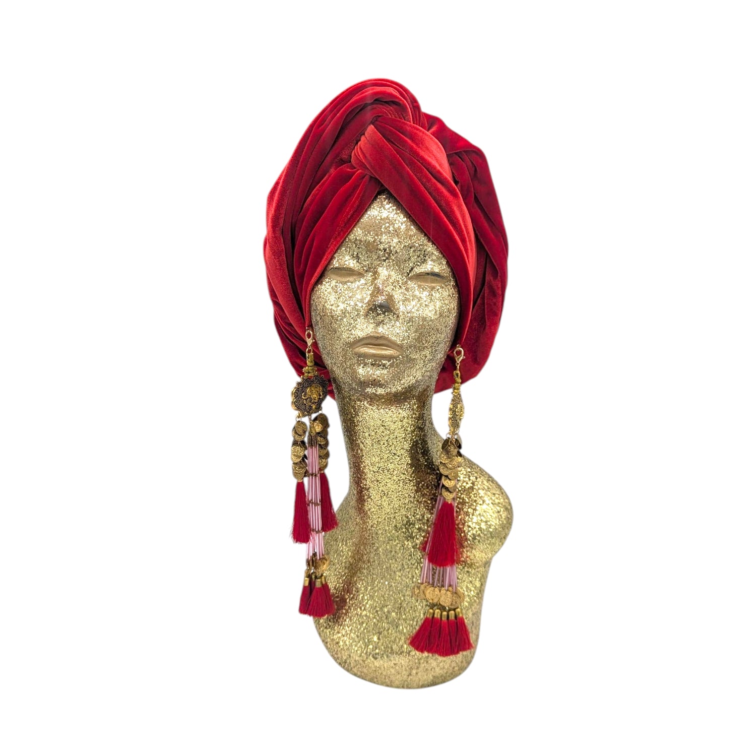 The Julia Clancey Turban is the epitome of glamour and timelessness. Inspired by Old Hollywood, this turban instantly add glamour to any outfit. It is designed to fit all head sizes and features removable tassel earrings, giving you the freedom to customize your look. This turban is made with care in Los Angeles, guaranteeing its quality. Get ready to turn heads with this stunning accessory.