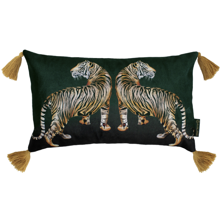 Inject a sense of the exotic into your interior with this truly striking textiles design that feature two intricately painted tigresses on the prowl together. We love how the warm copper tones of these big cats sit so perfectly on the lush green backdrop, such a modern and uplifting colour combination.