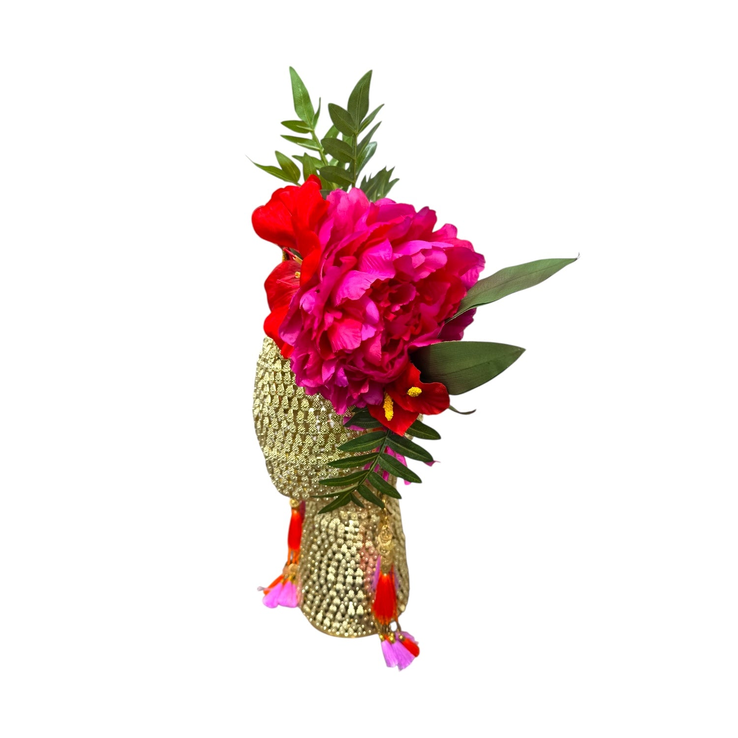 The hand made tassels which clip on and off are made by artisans in India ran by female owned small business.