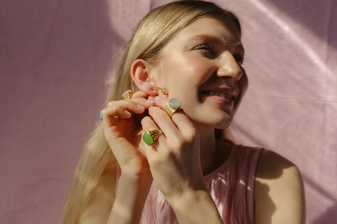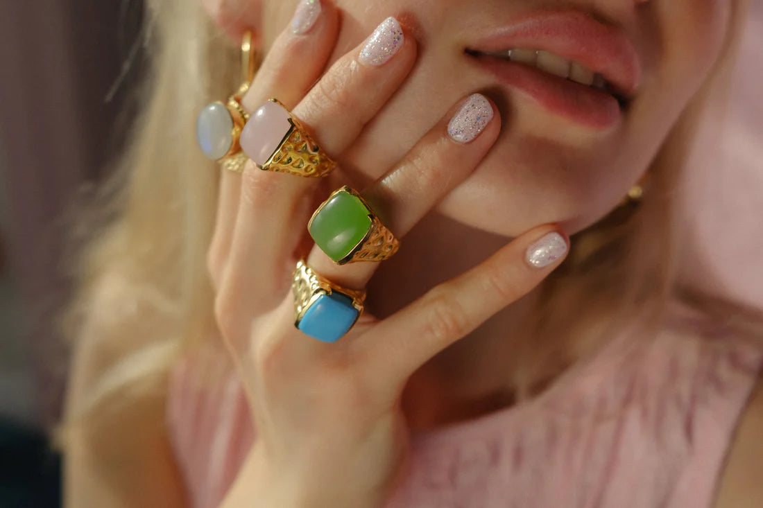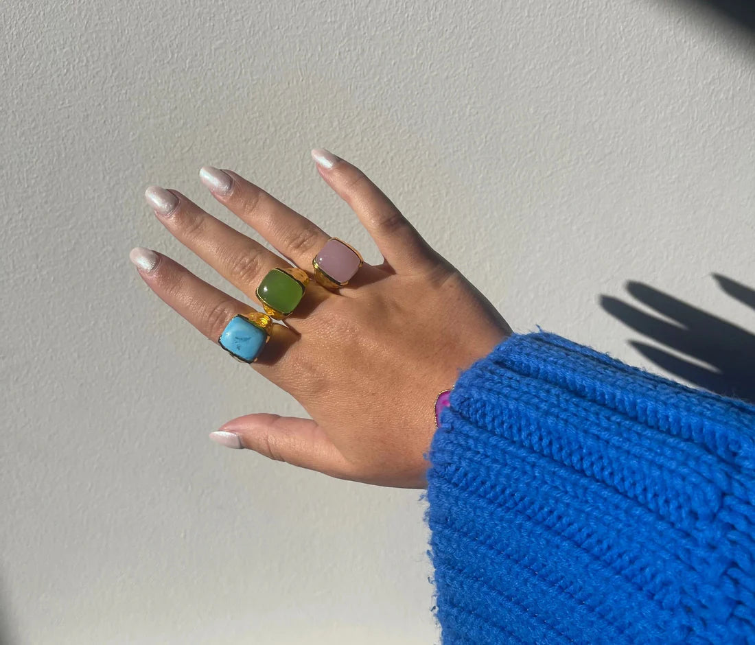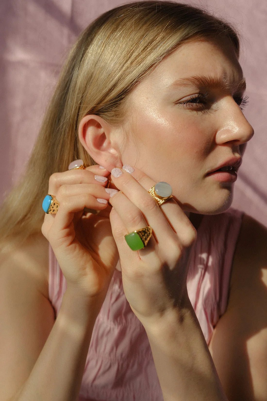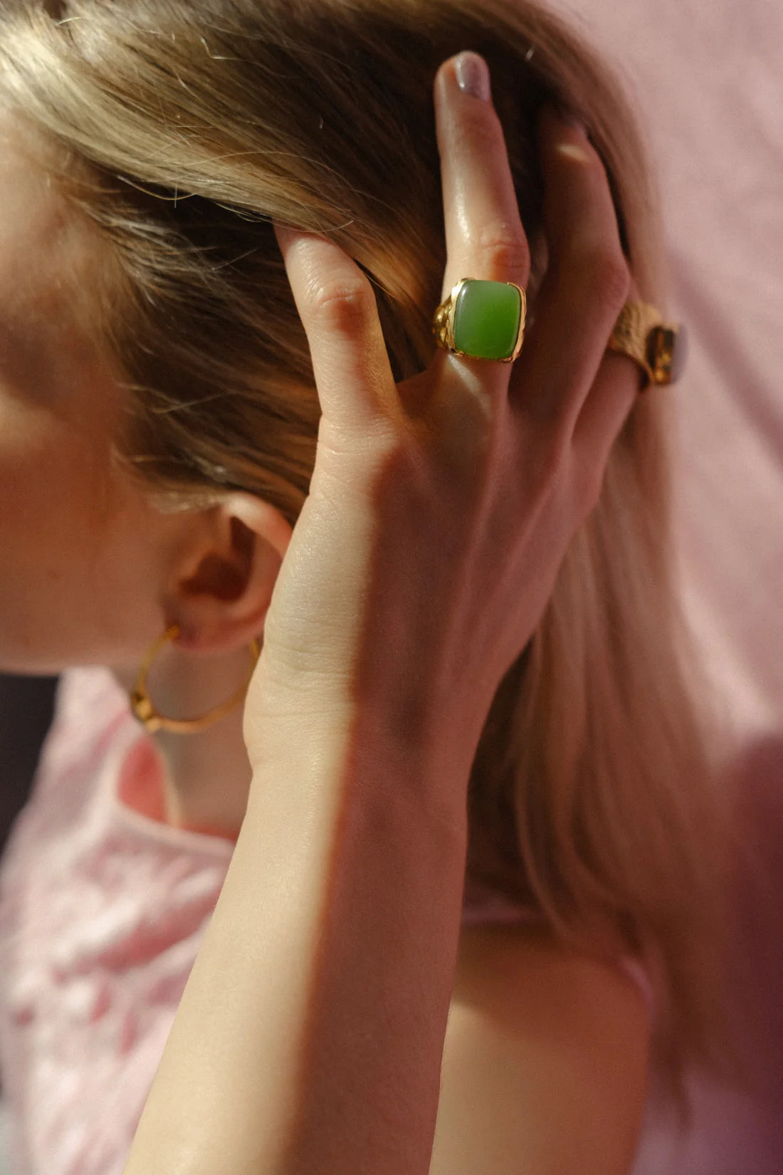 Give yourself a reason to smile every day with our brand new 'Happy' Gemstone Ring Collection. This ring features a refreshing prehnite stone hugged in an 18k demi-matt gold plated band. When your morning is looking a little dull, our 'Happy' rings are here to brighten up your day. Get ready to go and spread the good vibes! Materials: Prehnite, 18k gold plating, brass Stone size: 1.5 x 1.3cm