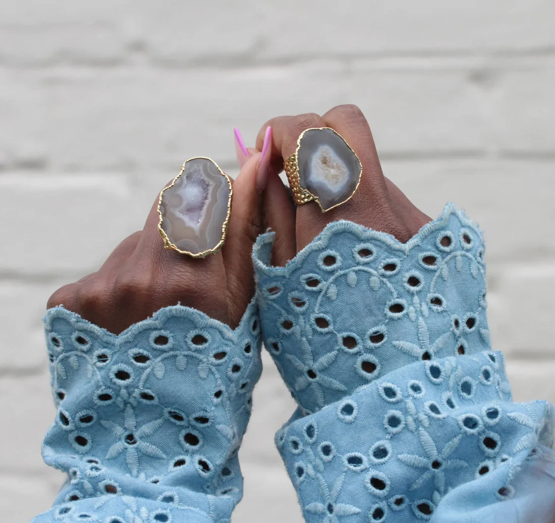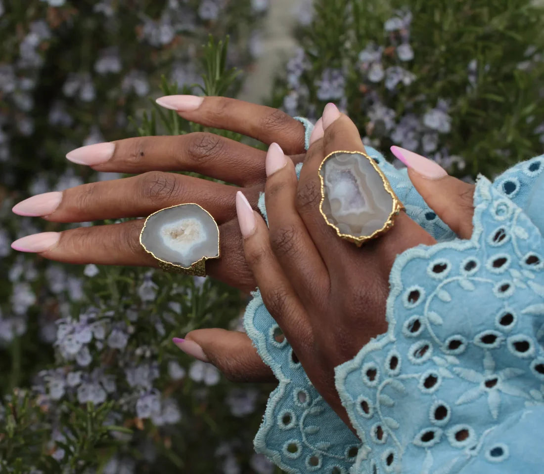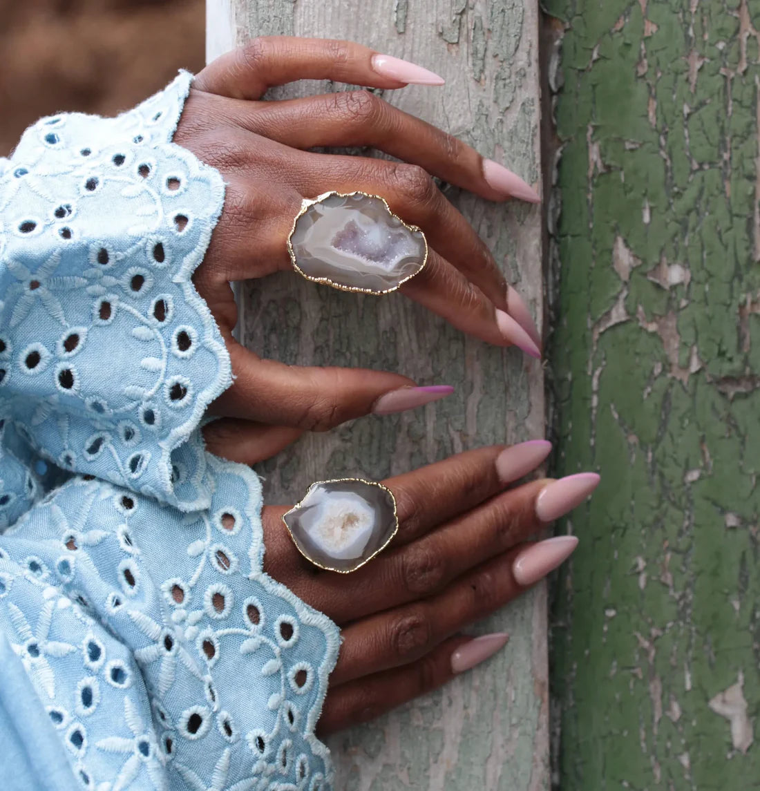 This limited edition handmade agate crystal gemstone statement ring is set in a demi-matte textured, gold-plated thick band. The neutral brown and pale grey shades of the stones are magnificent, often featuring a crystal lined cavity. Make some power moves with these gorgeously unique rings. Every single one is unique in shape and stone size. This ring will arrive in a YAA YAA LONDON jewelry box.