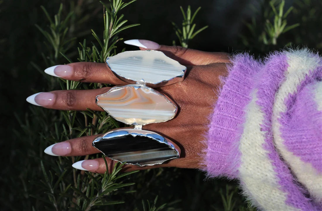 Our sterling silver agate stone range ‘GRANDE’ has finally arrived after great demand.  This premium, luxurious range is bound to stand out from the crowd wherever you go!  Our rings are designed and handmade for people wanting the ultimate statement ring, but this time in 925 sterling silver.  Compared to our ULTRA MEGA Ring , this range offers the same size and shape, all you must do is decide what colour you want choose to go with your outfit! Colour intensities can vary as these are natural semi-precious gemstones.  Each ring will arrive in a YAA YAA LONDON jewellery box making them a beautiful gift item too.  All rings are adjustable.