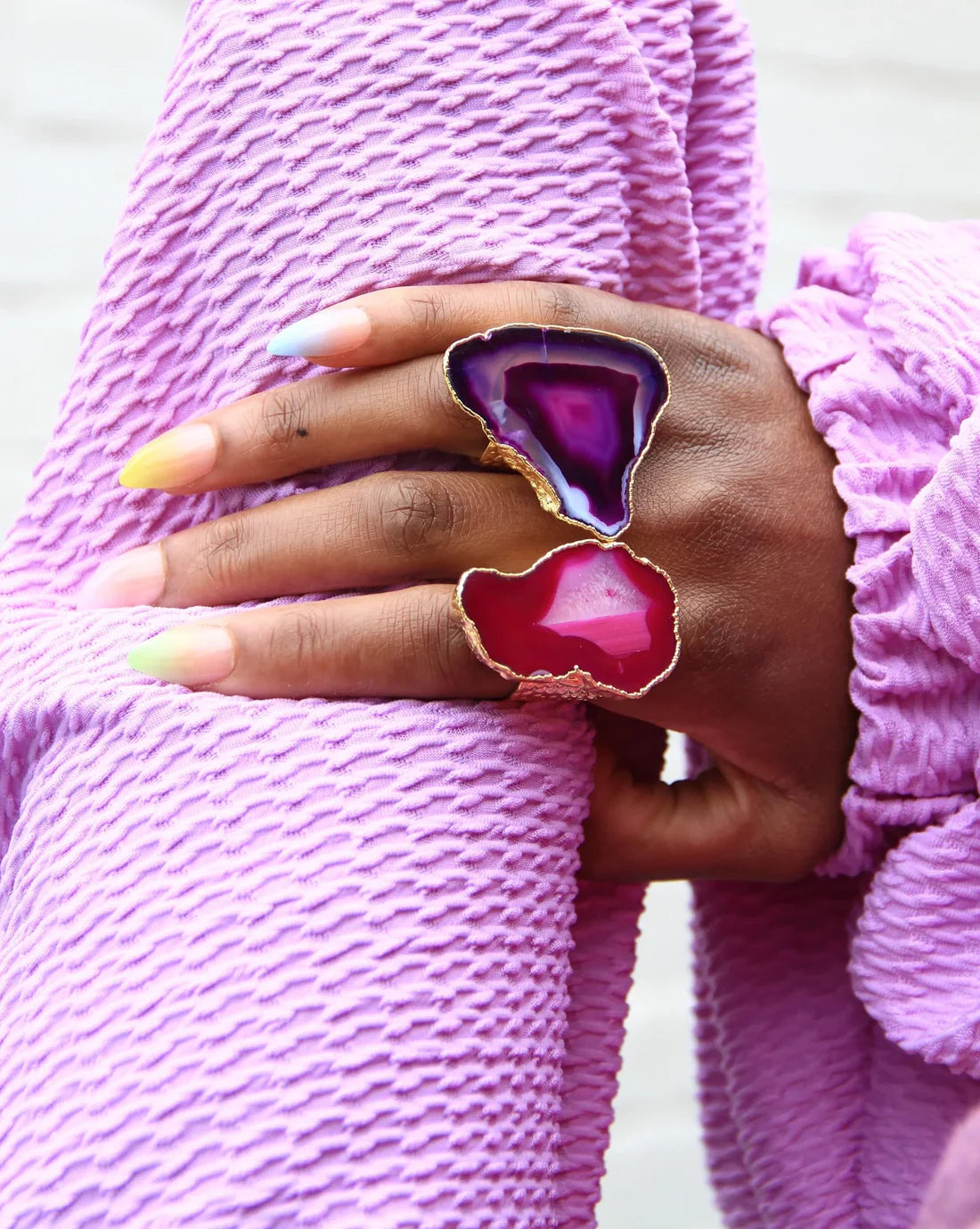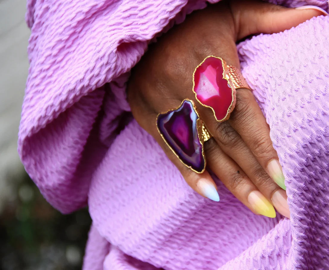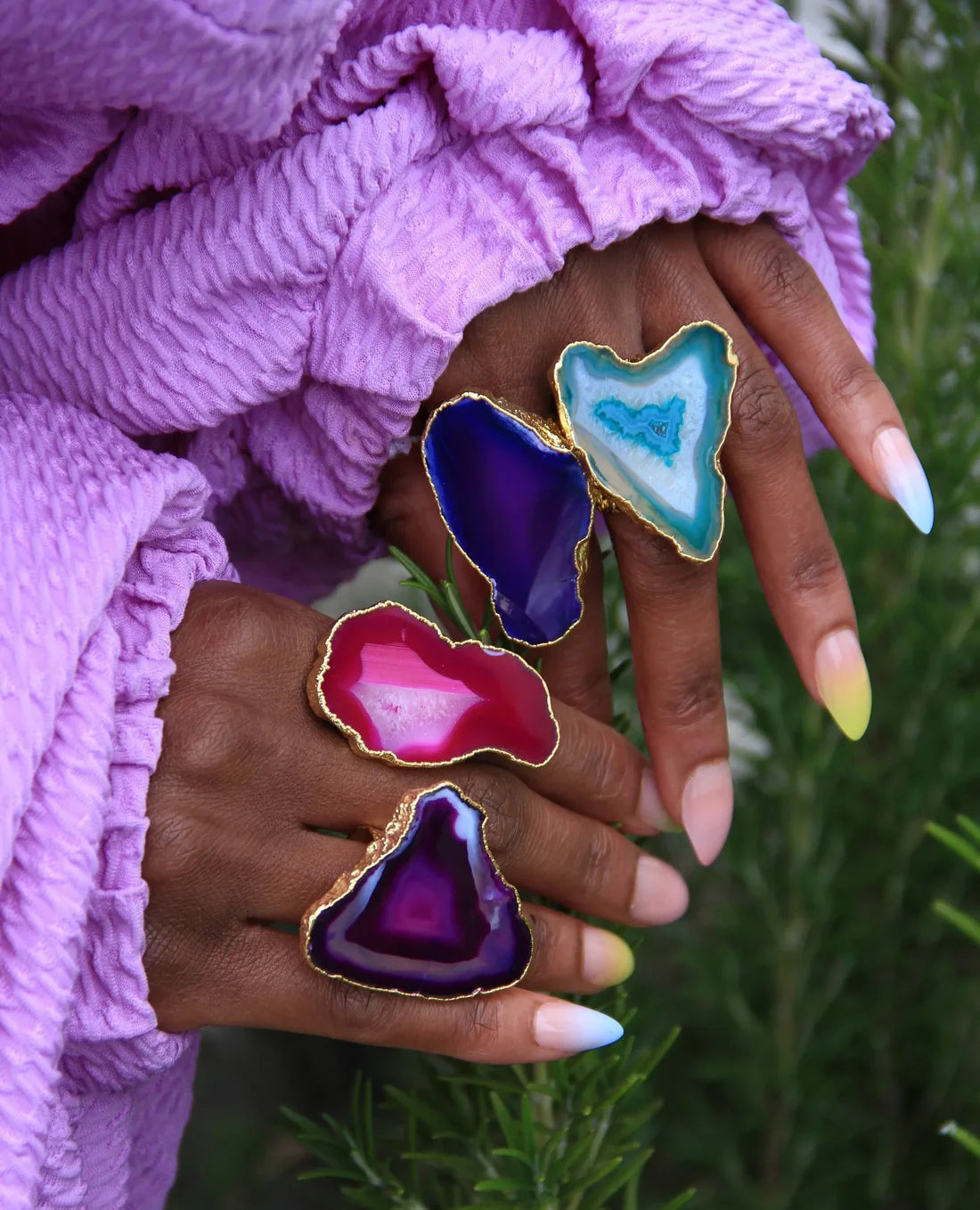 Designed and handmade for people wanting the ultimate statement ring. Every gemstone is unique in shape, cooler intensity and size. These exceptional rings are guaranteed to attract admiring glances. The agate stones are beautifully gilded in gold plating and the rings are also adjustable. Take your mind to a happy place by gazing at the natural beauty that only semi-precious stones can bring. Inspired by loyal customers that wanted the biggest stone possible. - Agate stone, 18 k gold, brass - approx. 42 to 60 mm stone length at the widest point. Adjustable ring Color intensities, stone shapes and sizes vary