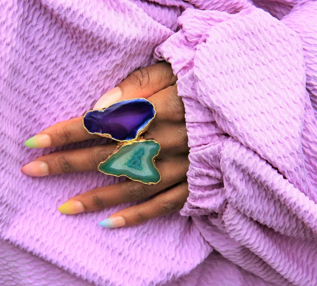 Designed and handmade for people wanting the ultimate statement ring. Every gemstone is unique in shape, colour intensity and size. These exceptional rings are guaranteed to attract admiring glances in shades of green from teal to emerald. The agate stones are beautifully gilded in 18k gold plating and the rings are also adjustable. Take your mind to a happy place by gazing at the natural beauty that only semi-precious stones can bring. This ring will arrive in a YAA YAA LONDON jewellery box. Inspired by loyal customers that wanted ‘the biggest stone possible’
