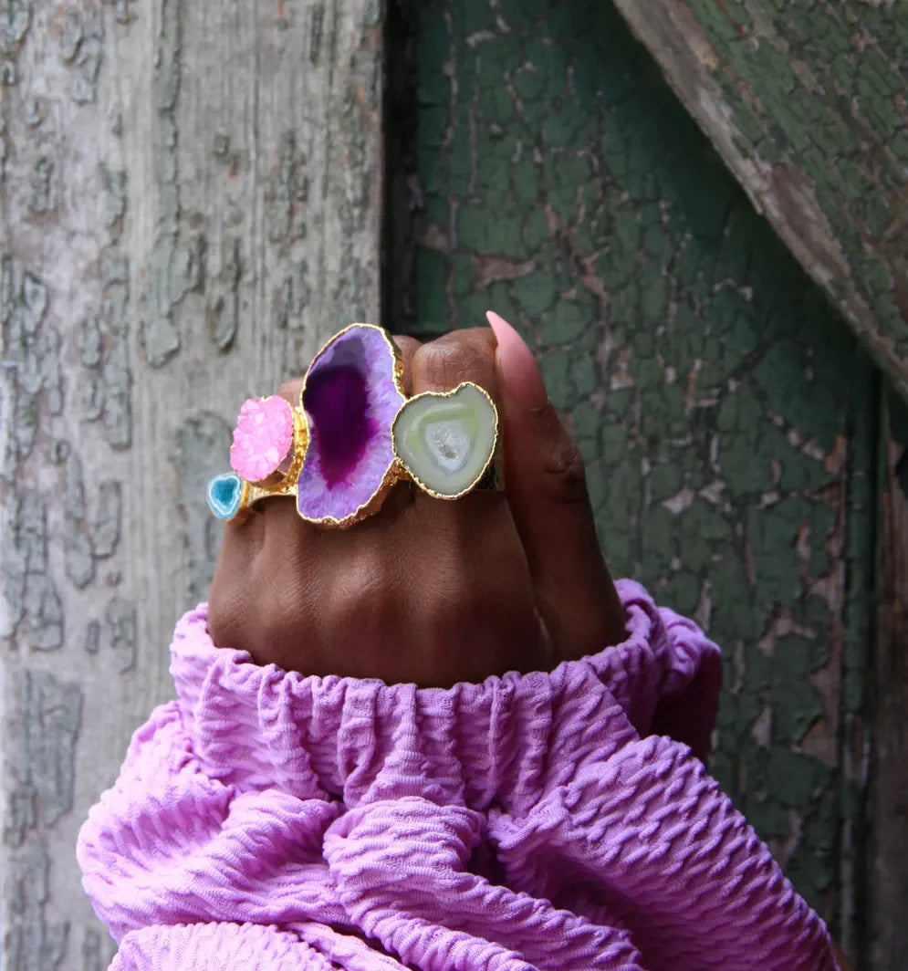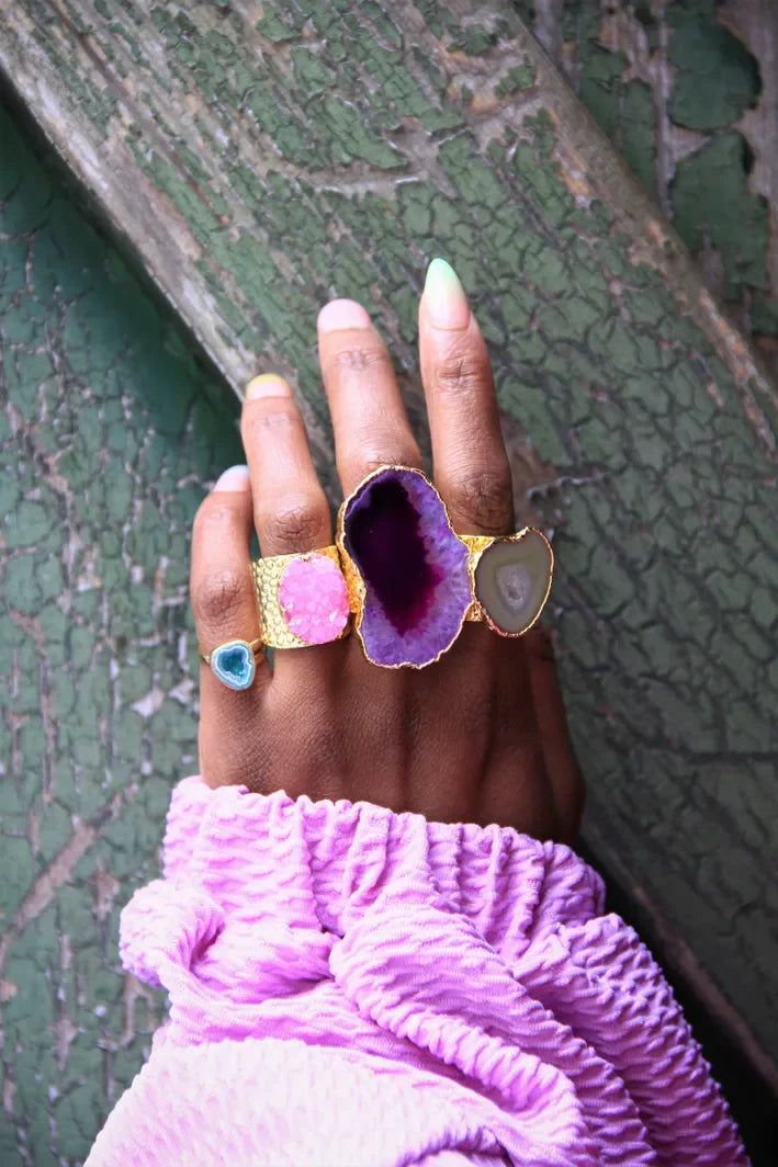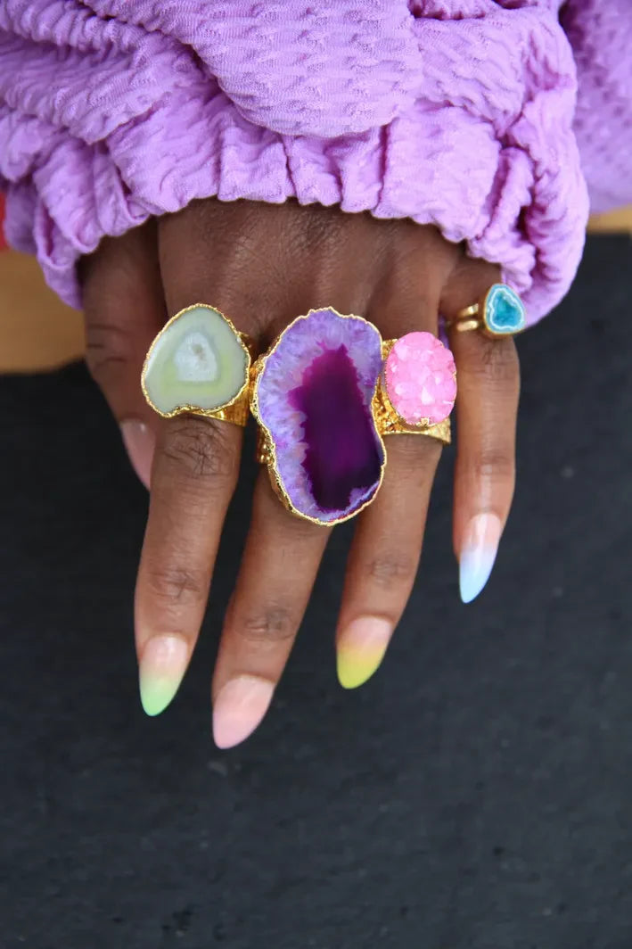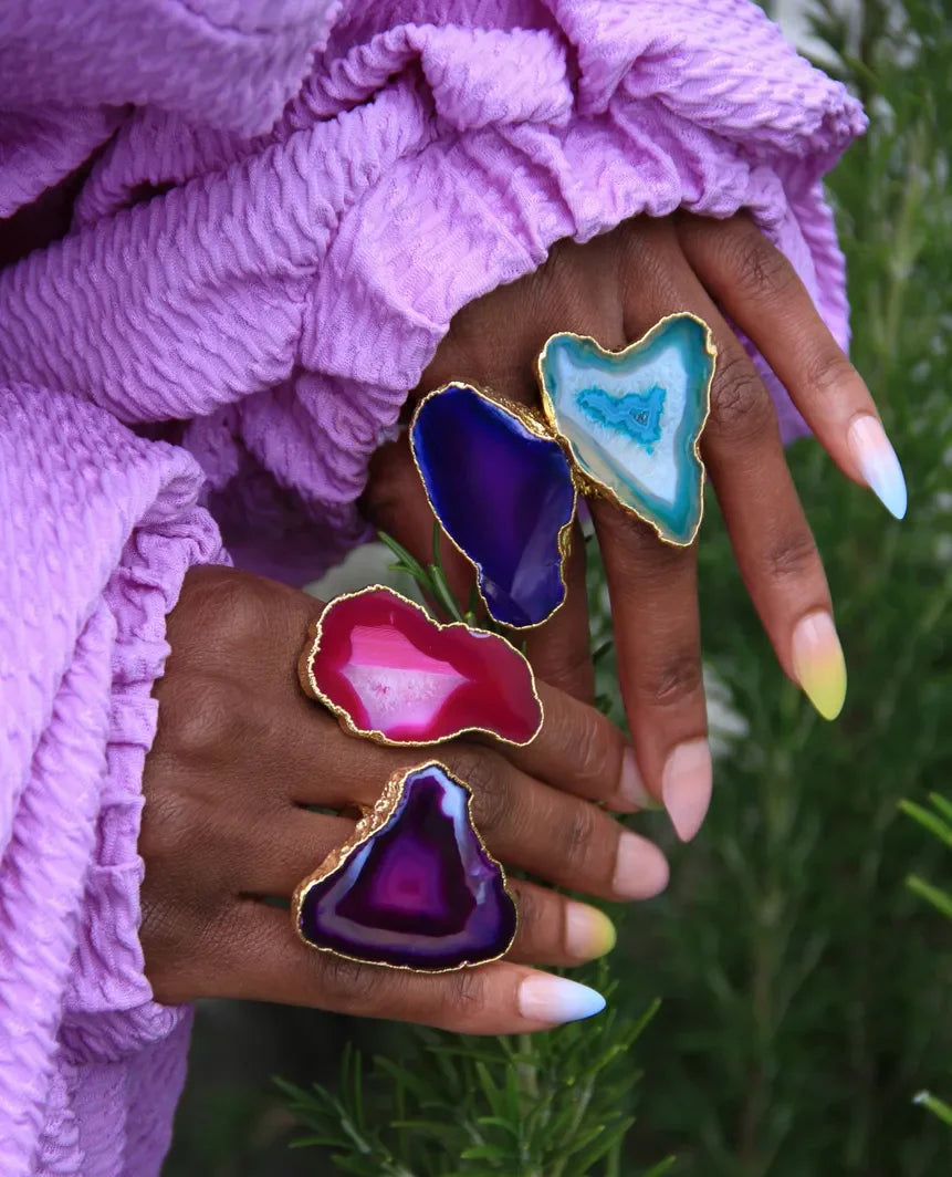 Designed and handmade for people wanting the ultimate statement ring. Every gemstone is unique in shape, color intensity and size. These exceptional rings are guaranteed to attract admiring glances. The agate stones are beautifully gilded in 18k gold plating and the rings are also adjustable. Take your mind to a happy place by gazing at the natural beauty that only semi-precious stones can bring. This ring will arrive in a YAA YAA LONDON jewellery box. Inspired by loyal customers that wanted ‘the biggest stone possible’ Materials: Agate stone, 18k gold, brass Stone size: approx. 45-60mm stone length at the widest point.