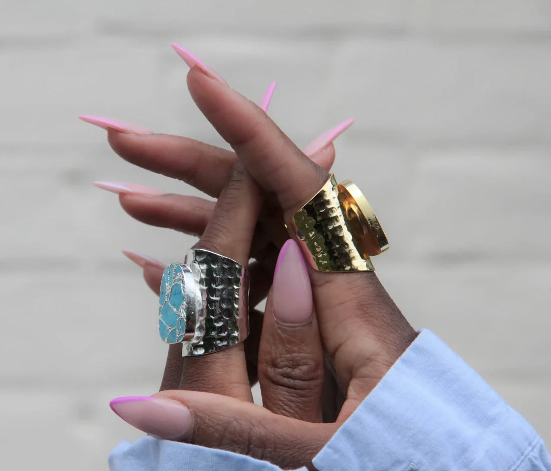 NEW and improved - longline ring by YAA YAA LONDON Handmade longline turquoise stone with captivating molten gold veins and a textured gold cuff band. Color intensities and uniqueness vary from stone to stone making them as unique as the person wearing them. No two are exactly the same so your ring will be completely unique. A beautifully re-worked and created ring to keep you smiling all year round.