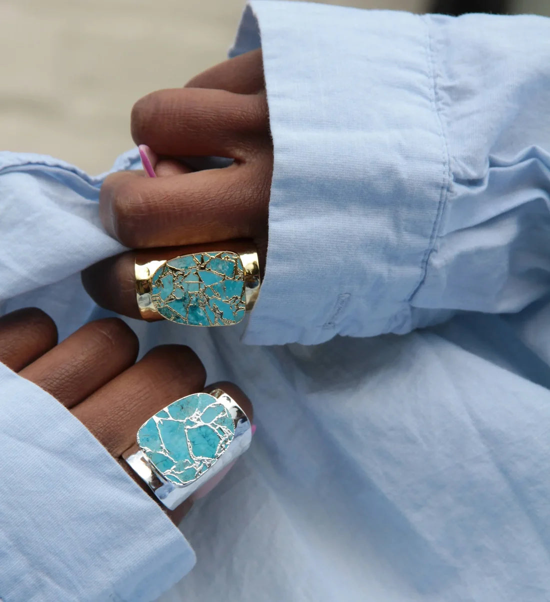 Materials: compressed turquoise stone, 24k gold plating, brass, copper Average stone size: approx 2.5cm x 2cm Ring size: most suitable for longer fingers - you will find a finger to fit the ring Ring length: 3.5cm. This is a longline cuff ring.