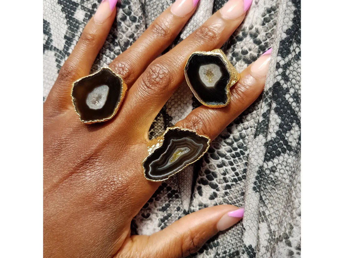 New handmade agate crystal gemstone statement rings set in a demi-matt gold plated thick band. Make some power moves with these gorgeously unique rings. The color intensities, stone sizes and shapes vary from ring to ring making each one unique. This ring will arrive in a YAA YAA LONDON jewelry box.