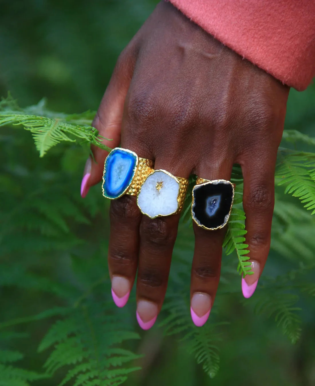 Make a bold statement with our 'MEGA' semi-precious stone rings – a striking blend of natural beauty and powerful design. Each ring features a unique, colourful agate crystal set on a chunky, demi-matte 18k gold-plated brass band.