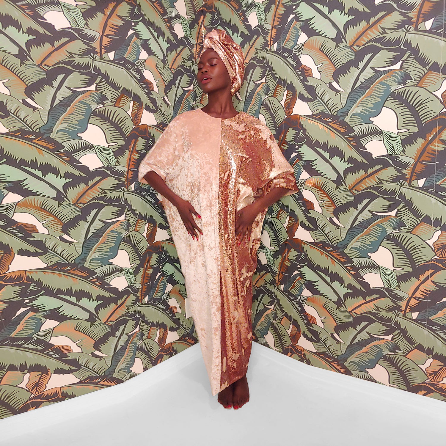 A little sparkle on this comfy glam velour/sequin kaftan lined in soft modal. In beautiful dusky pink crushed velour & rose gold sequins. Super comfy & super glam !Matching turban offering full coverage and full glam are available in numerous styles but not included.