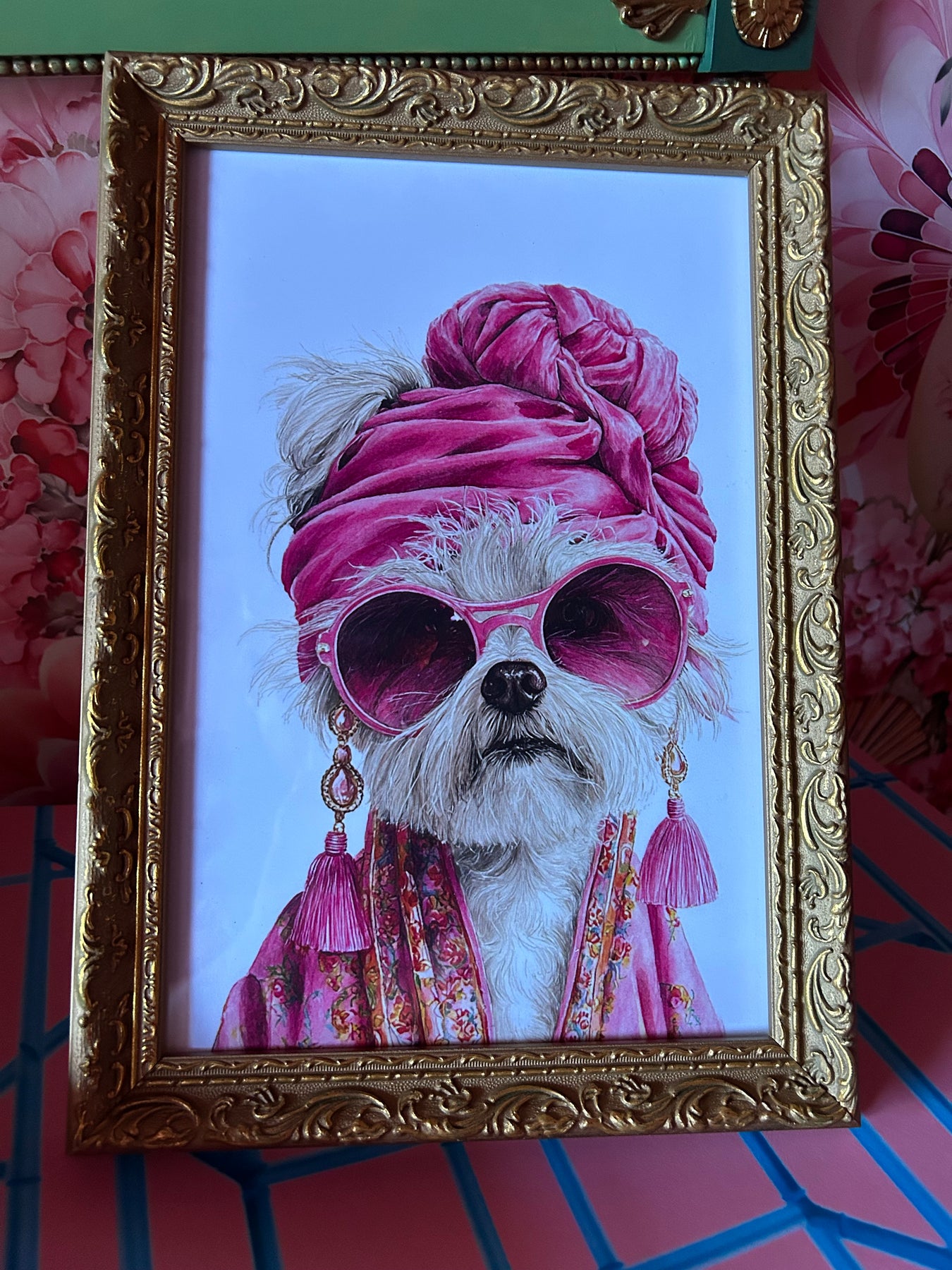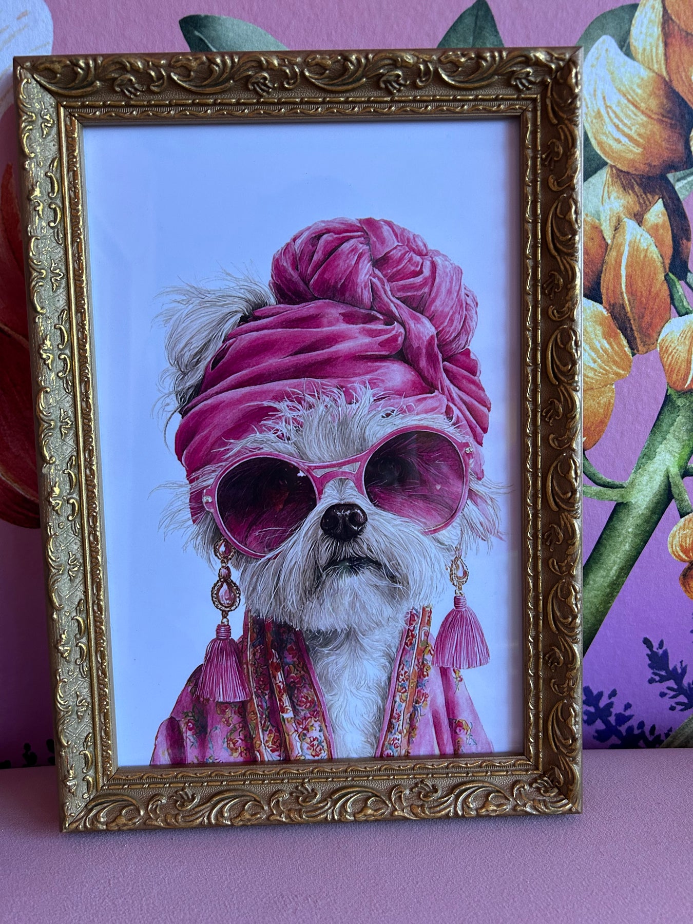 We offer a full Bespoke Service with Siobhan creating a portrait of your pooch , pussy cat , hamster or pet of your choice . Simply send us a photo of your pet and select the My Bitch option and size . Choose framed as shown or select simply a print and frame yourself