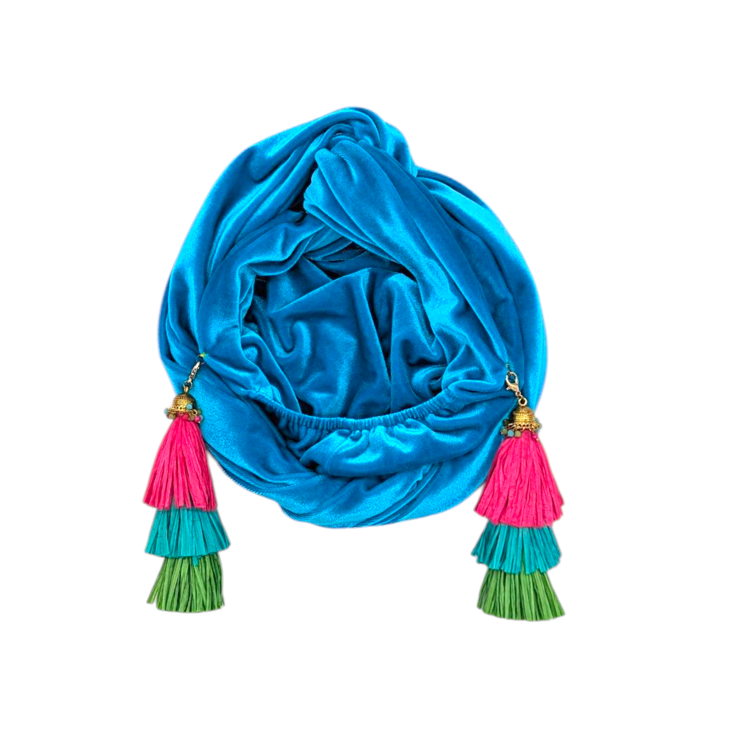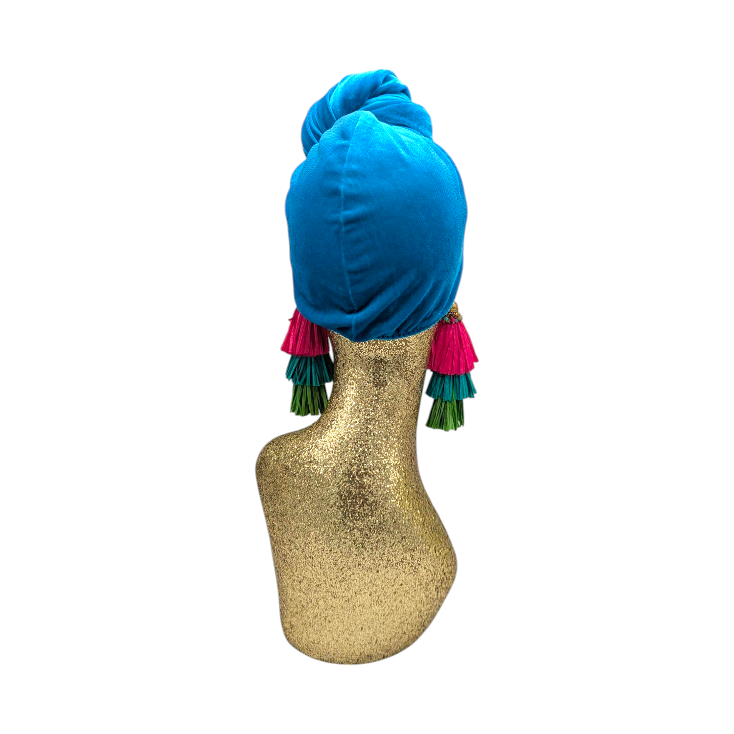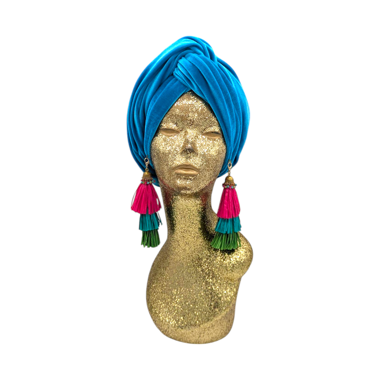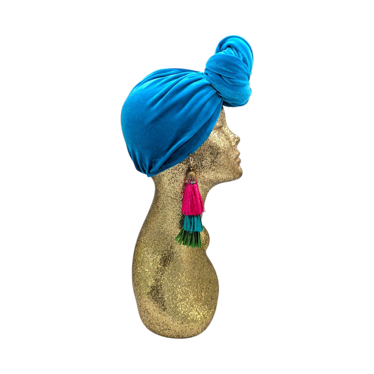 All our tassels are made by female owned company working with artisans in India . The turban is made of soft velour.