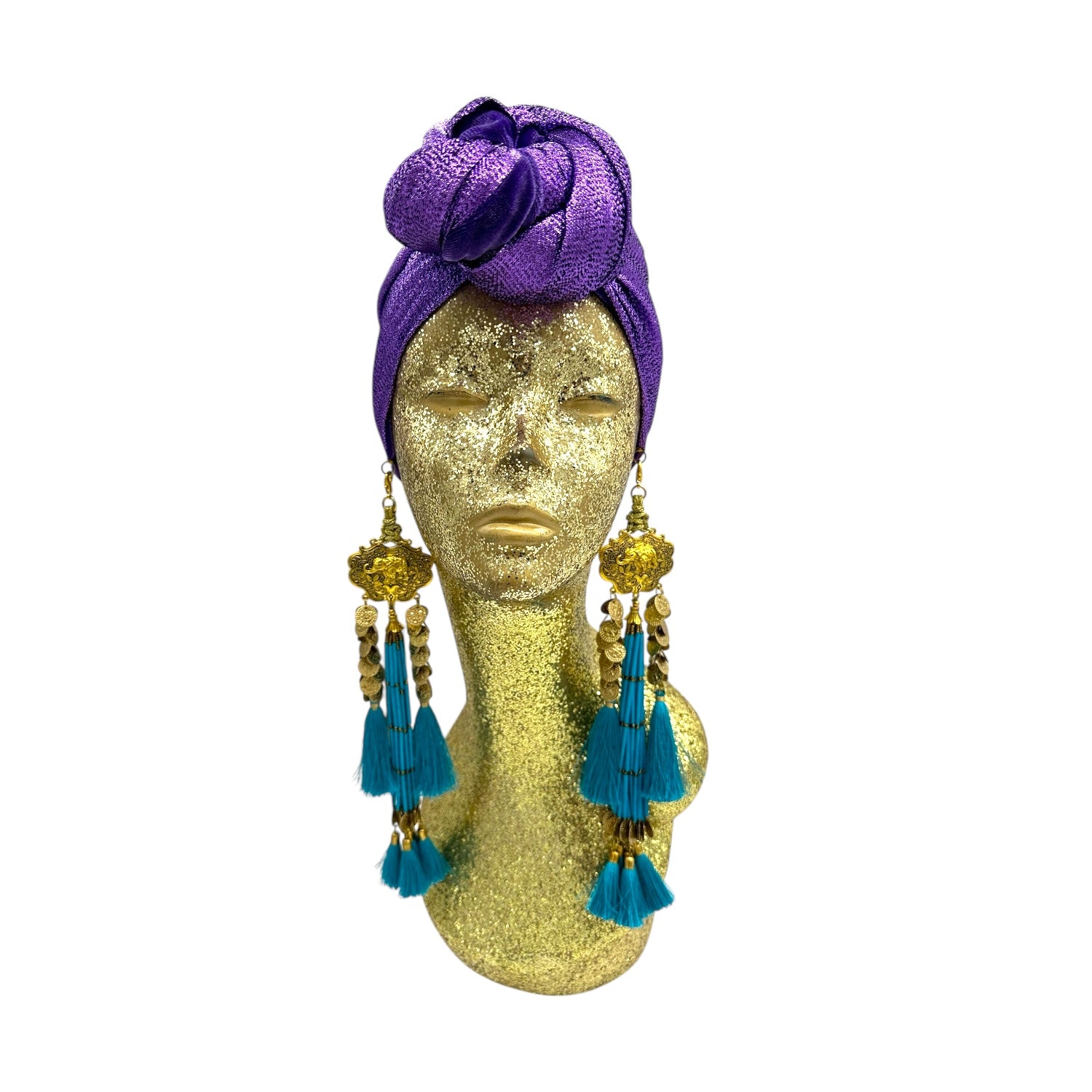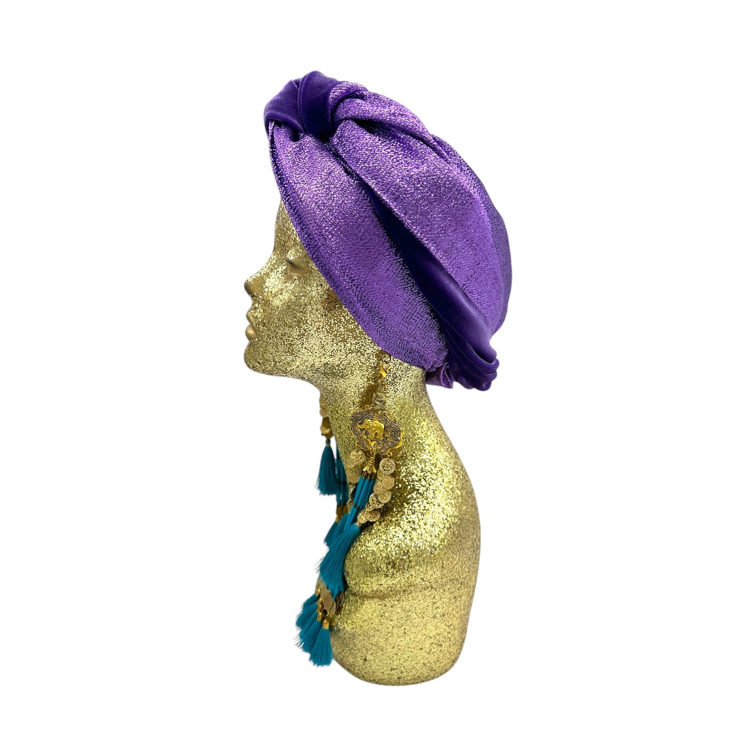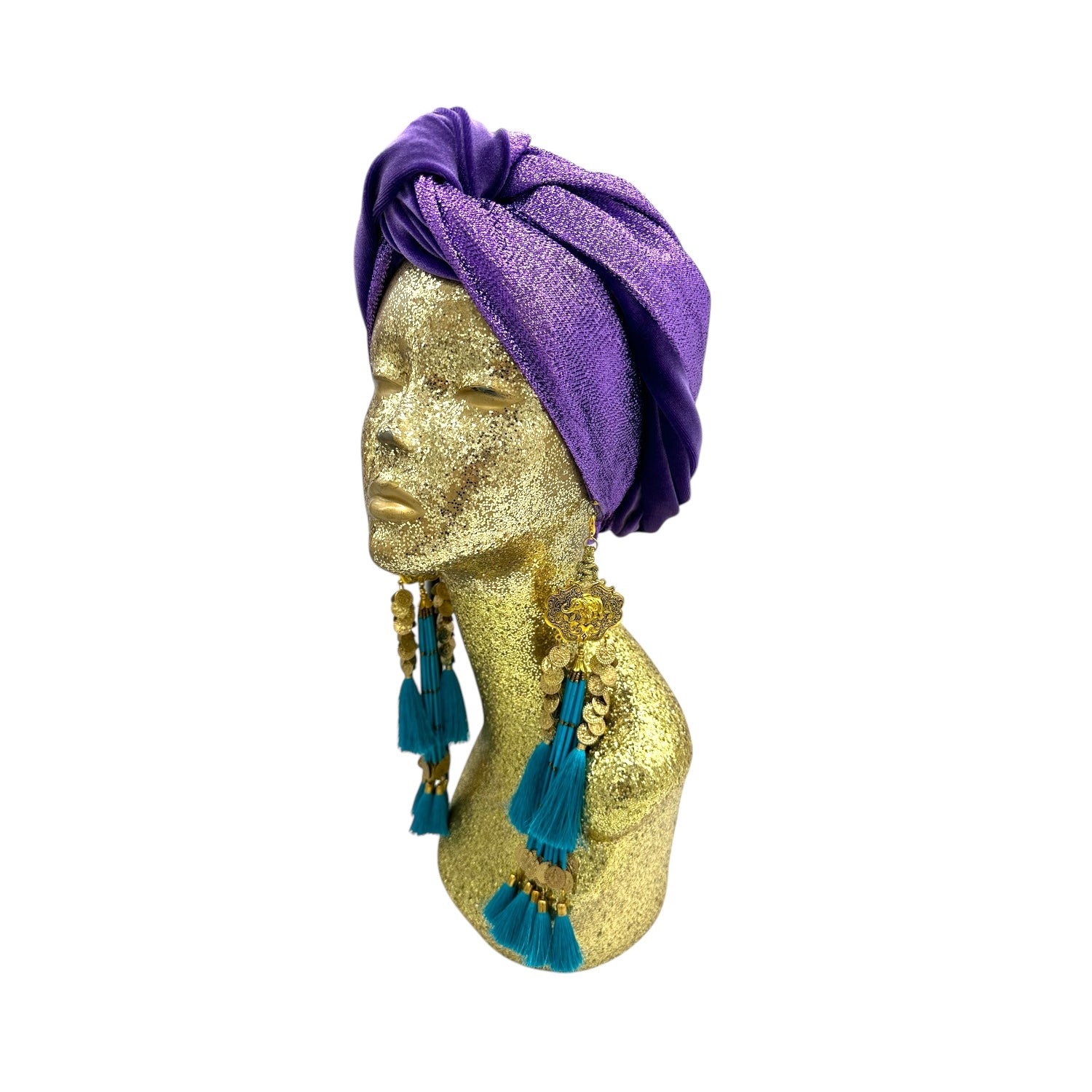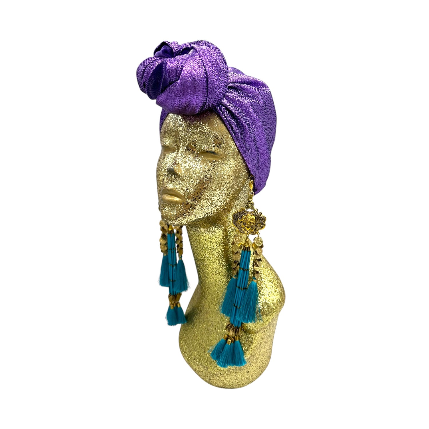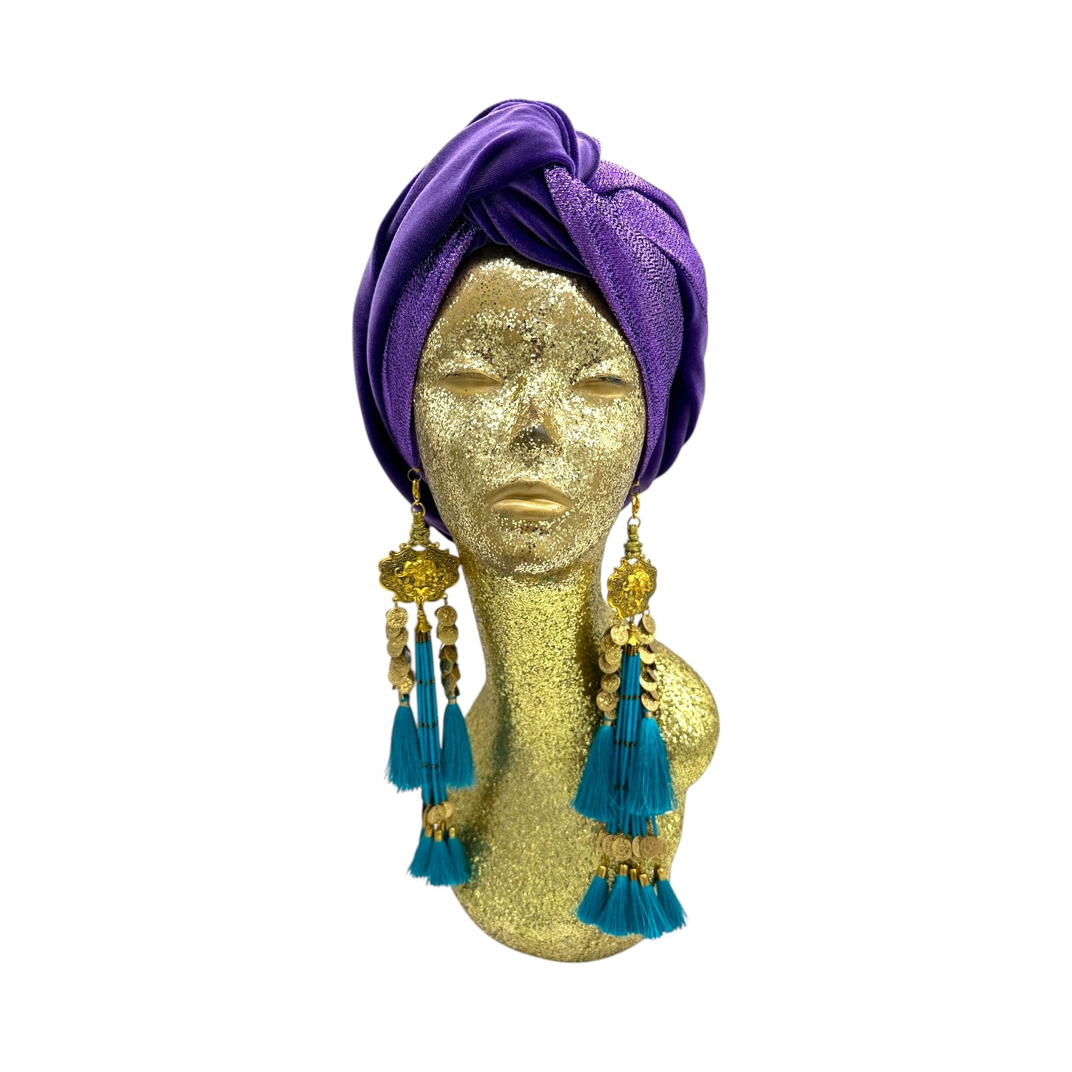 The icing on the cake with this glam reversible turban. wear it full gold glitz or with the soft velour. The tassels are removable and can be worn with our other tassel styles. The tassels are made by artisans in India and turbans with love in Los Angeles.