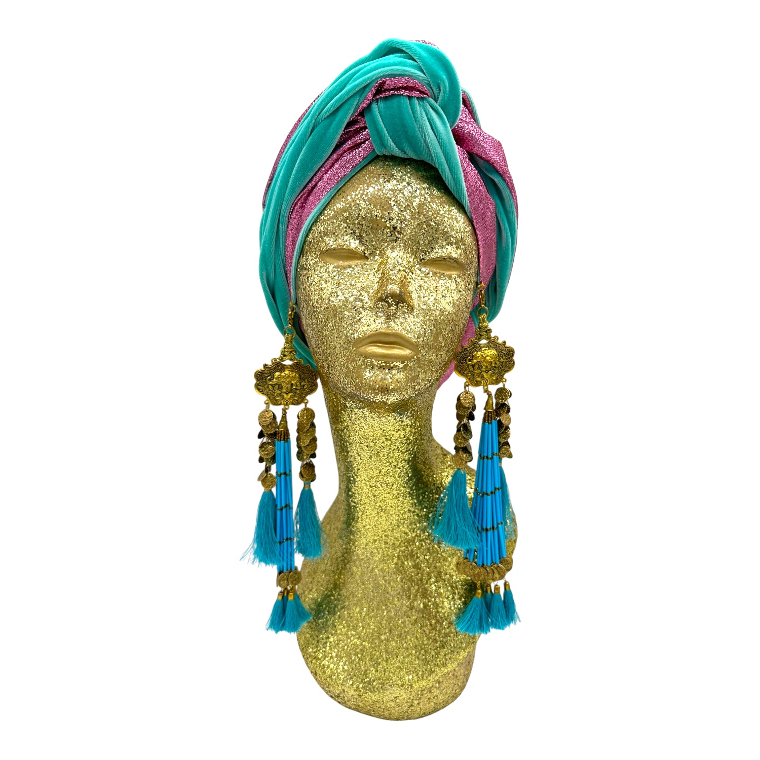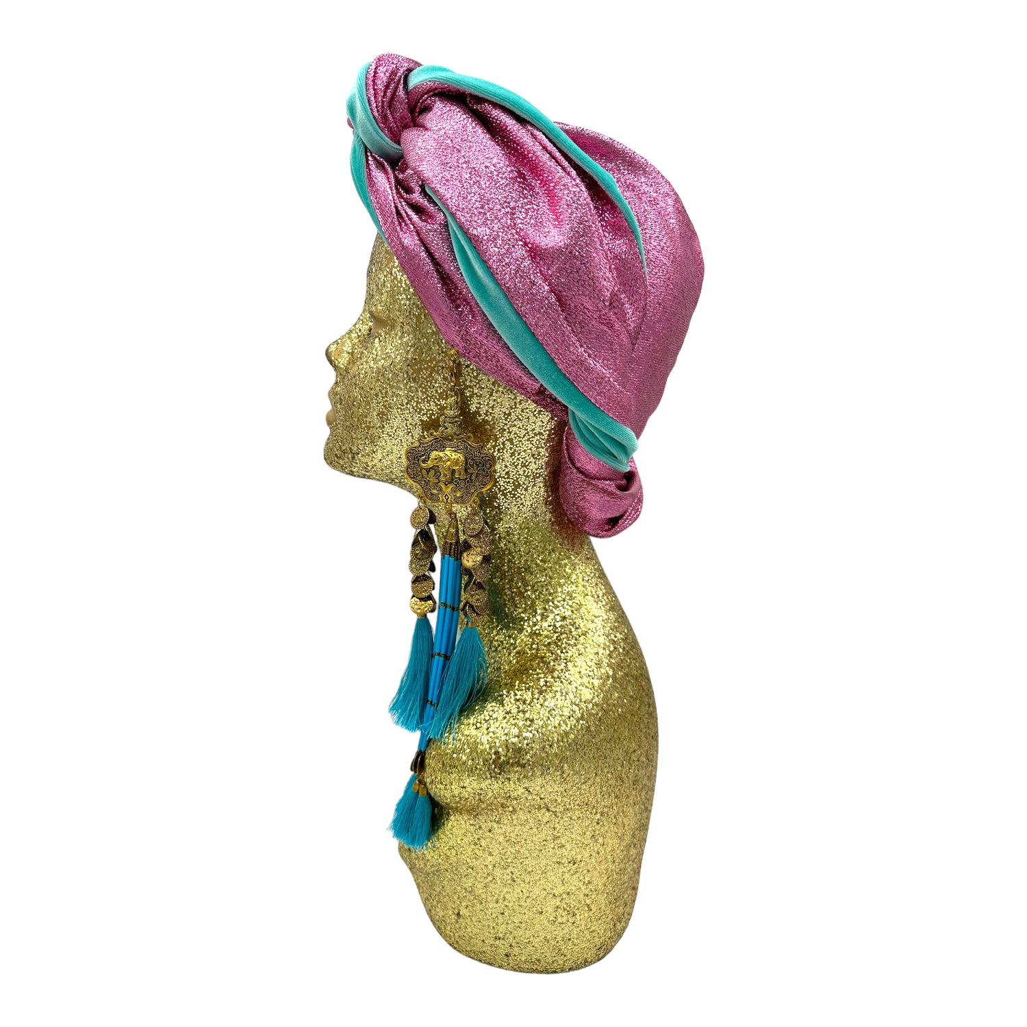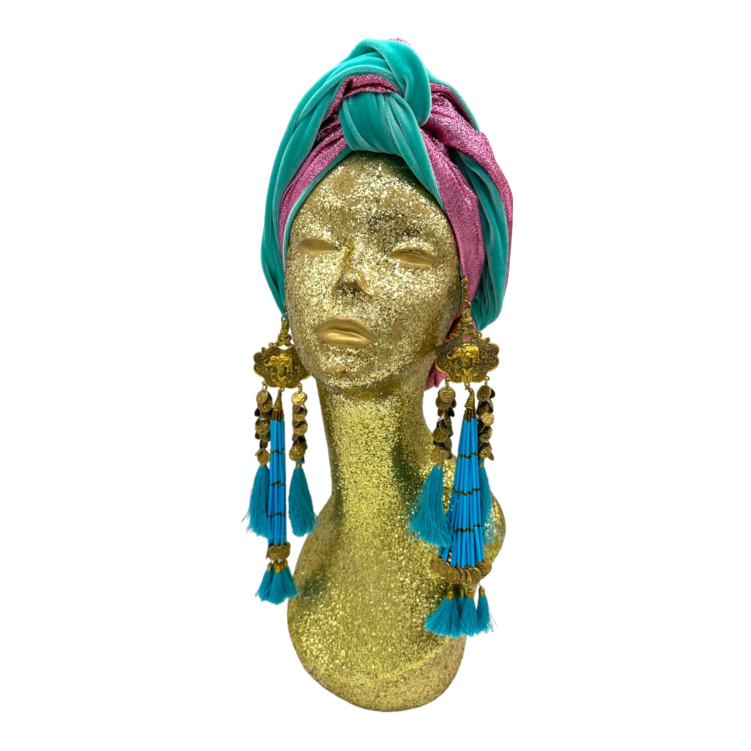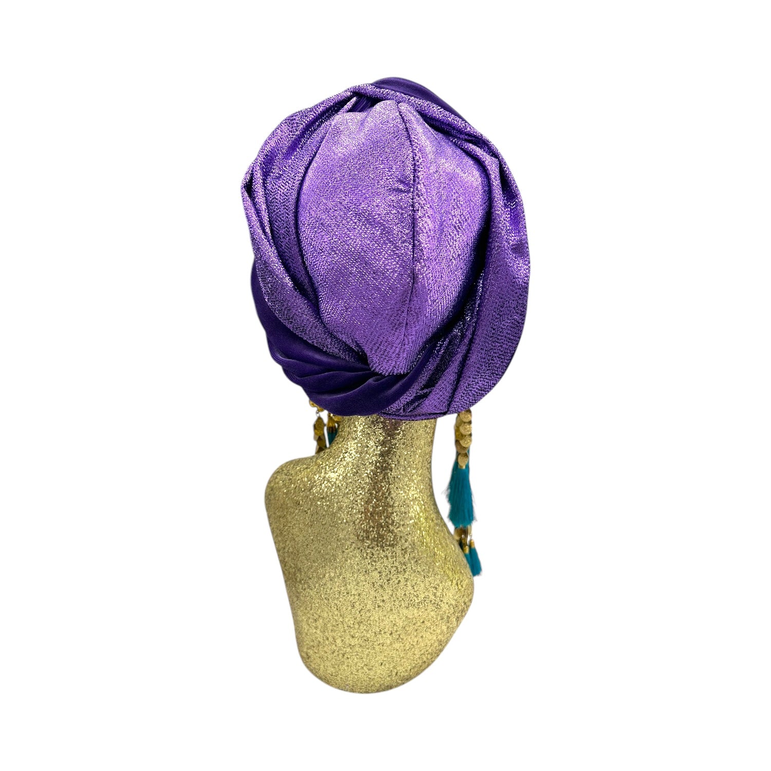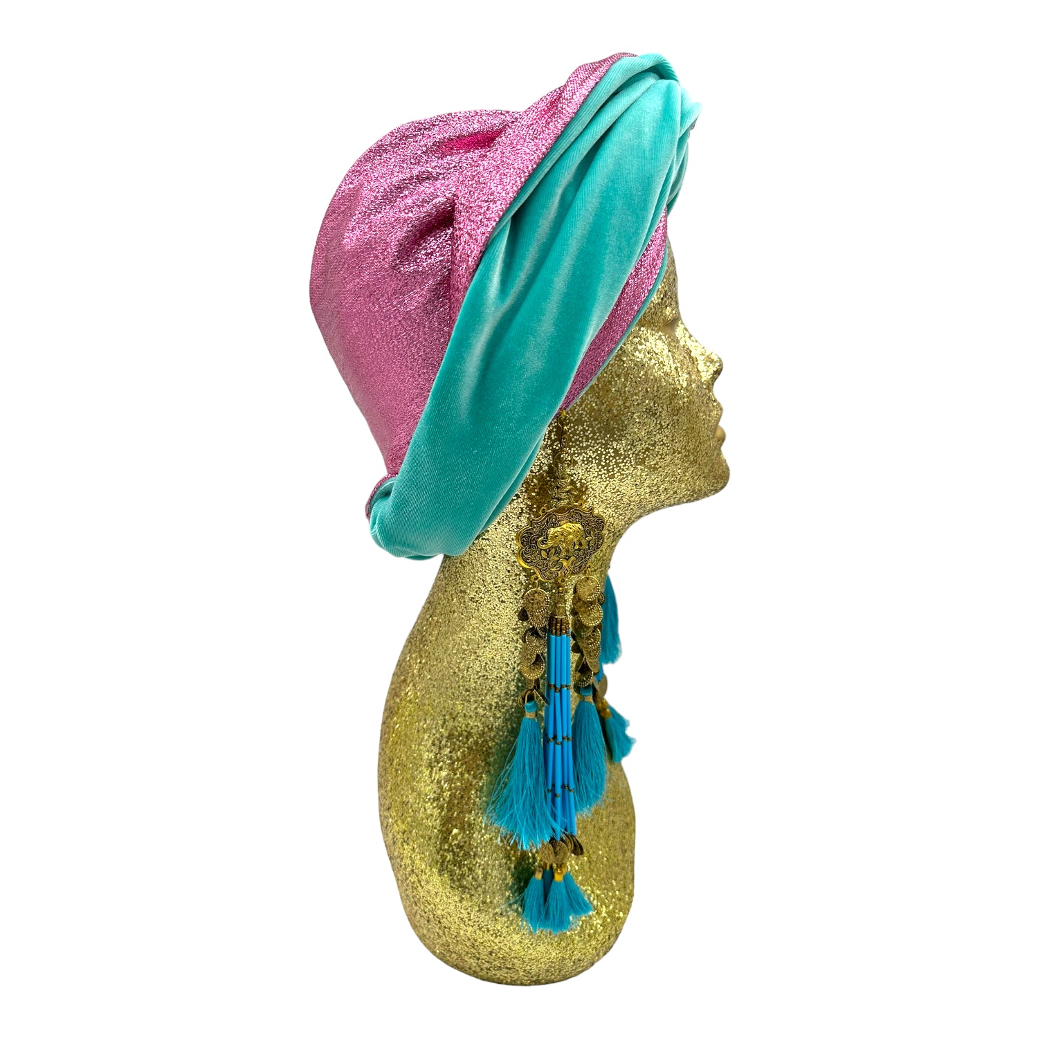 The icing on the cake with this glam reversible turban. wear it full gold glitz or with the soft velour. The tassels are removable and can be worn with our other tassel styles. The tassels are made by artisans in India and turbans with love in Los Angeles.