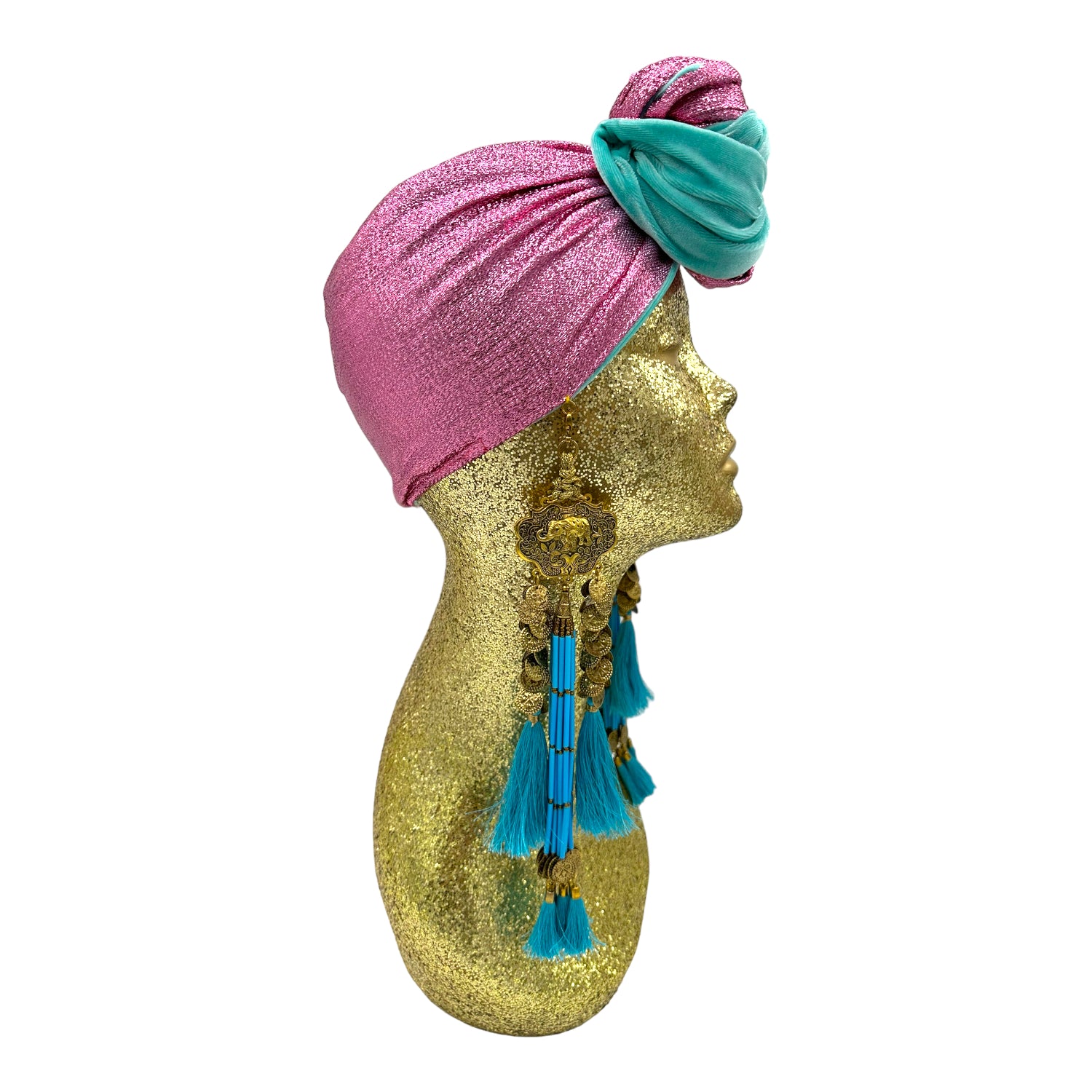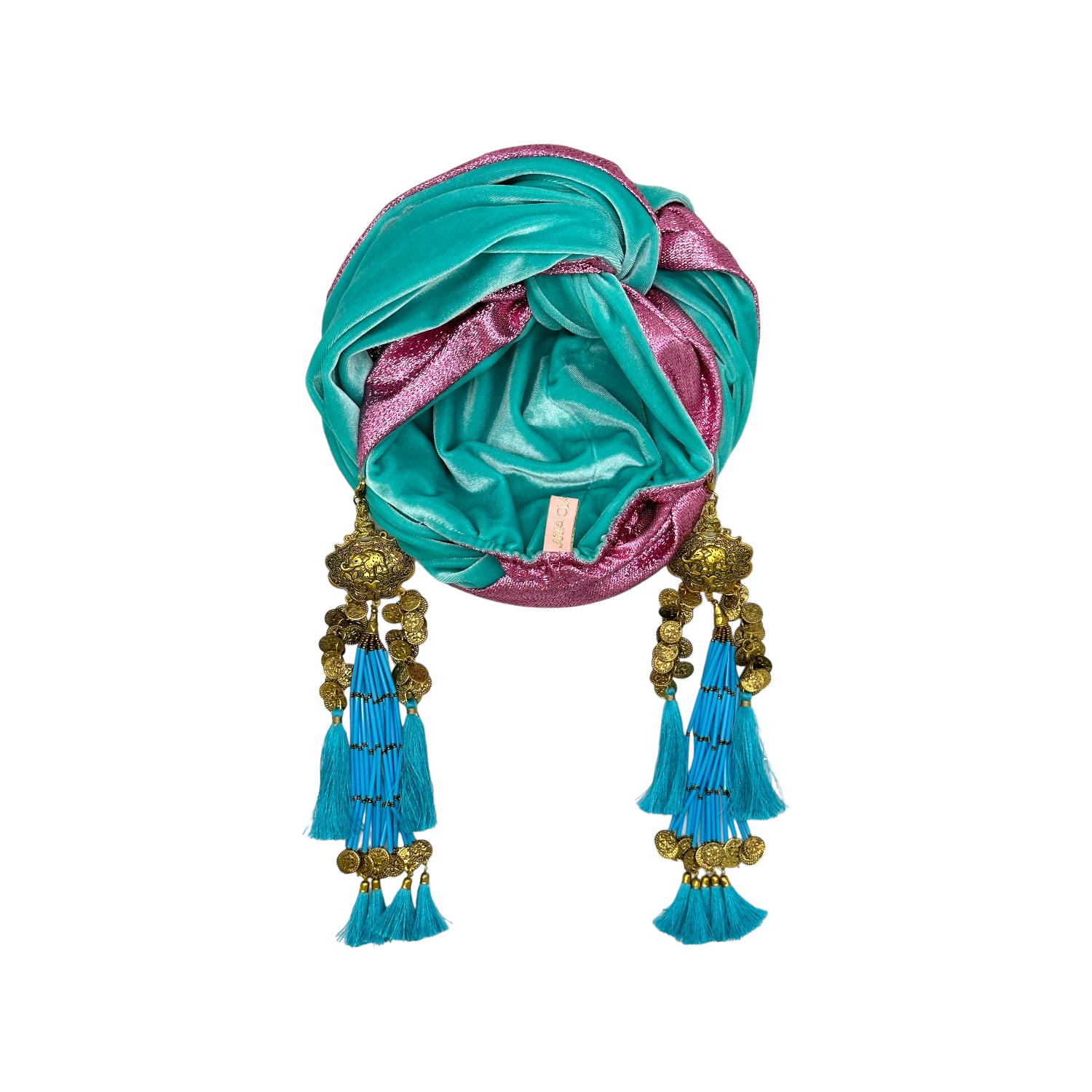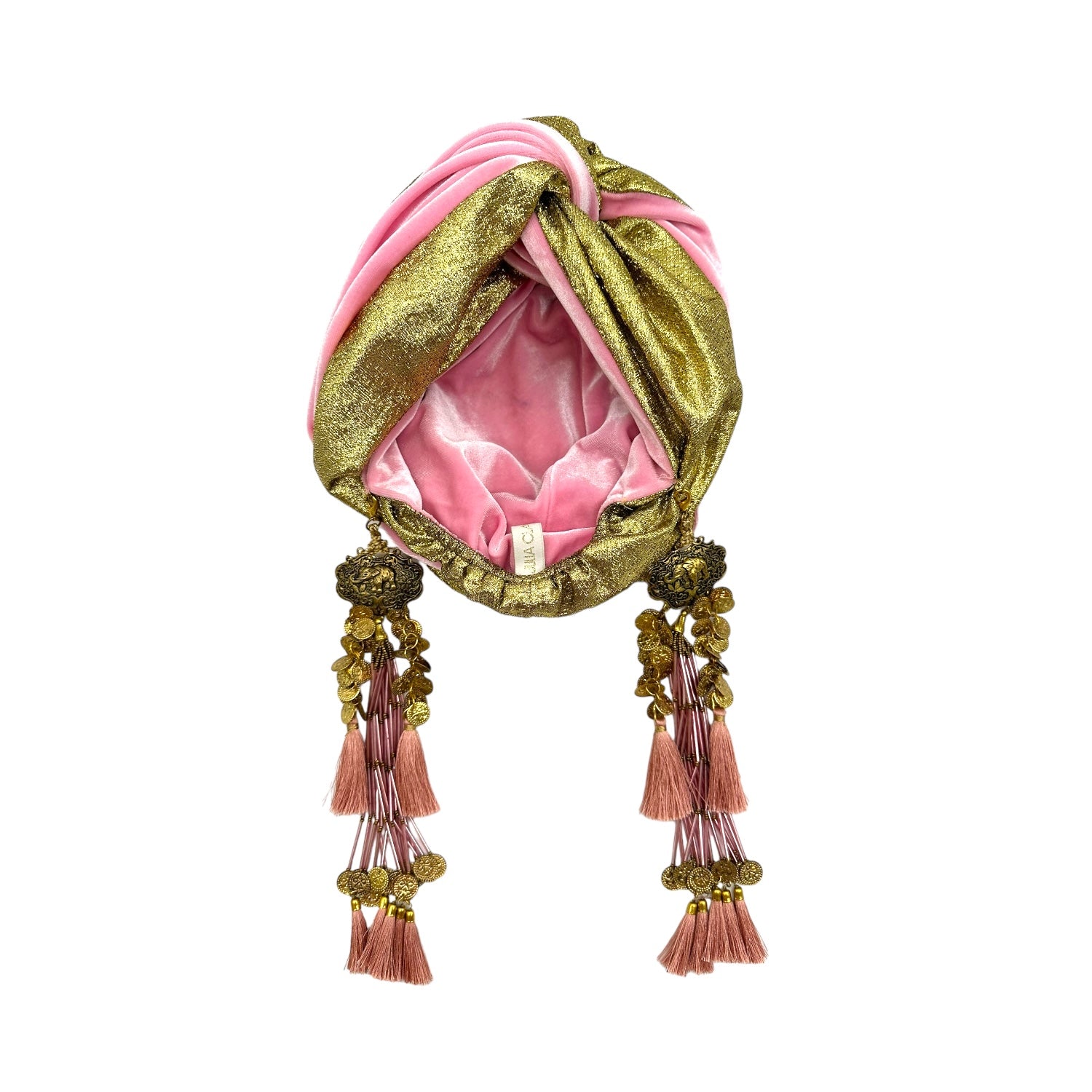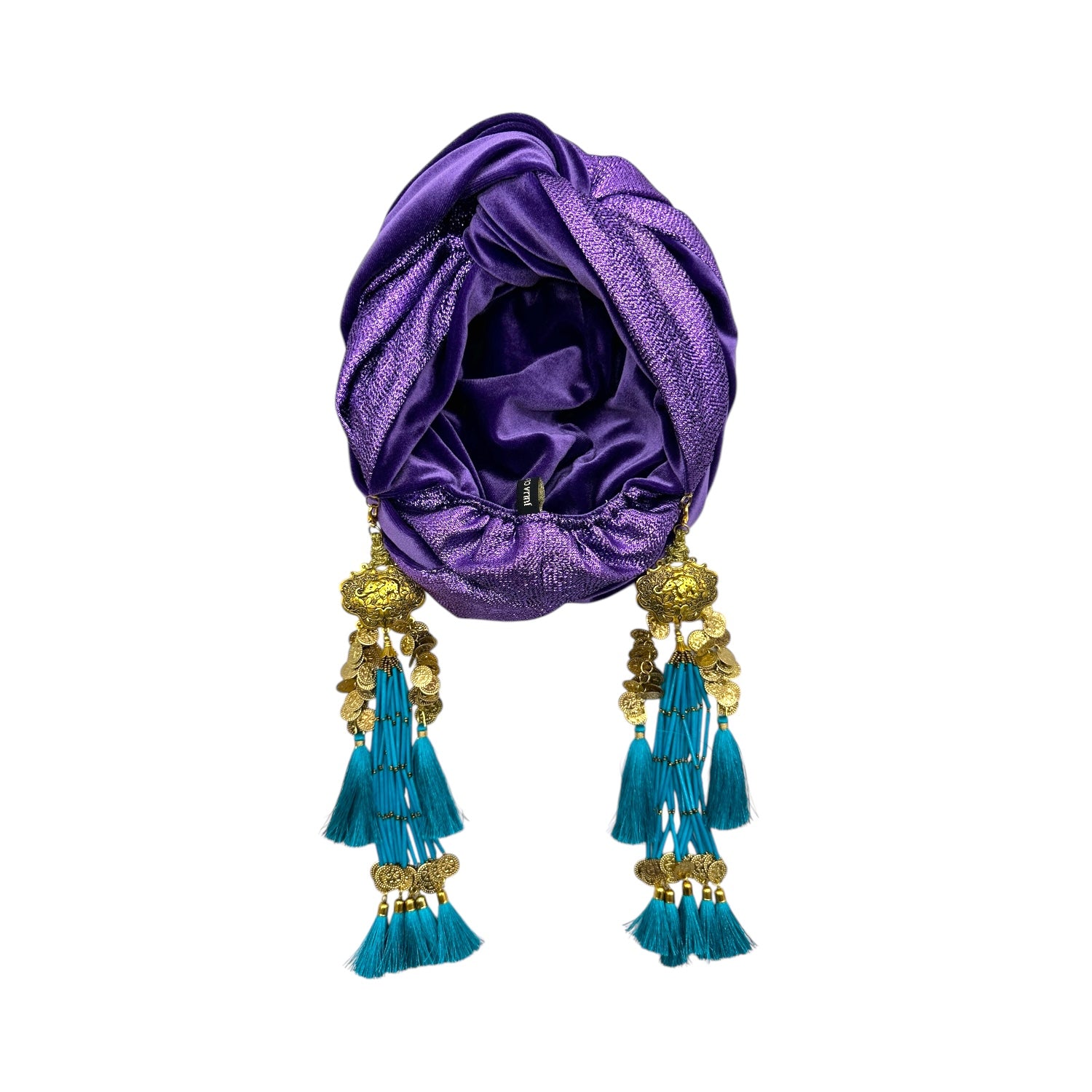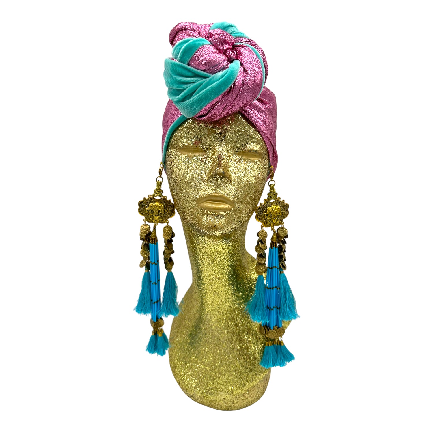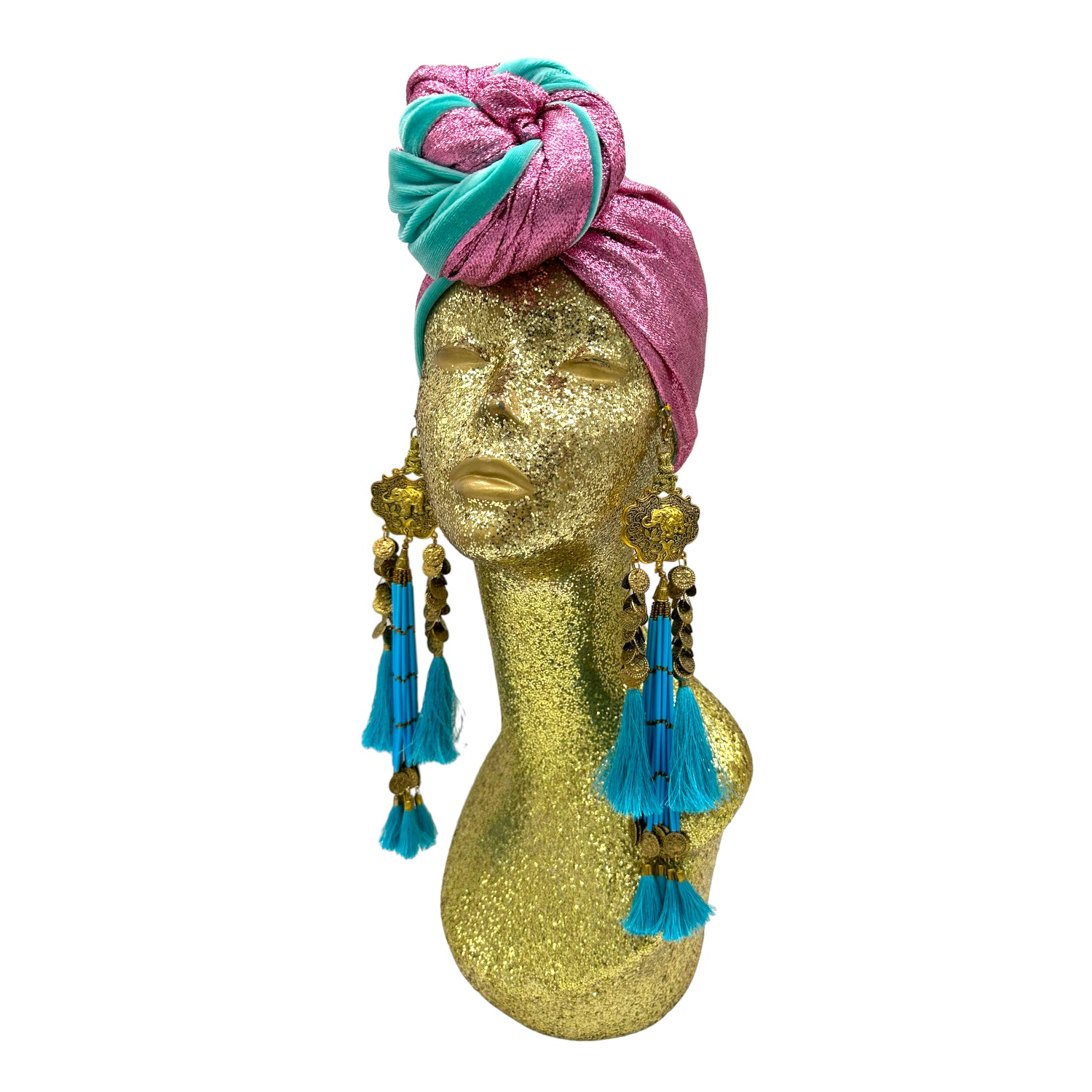 The icing on the cake with this glam reversible turban. wear it full gold glitz or with the soft velour. The tassels are removable and can be worn with our other tassel styles. The tassels are made by artisans in India and turbans with love in Los Angeles.