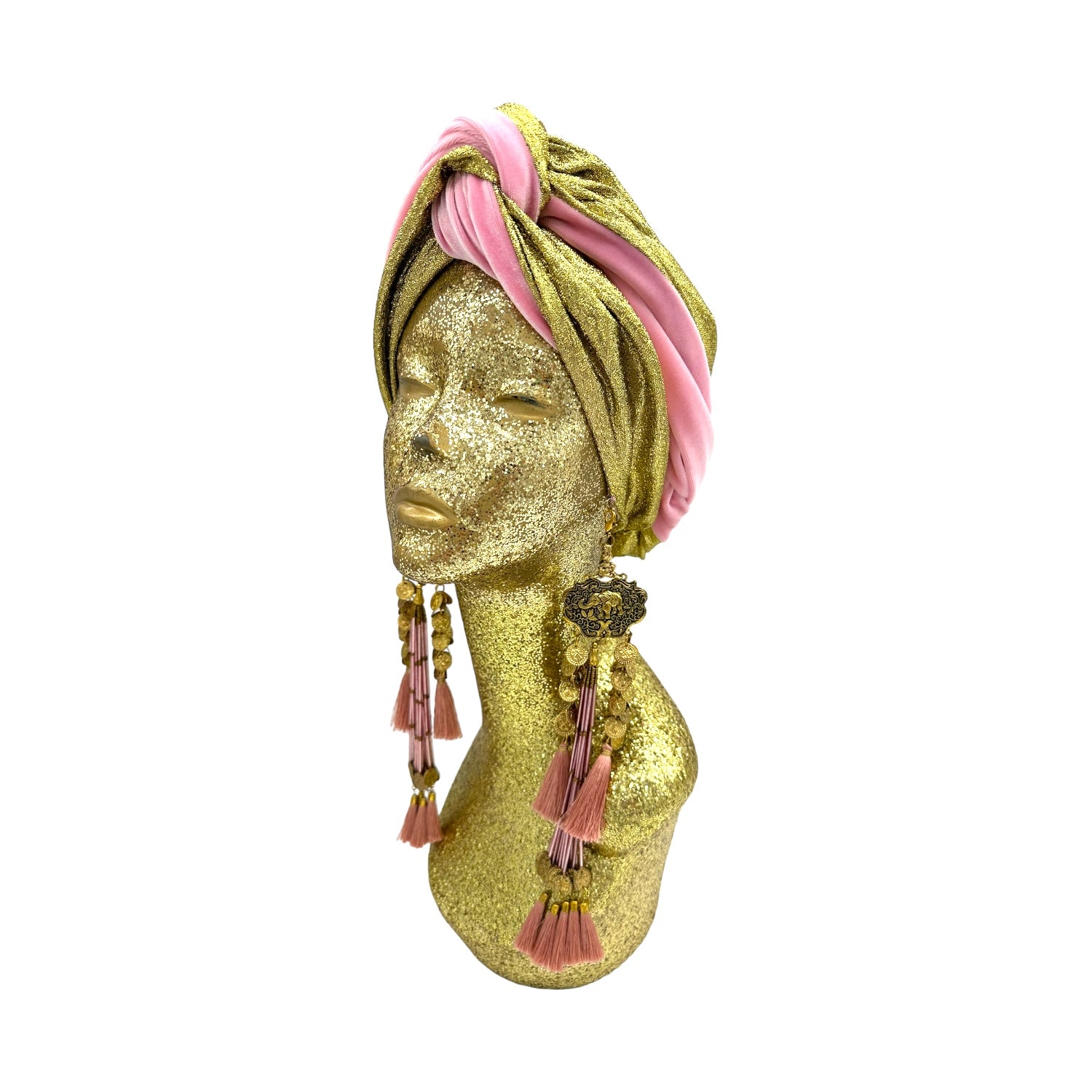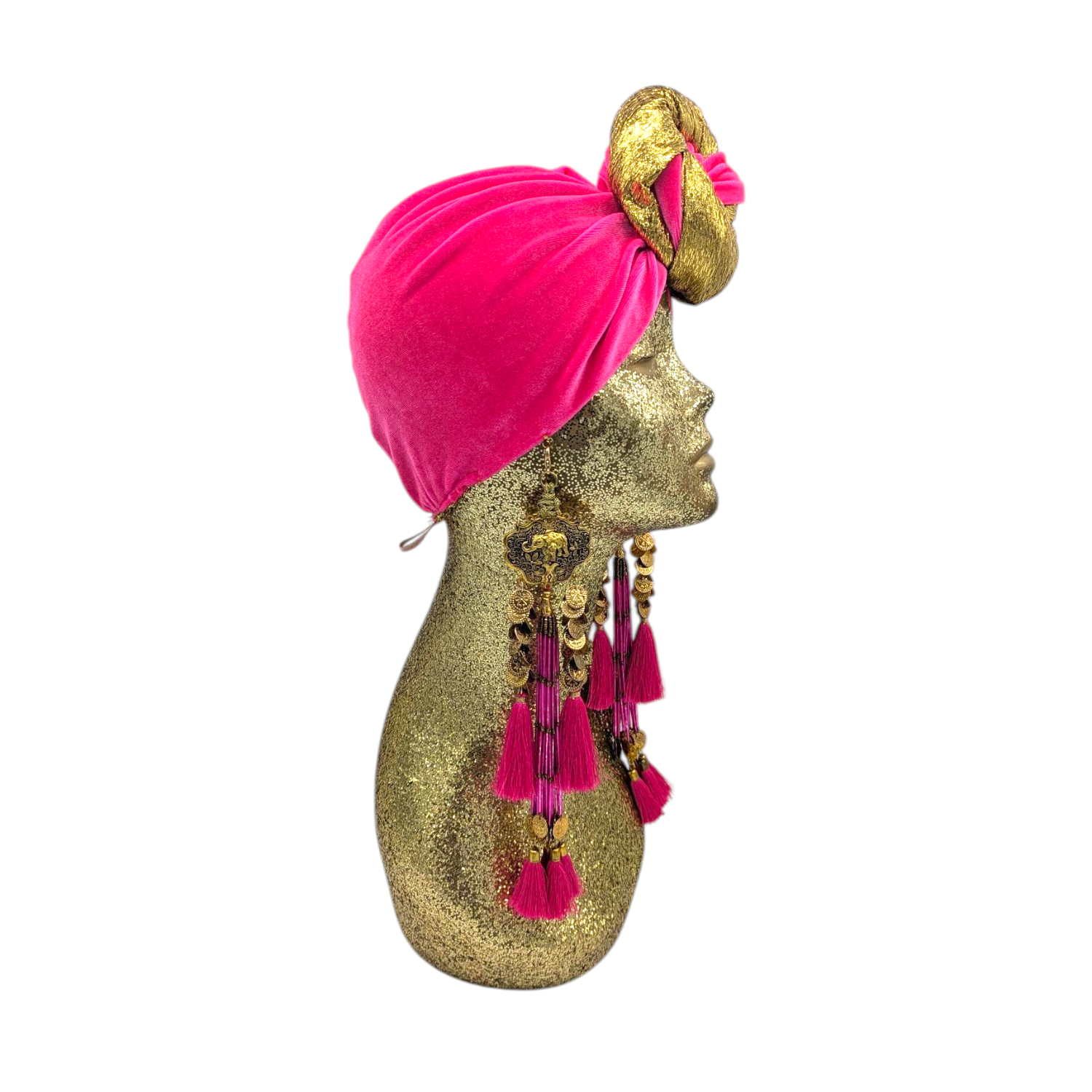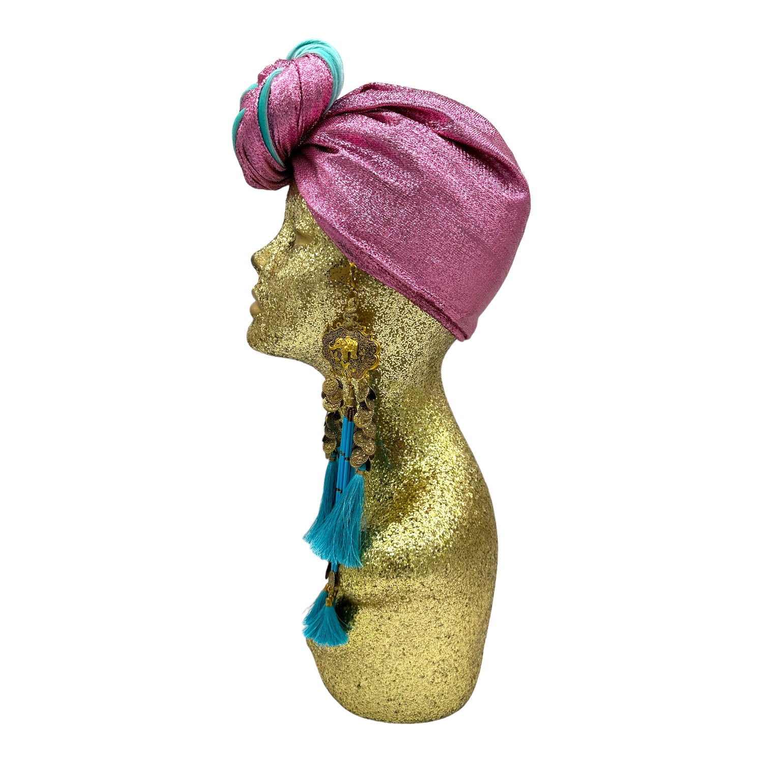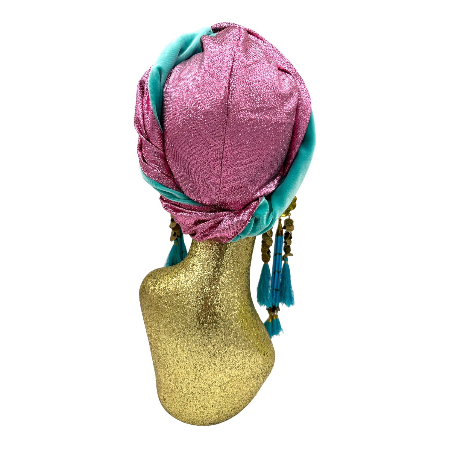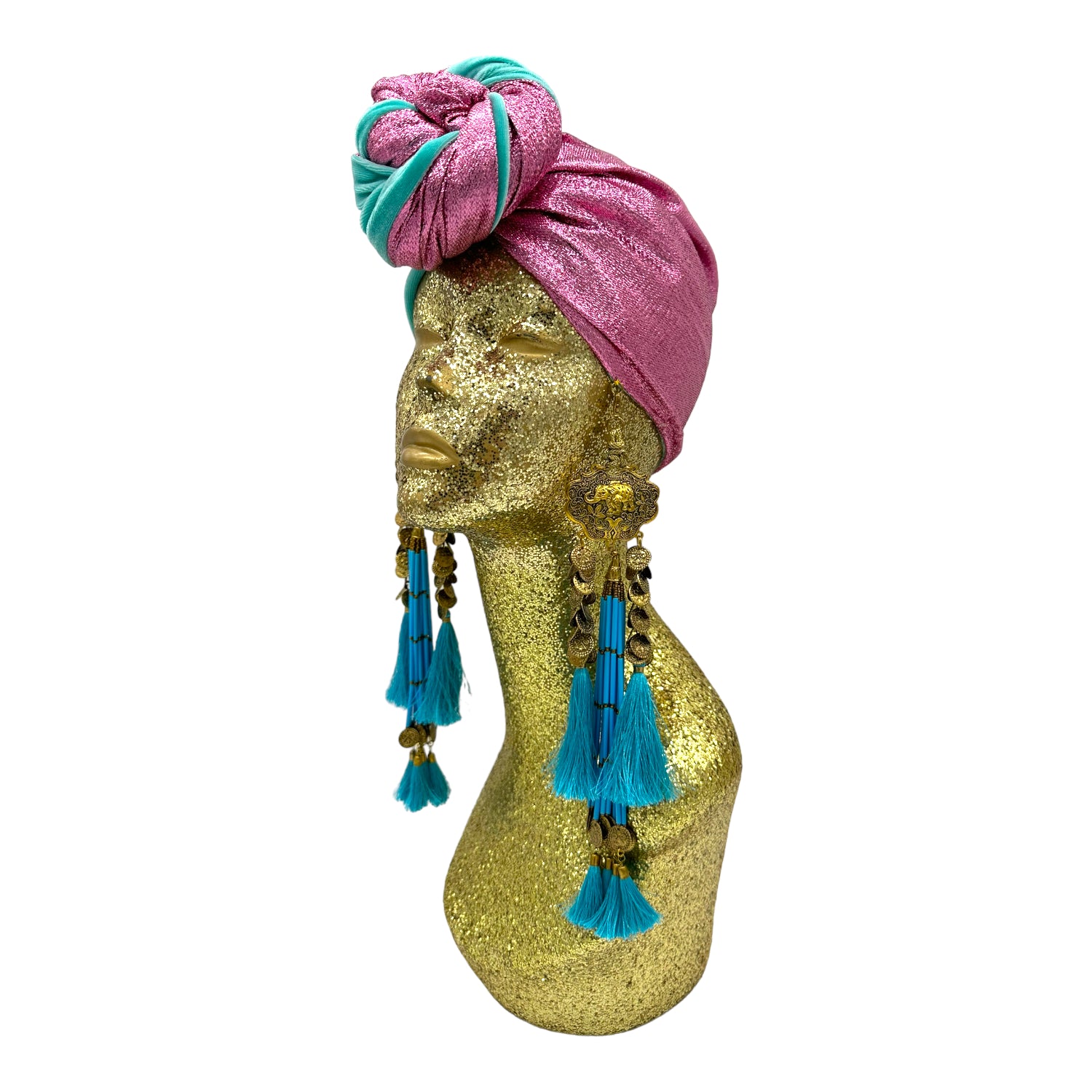The icing on the cake with this glam reversible turban. wear it full gold glitz or with the soft velour. The tassels are removable and can be worn with our other tassel styles. The tassels are made by artisans in India and turbans with love in Los Angeles.
