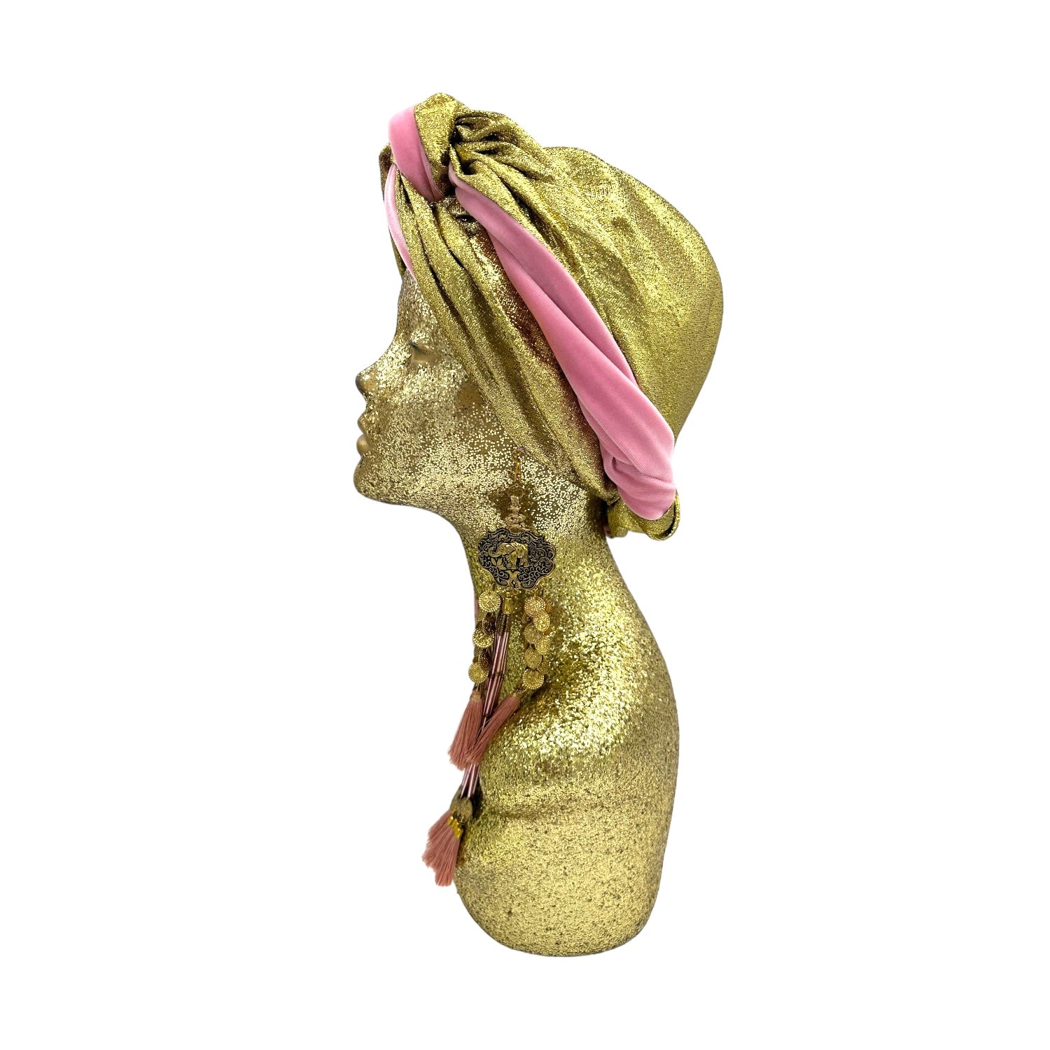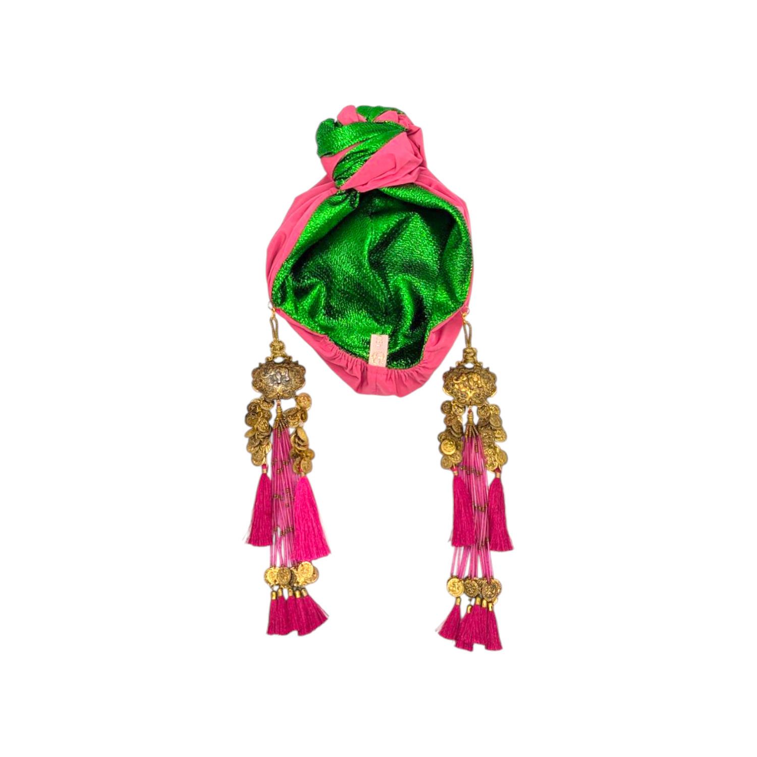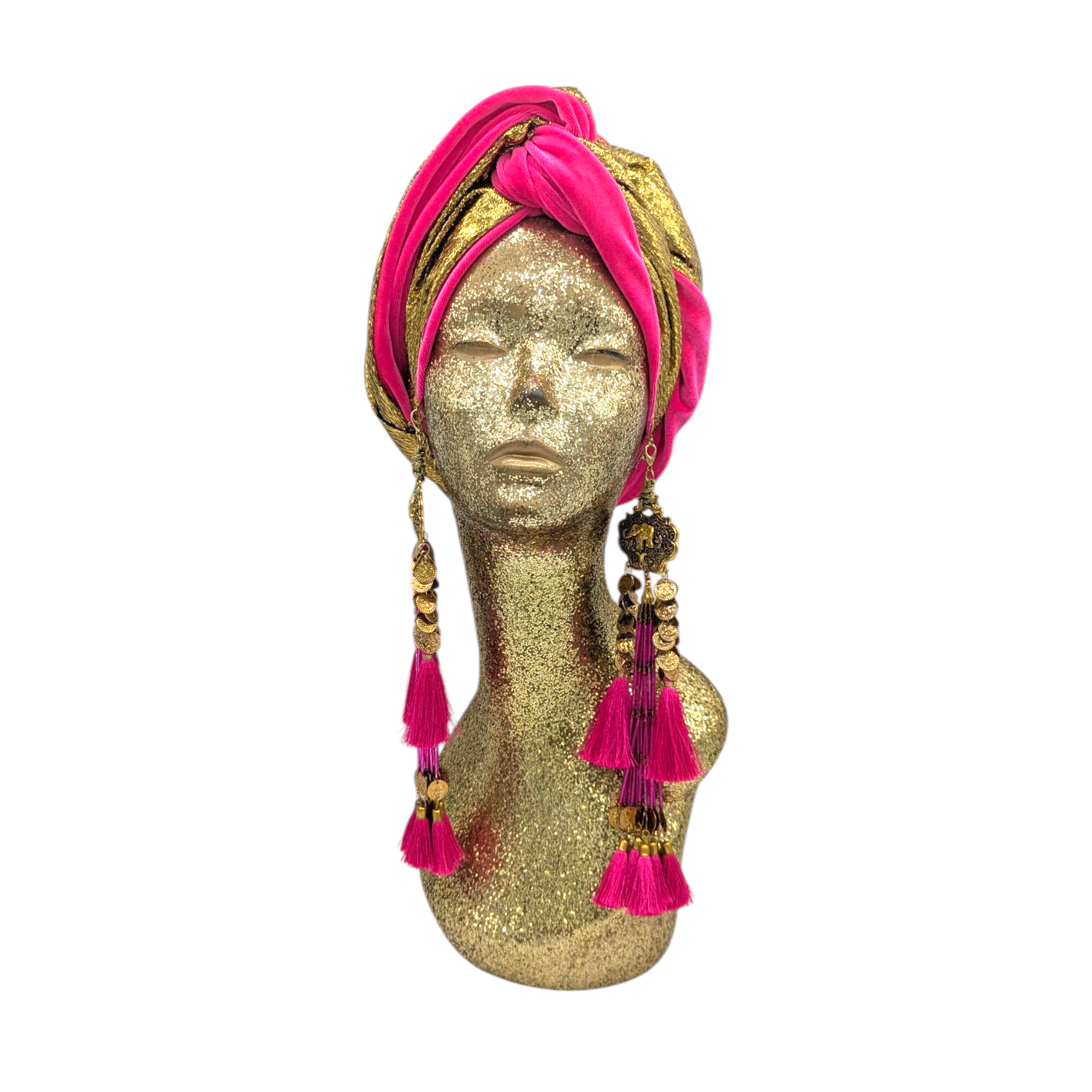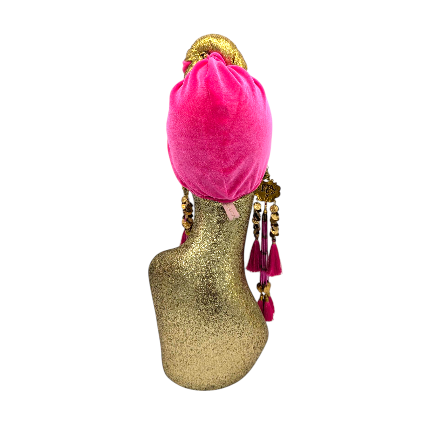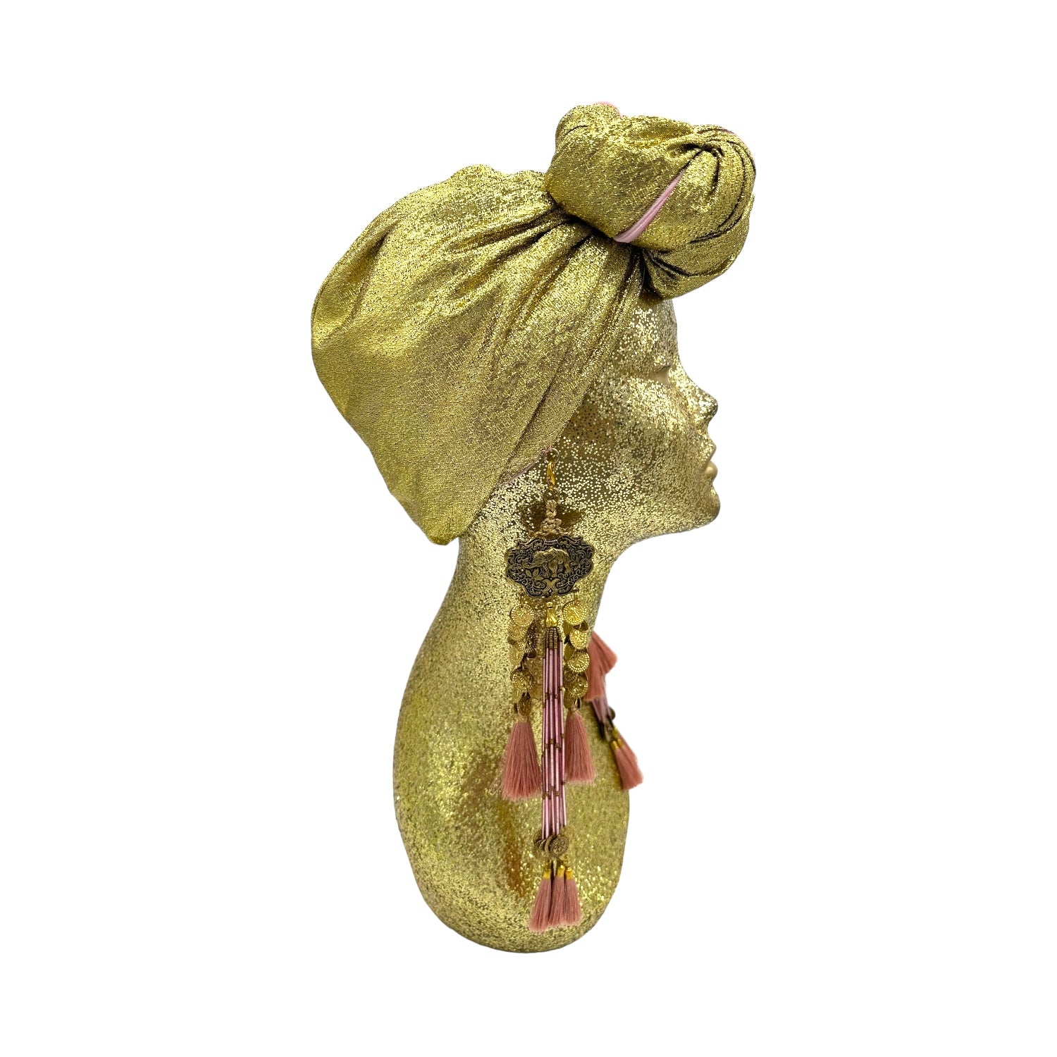 The icing on the cake with this glam reversible turban. wear it full gold glitz or with the soft velour. The tassels are removable and can be worn with our other tassel styles. The tassels are made by artisans in India and turbans with love in Los Angeles.