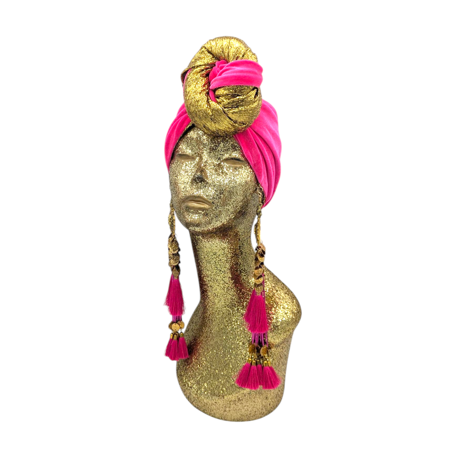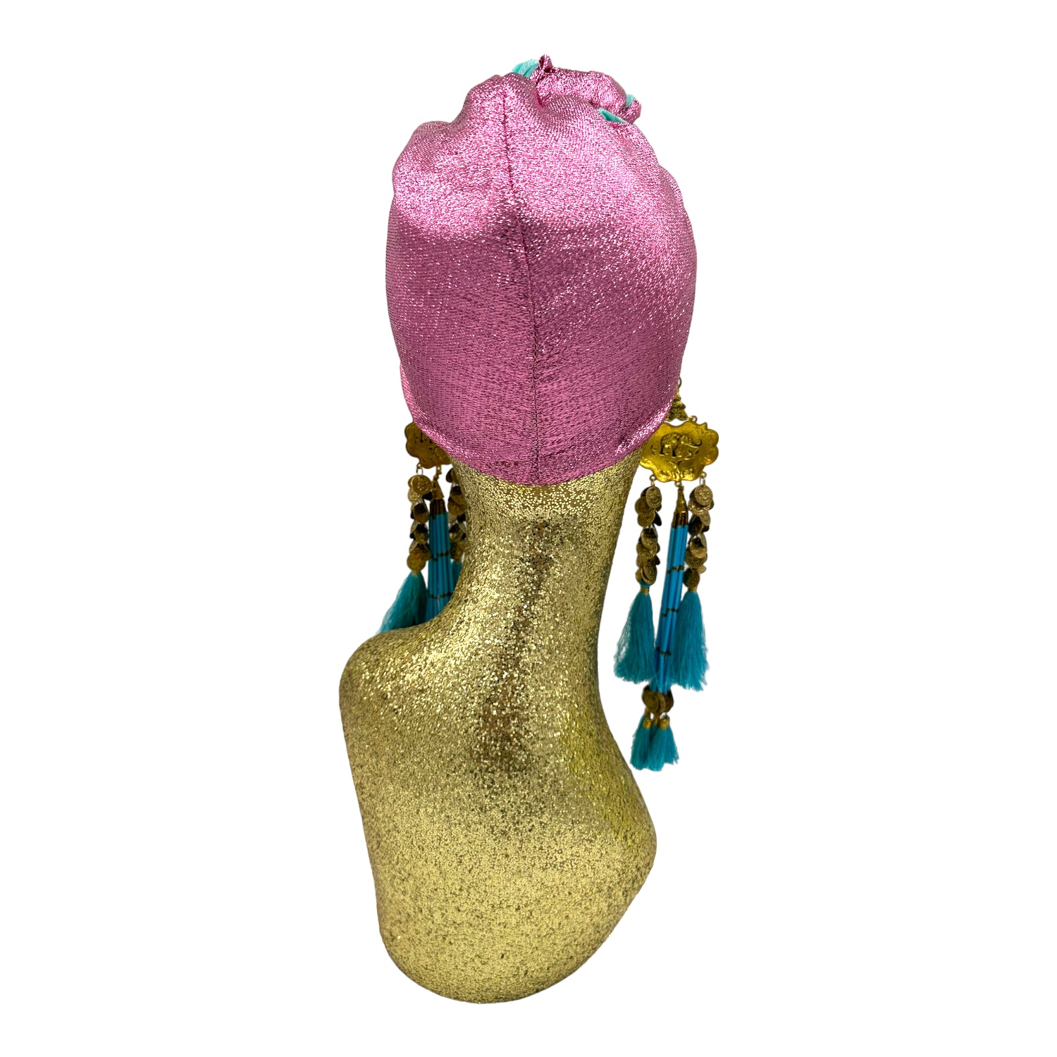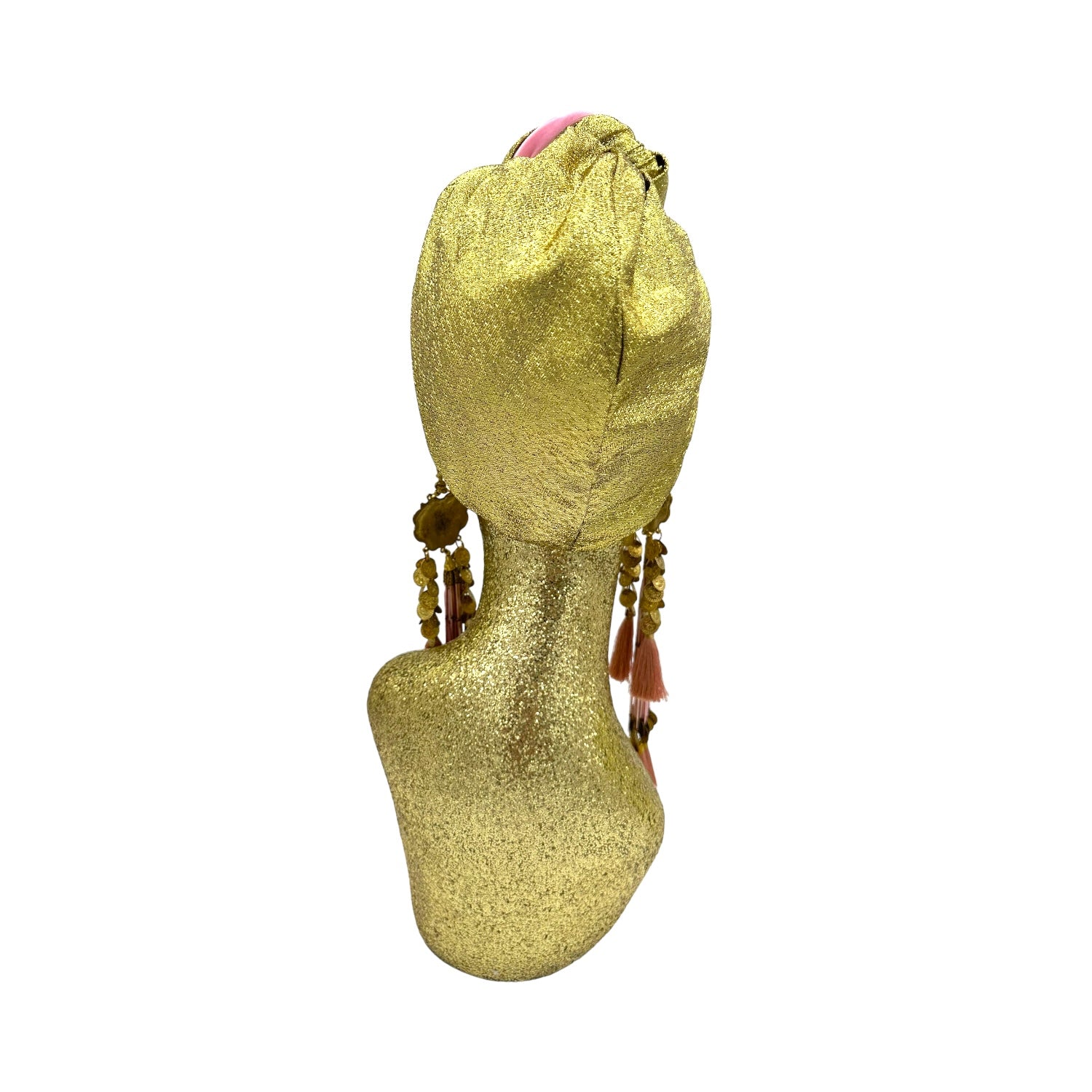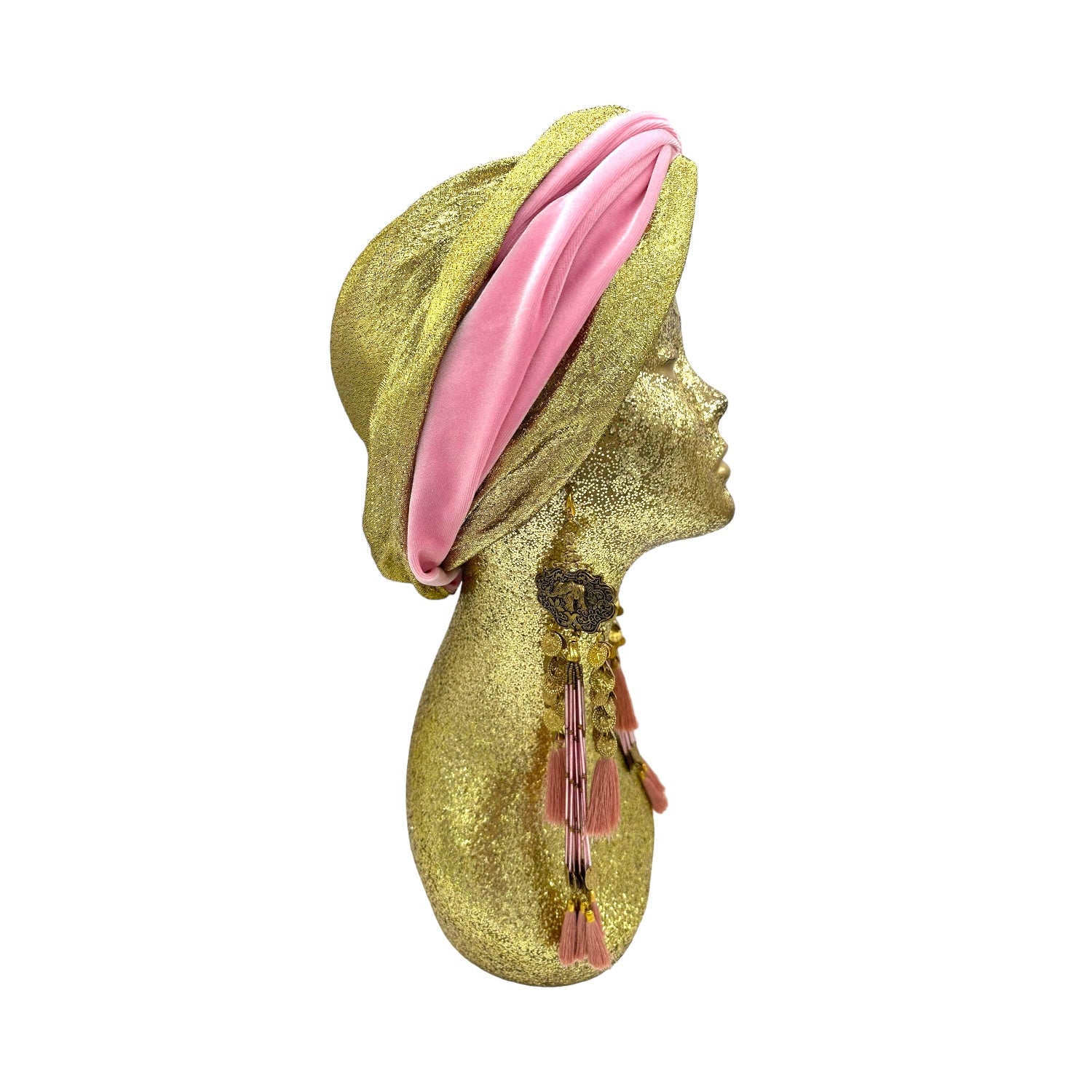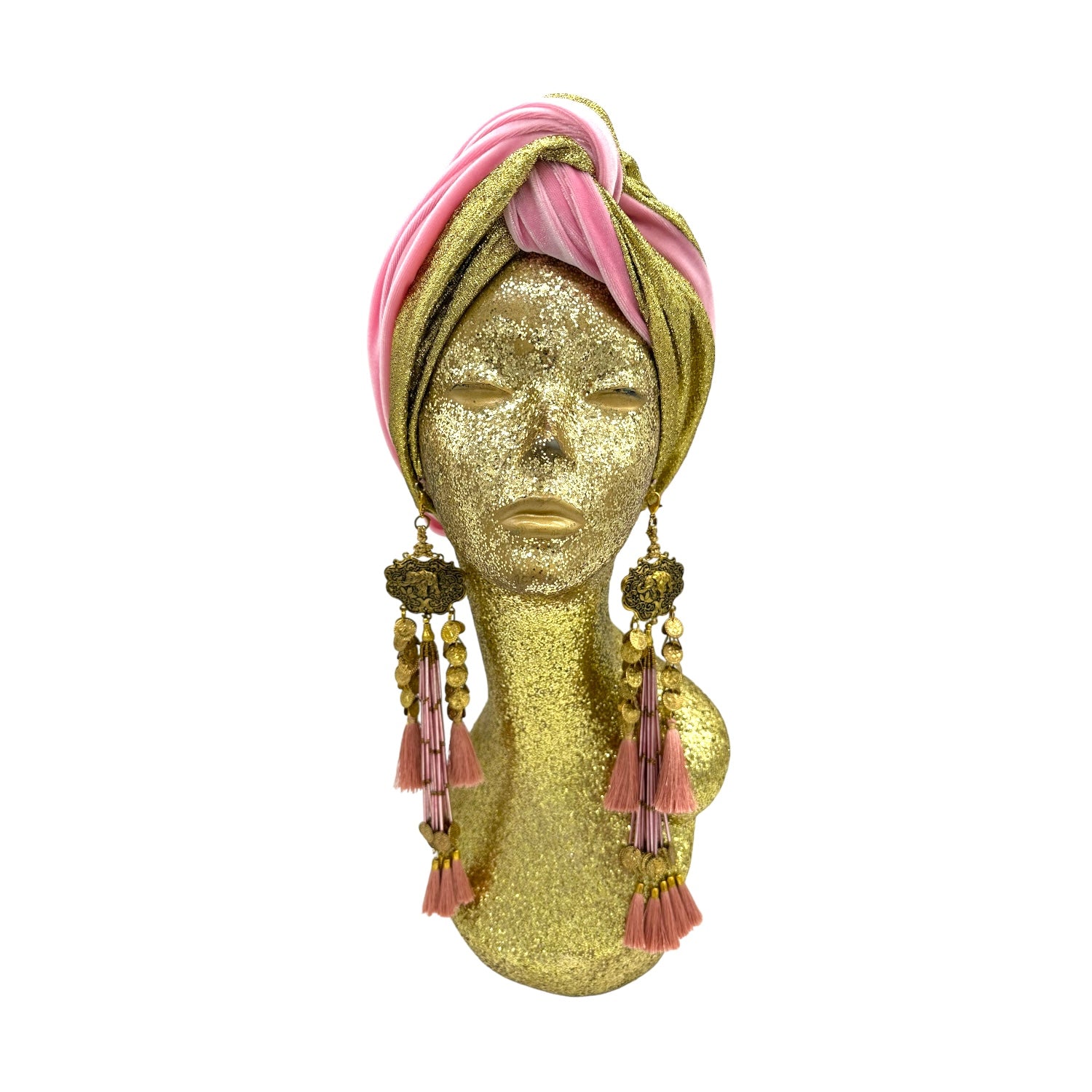 The icing on the cake with this glam reversible turban. wear it full gold glitz or with the soft velour. The tassels are removable and can be worn with our other tassel styles. The tassels are made by artisans in India and turbans with love in Los Angeles.