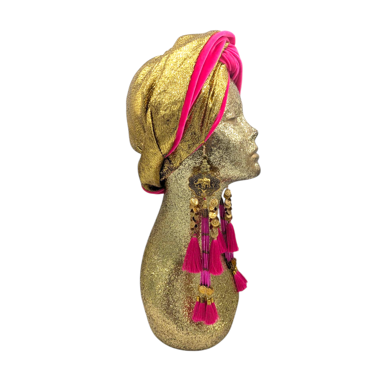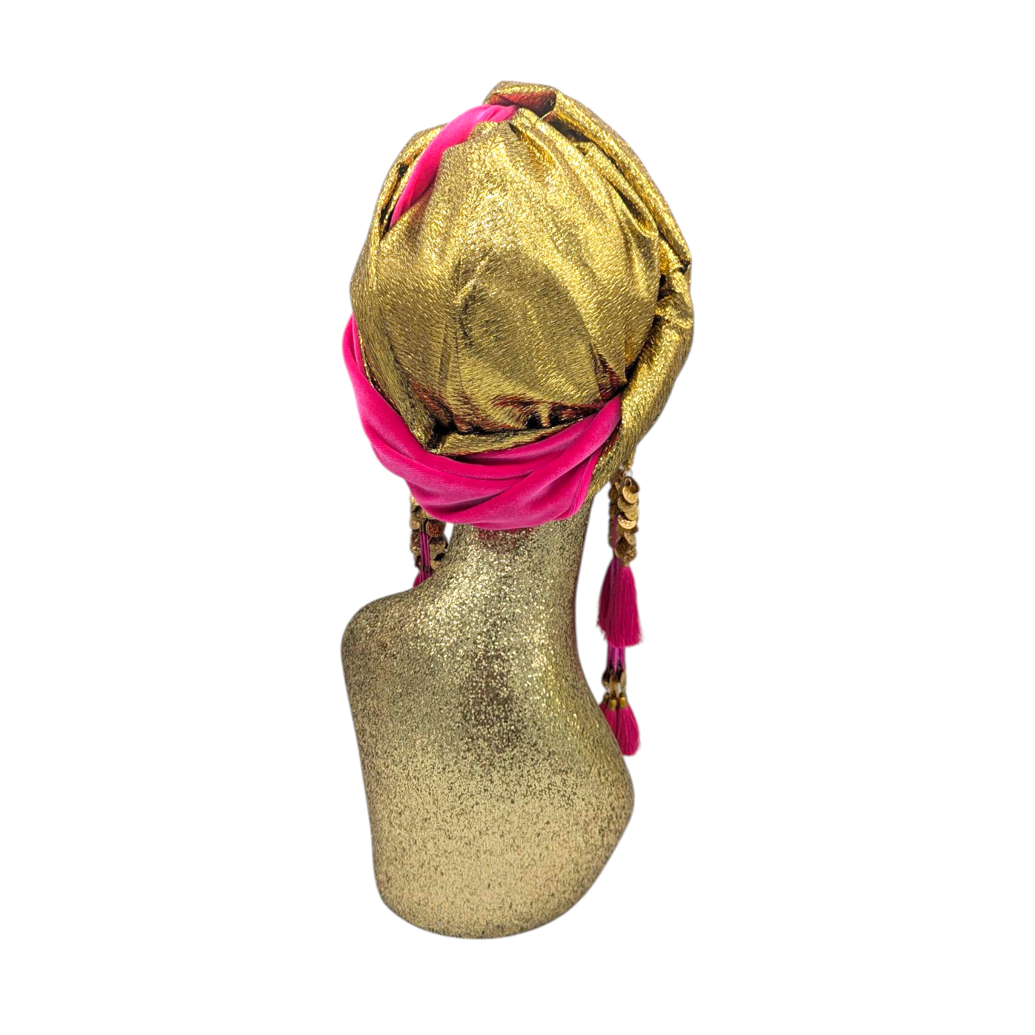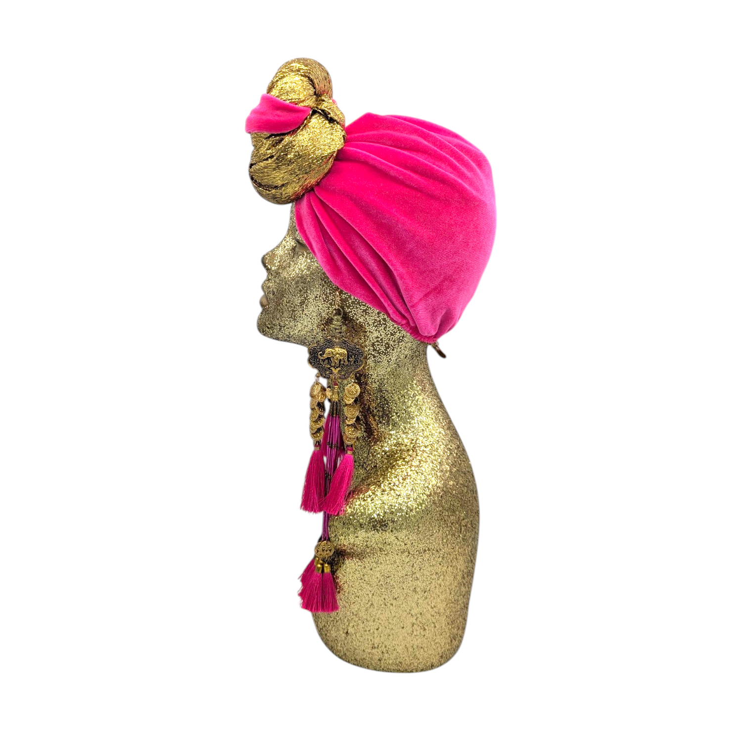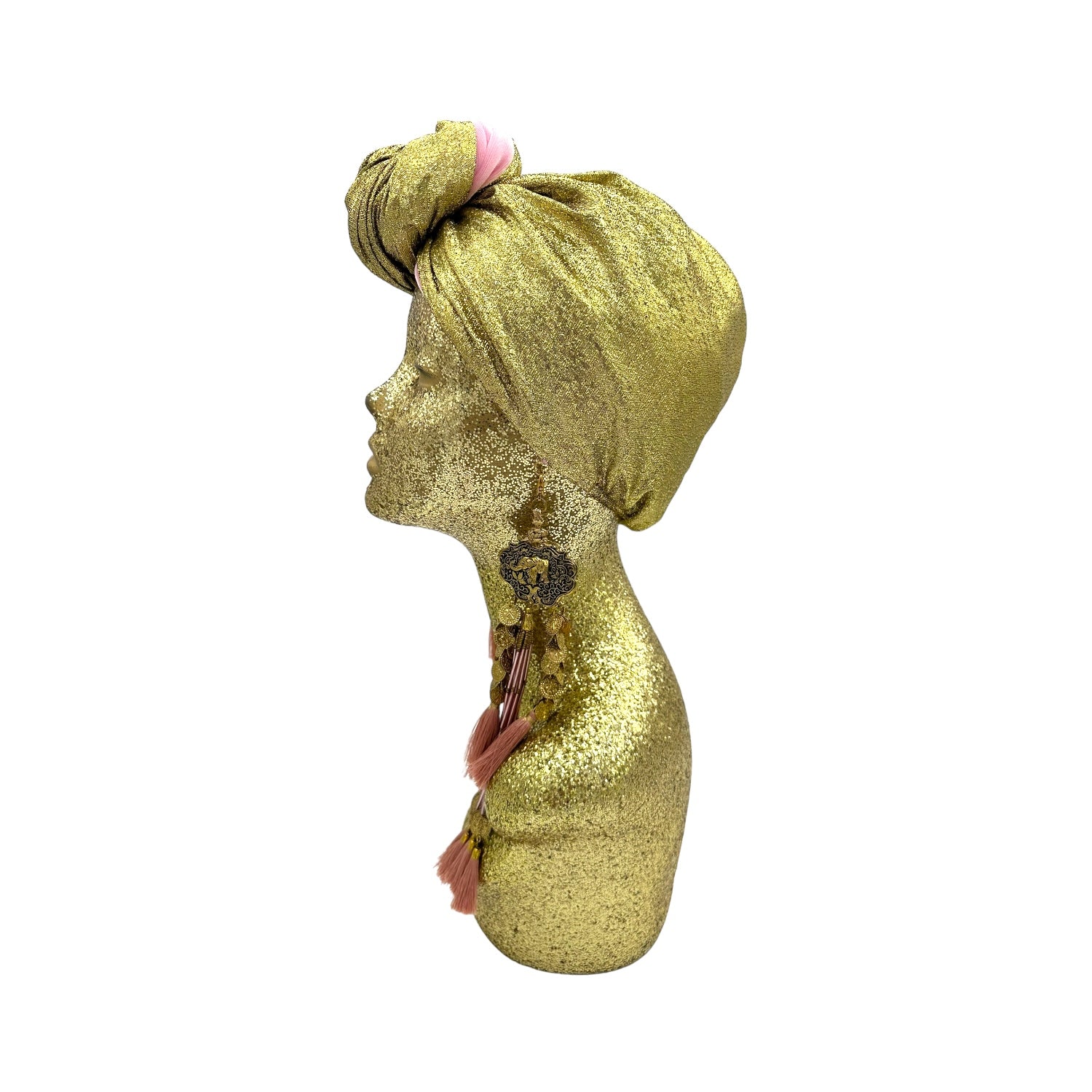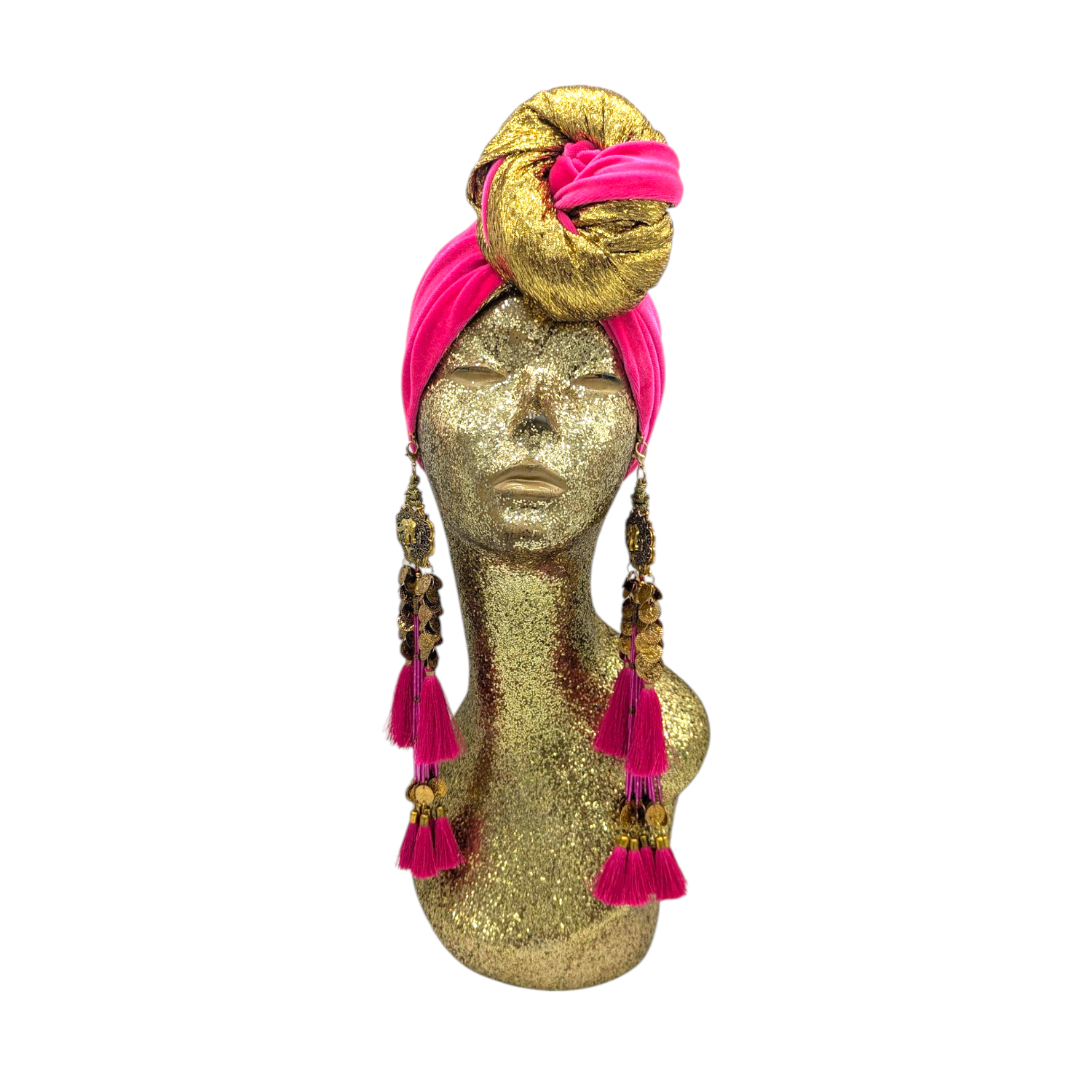 The icing on the cake with this glam reversible turban. wear it full gold glitz or with the soft velour. The tassels are removable and can be worn with our other tassel styles. The tassels are made by artisans in India and turbans with love in Los Angeles.