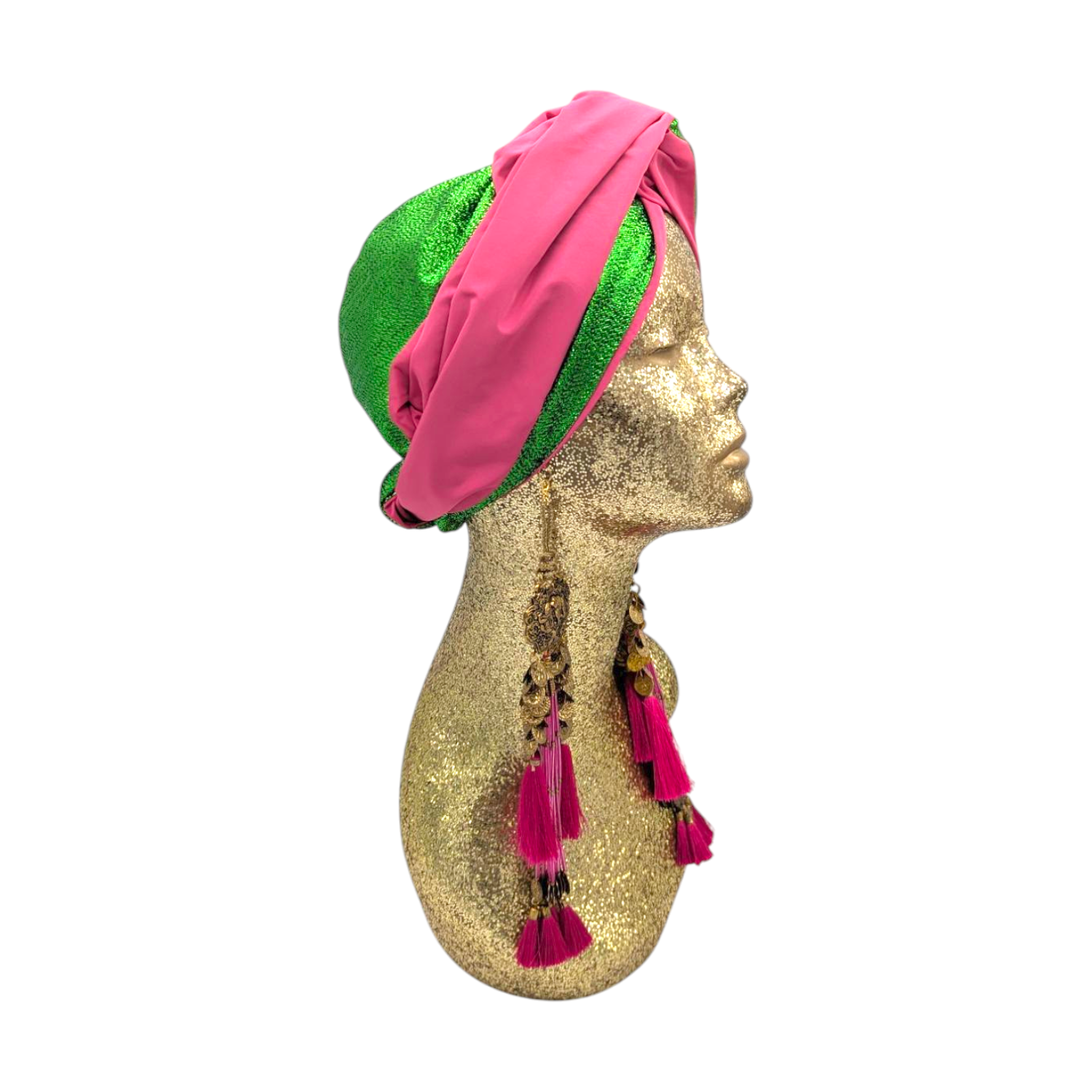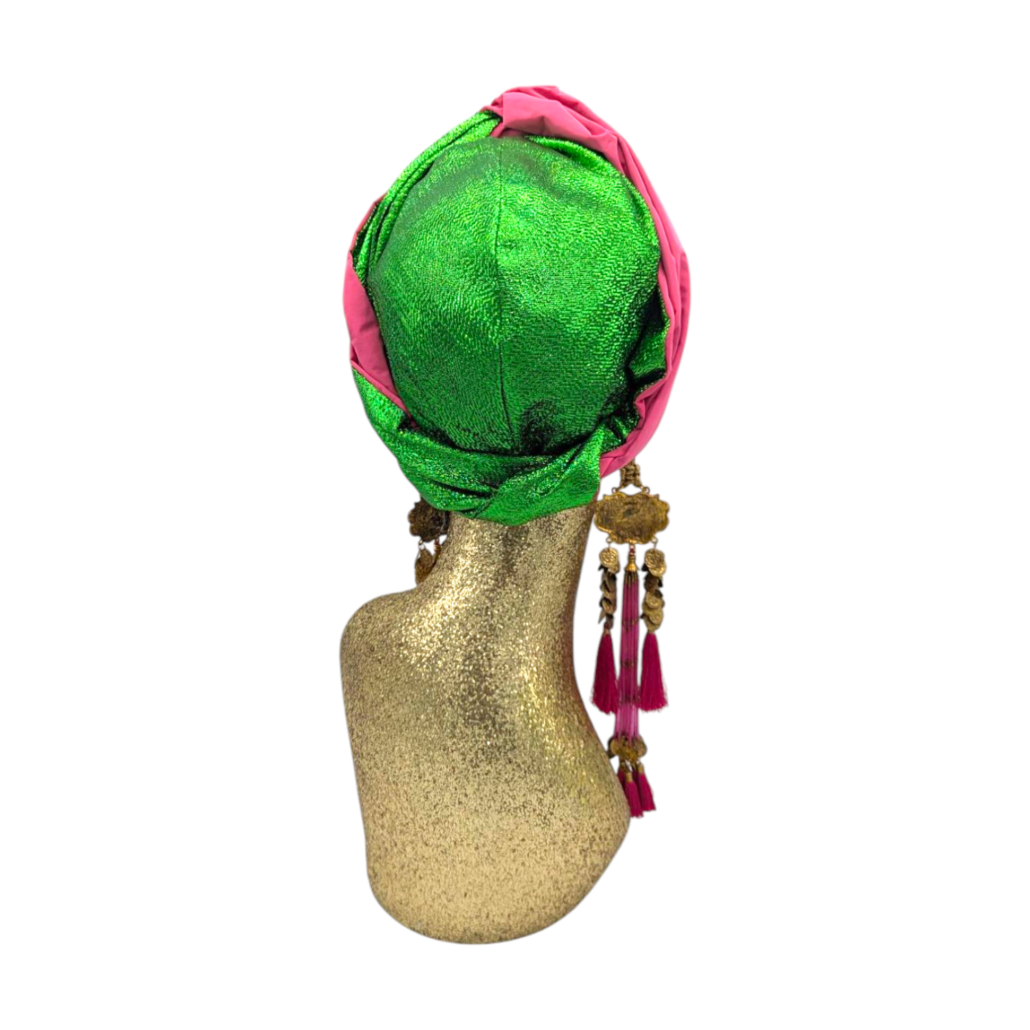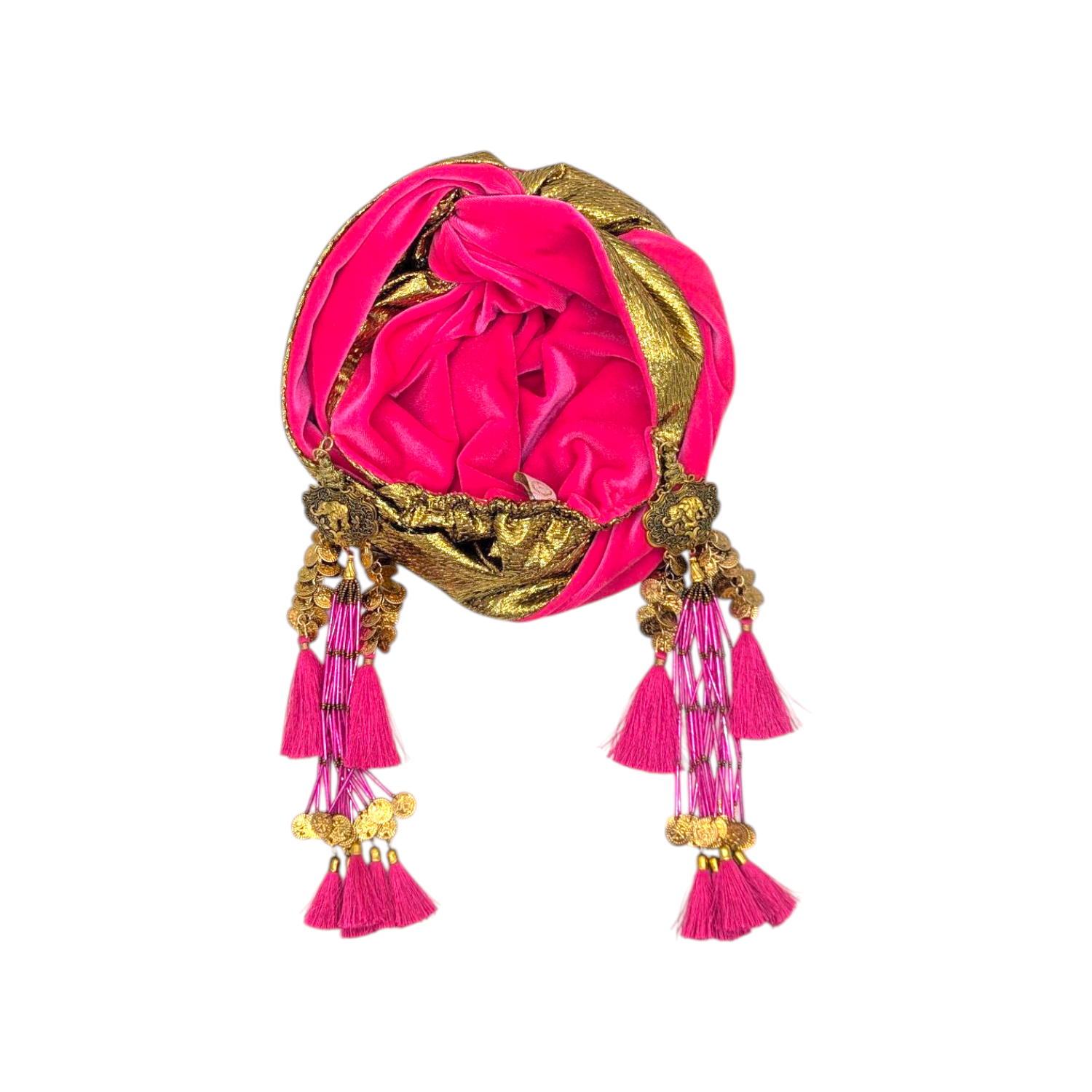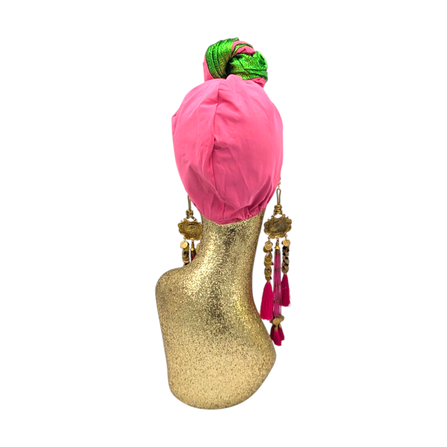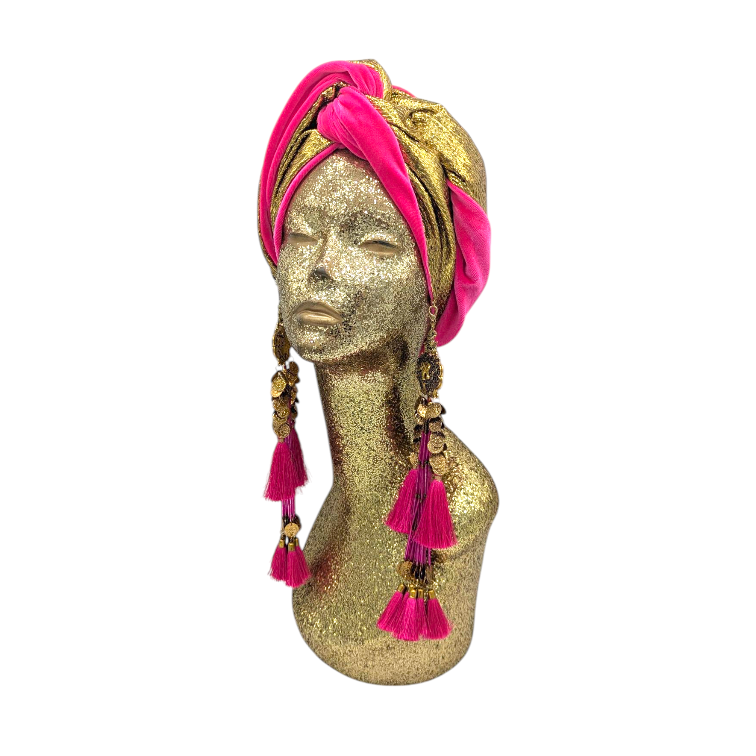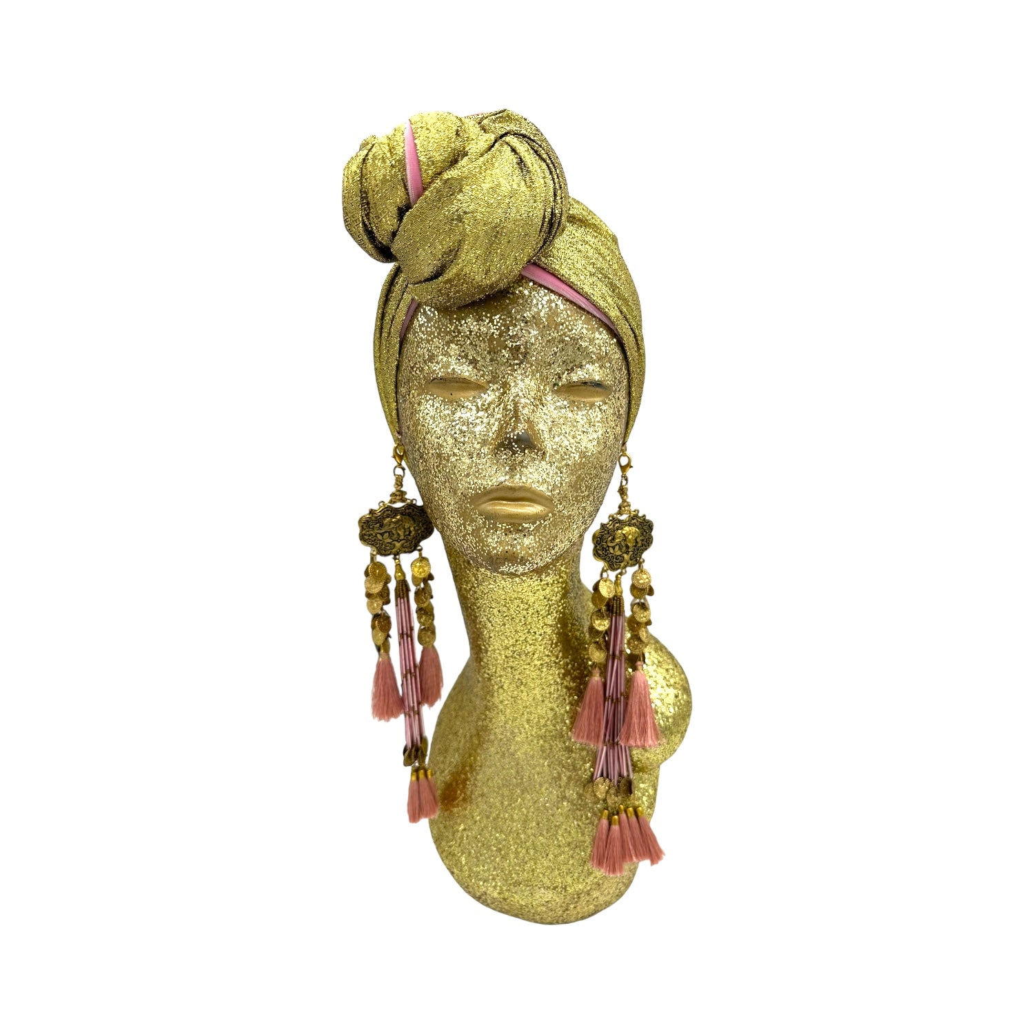 The icing on the cake with this glam reversible turban. wear it full gold glitz or with the soft velour. The tassels are removable and can be worn with our other tassel styles. The tassels are made by artisans in India and turbans with love in Los Angeles.