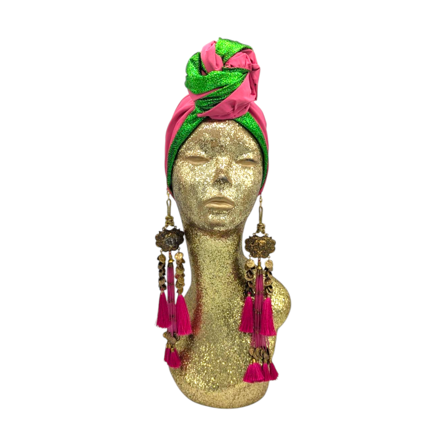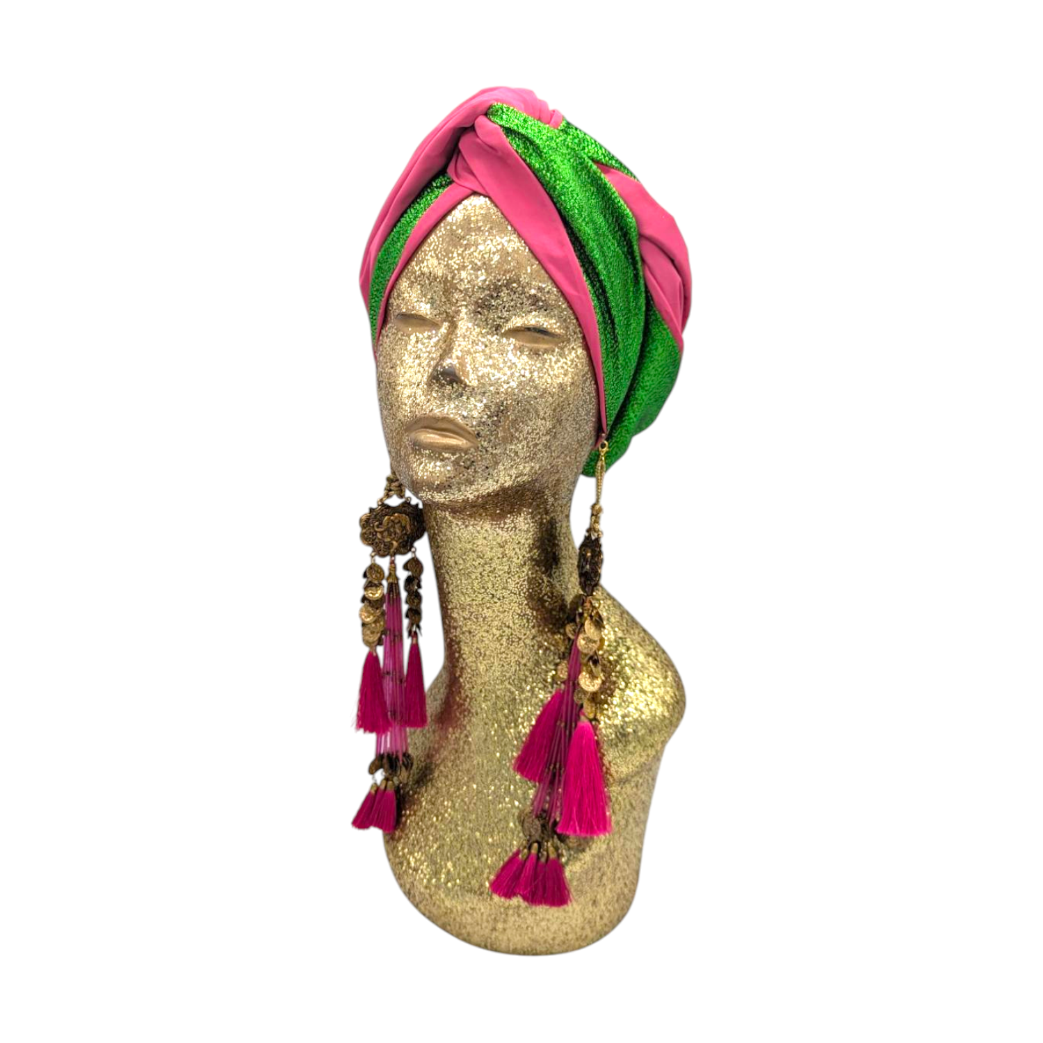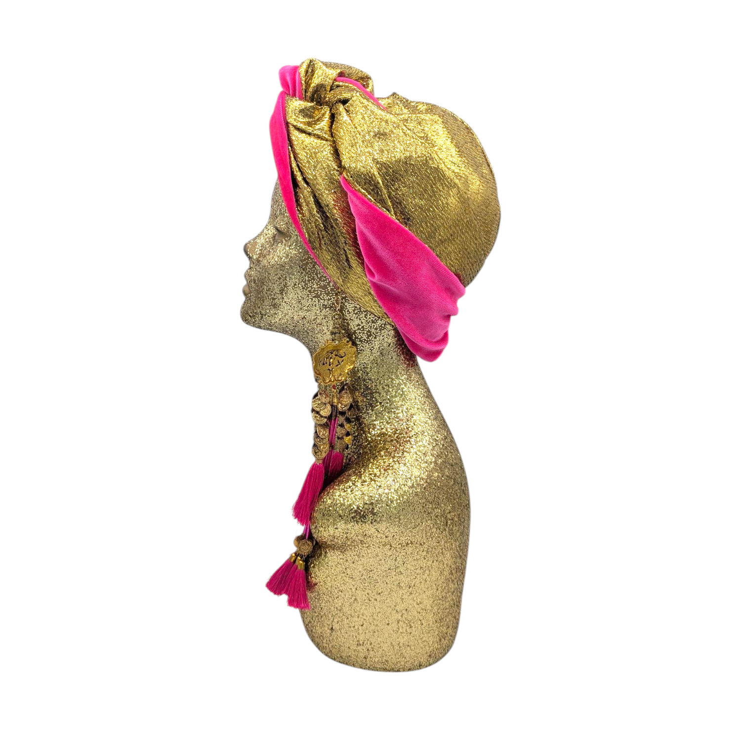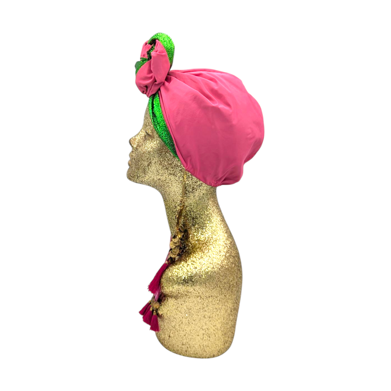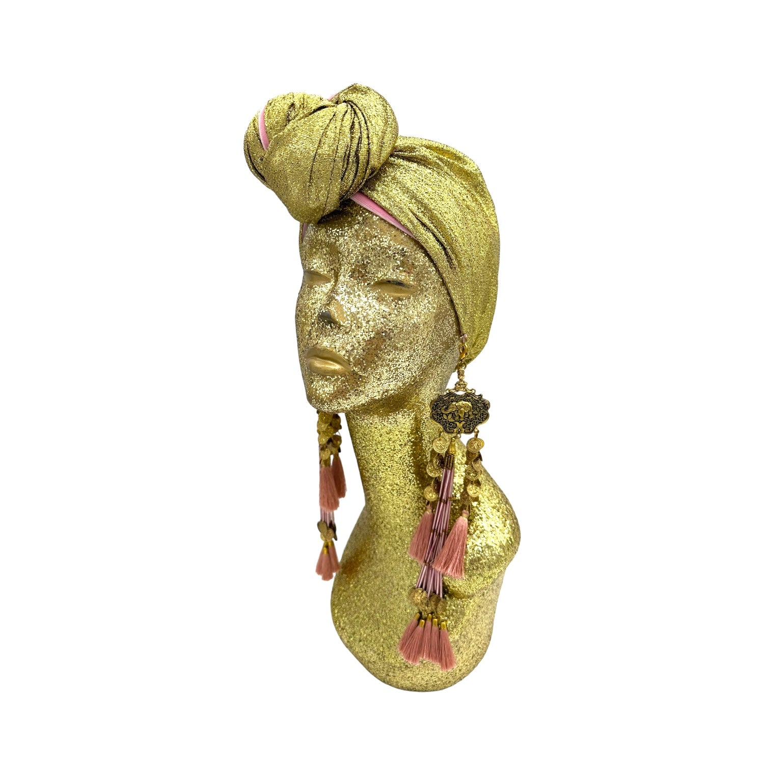The icing on the cake with this glam reversible turban. wear it full gold glitz or with the soft velour. The tassels are removable and can be worn with our other tassel styles. The tassels are made by artisans in India and turbans with love in Los Angeles.