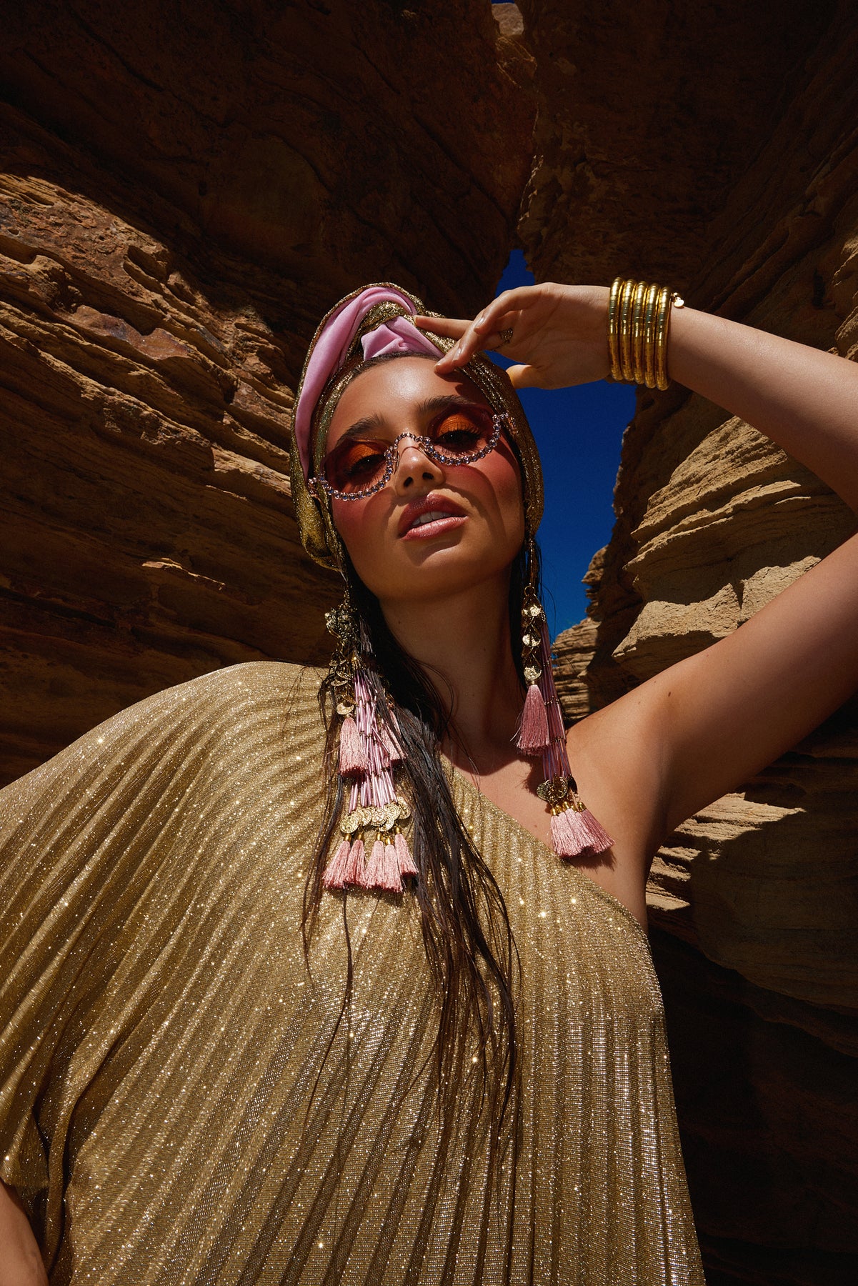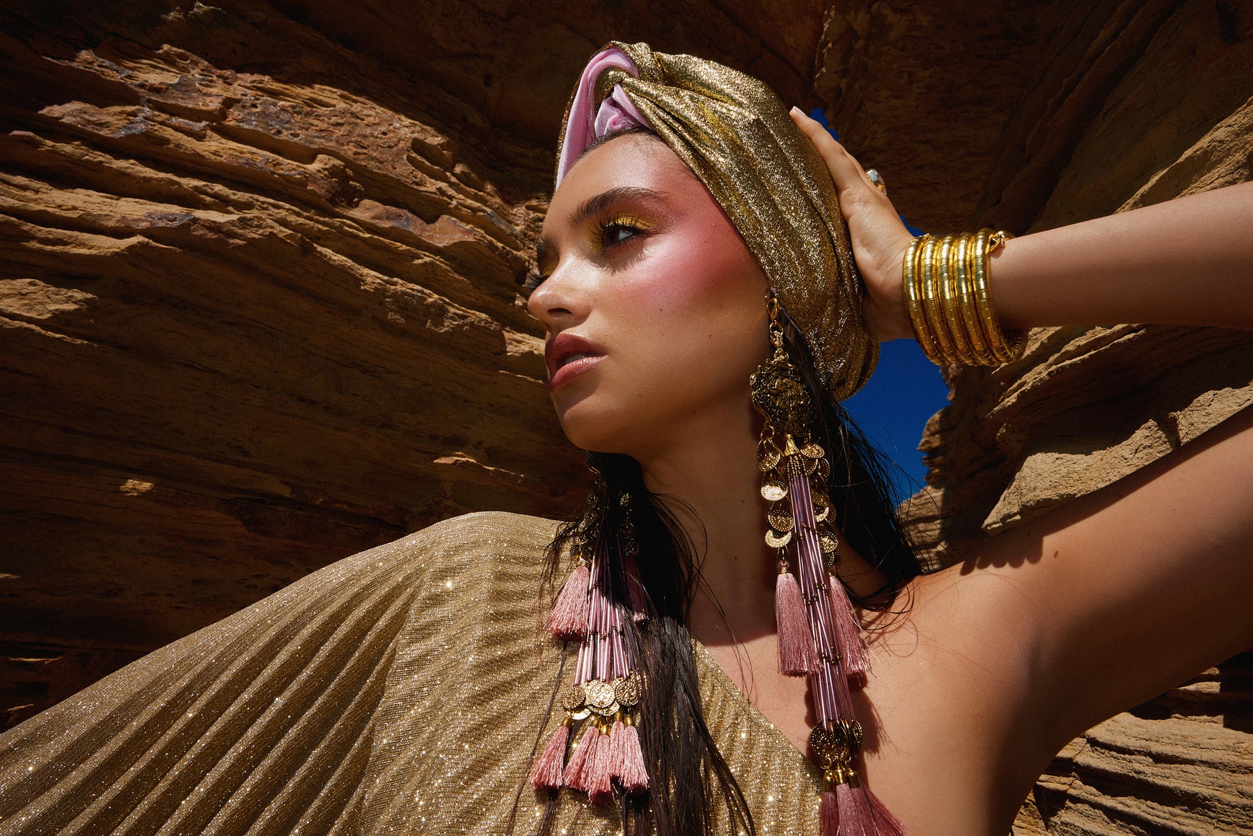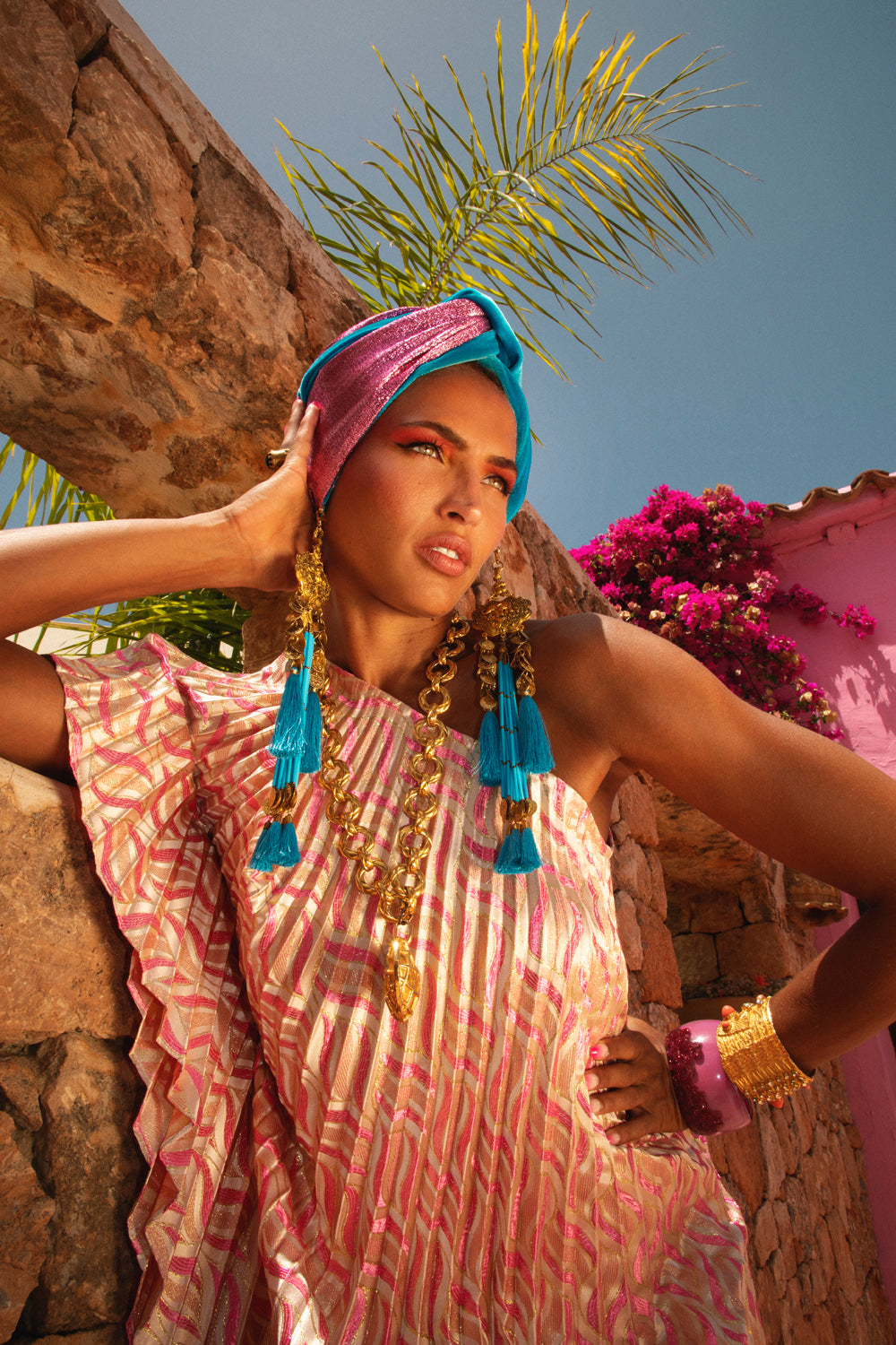The Gloria Ruby Jumpsuit is just HOT! I matched this outfit with the Zia Golden Copper Dorado Turban and golden tassels and gold jewellery. I felt like a movie star, which I think we all feel like when wearing a JC design.