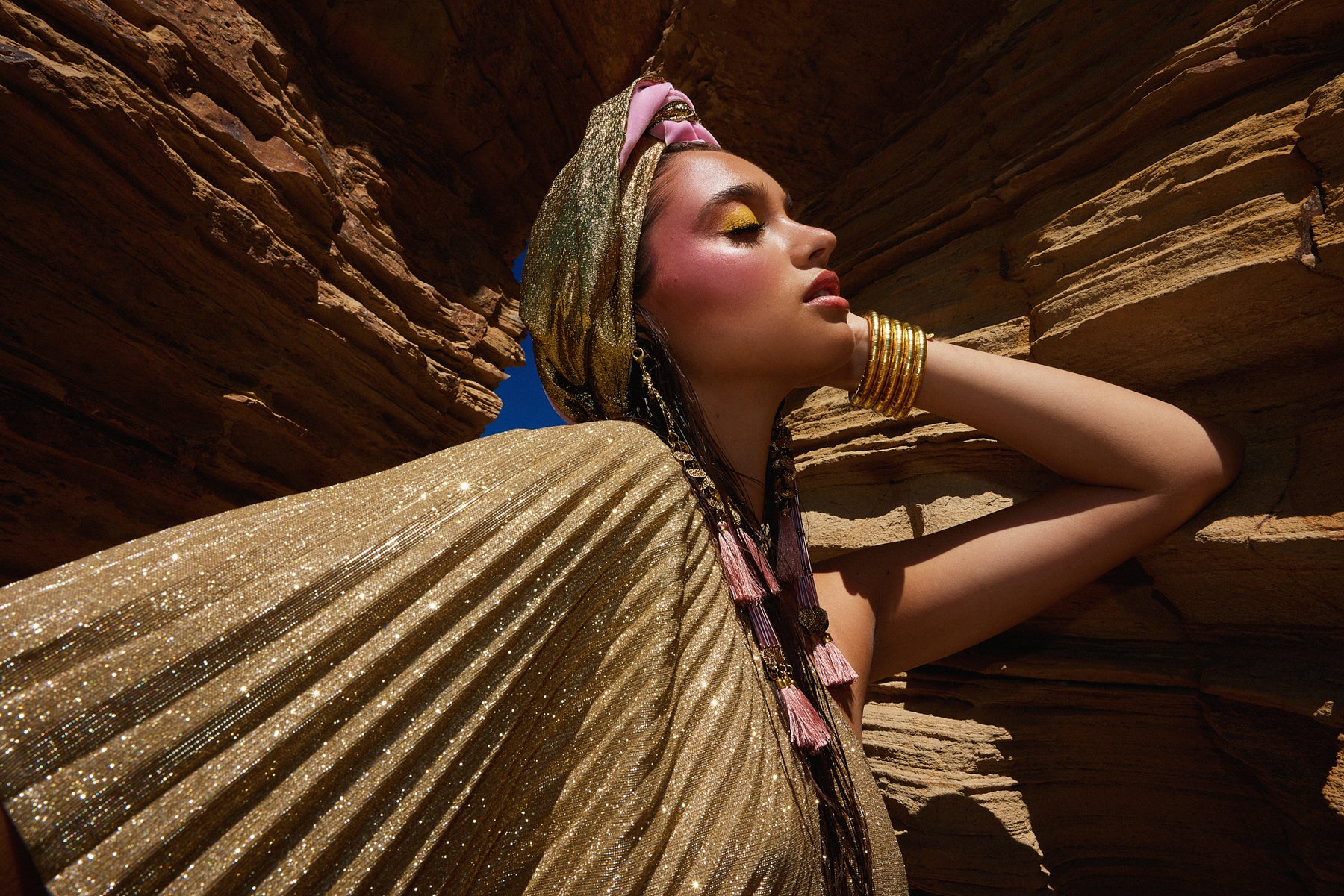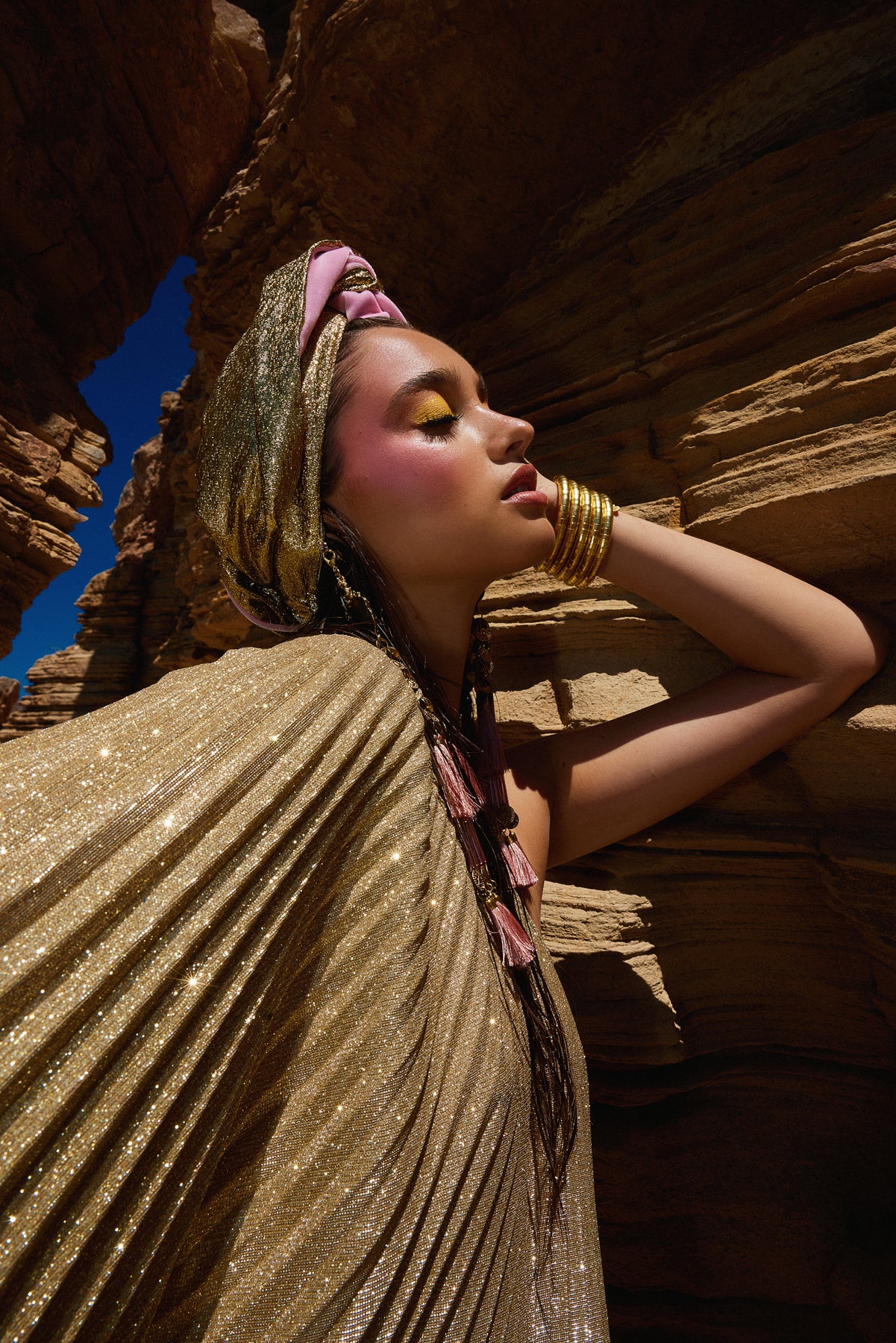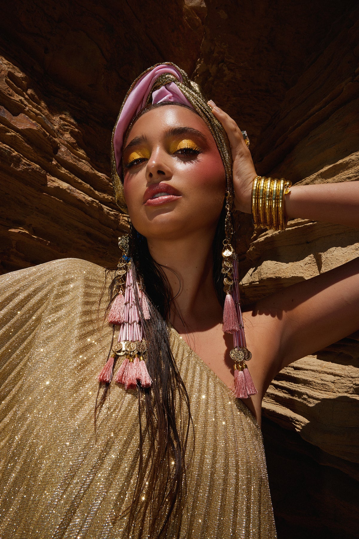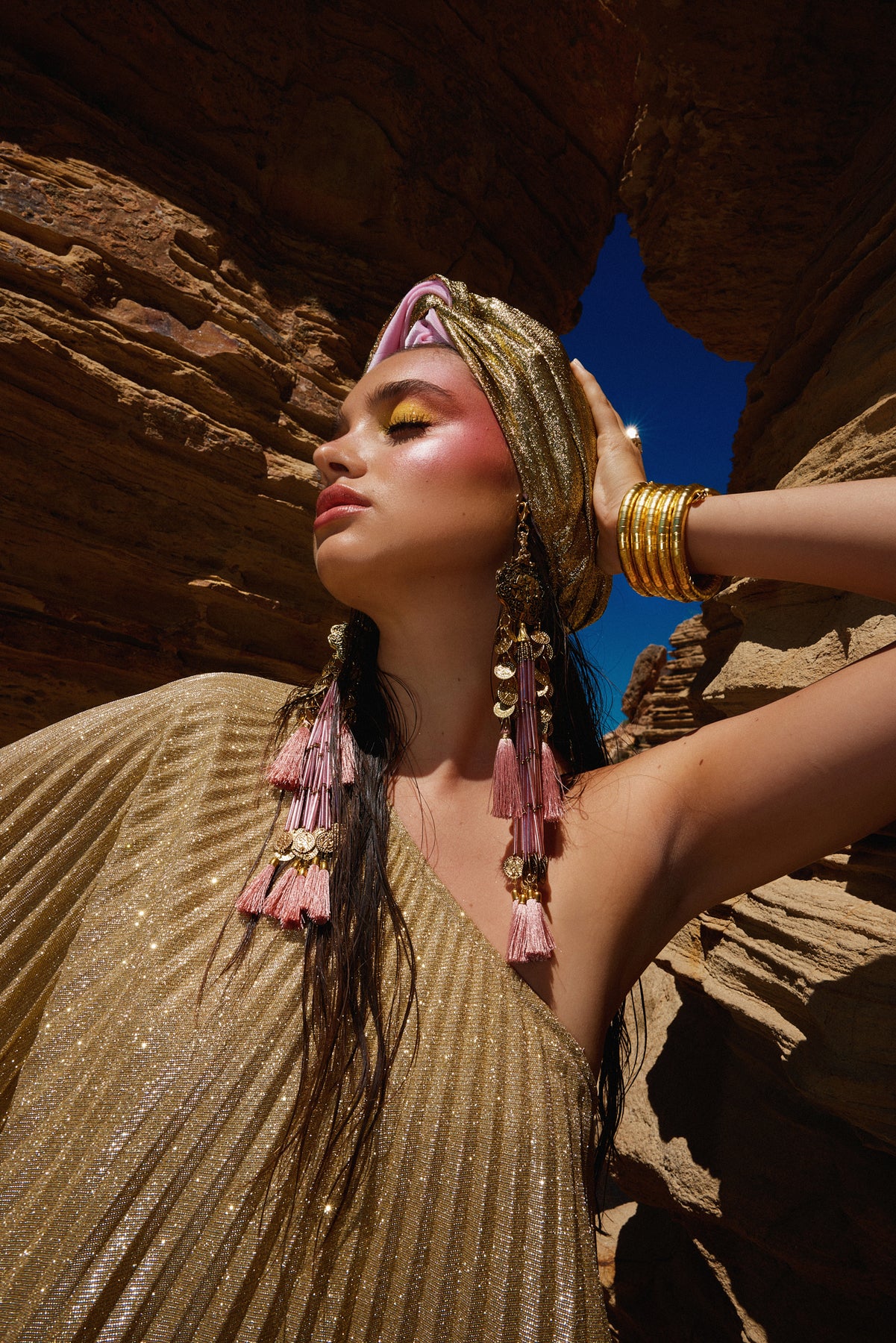 The Gloria Ruby Jumpsuit is just HOT! I matched this outfit with the Zia Golden Copper Dorado Turban and golden tassels and gold jewellery. I felt like a movie star, which I think we all feel like when wearing a JC design.